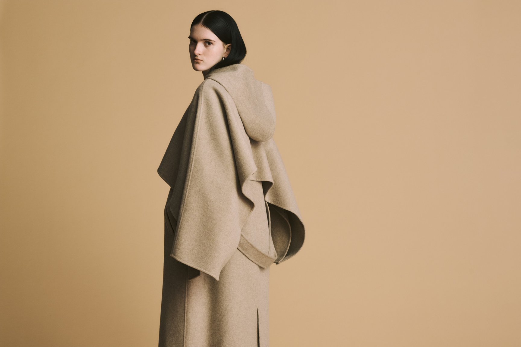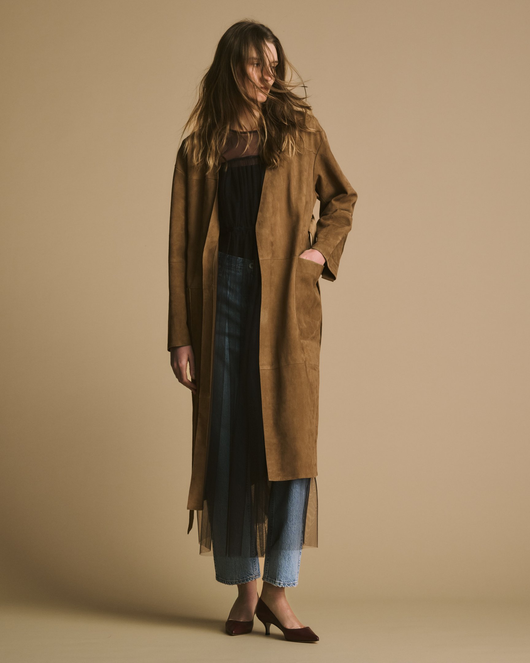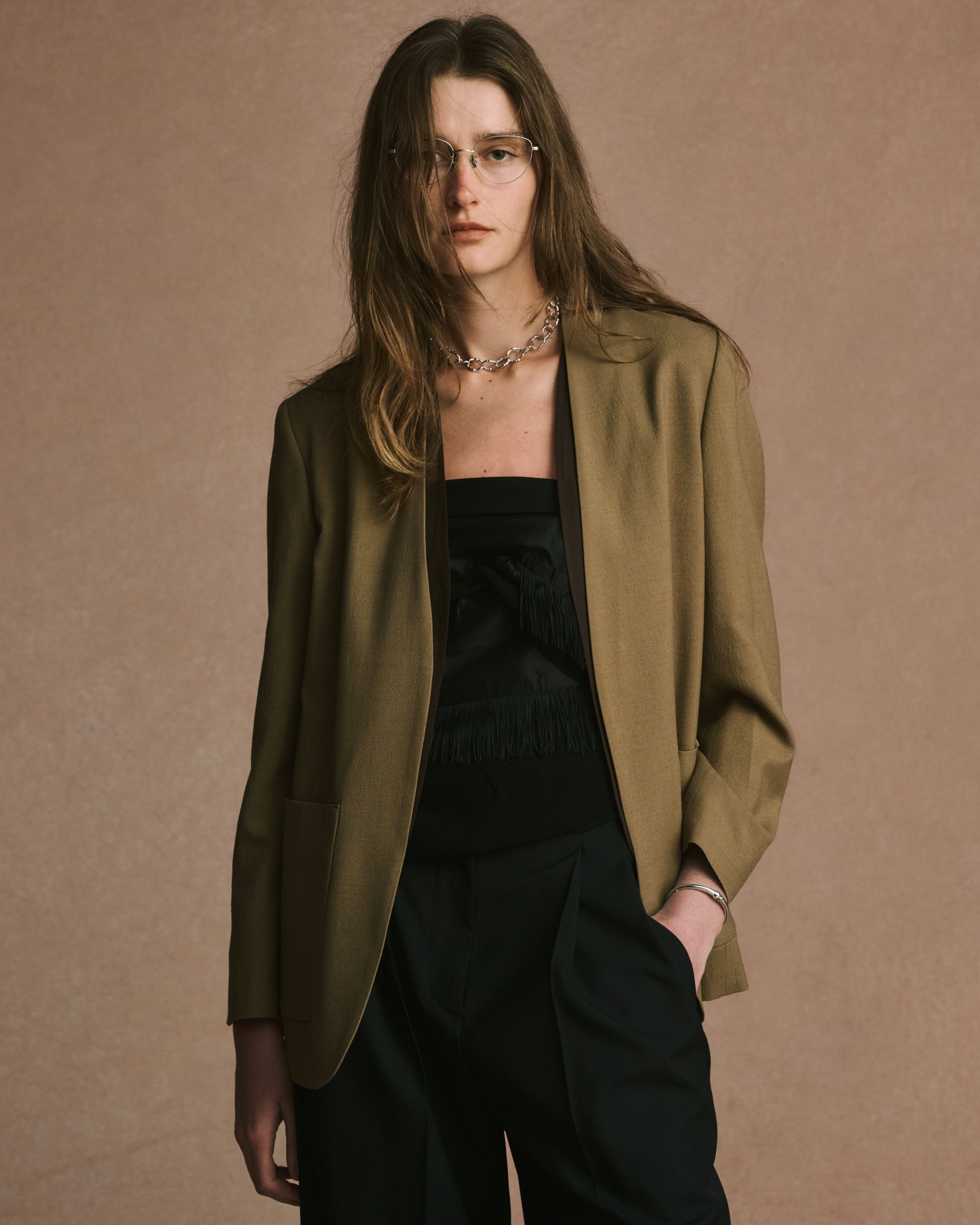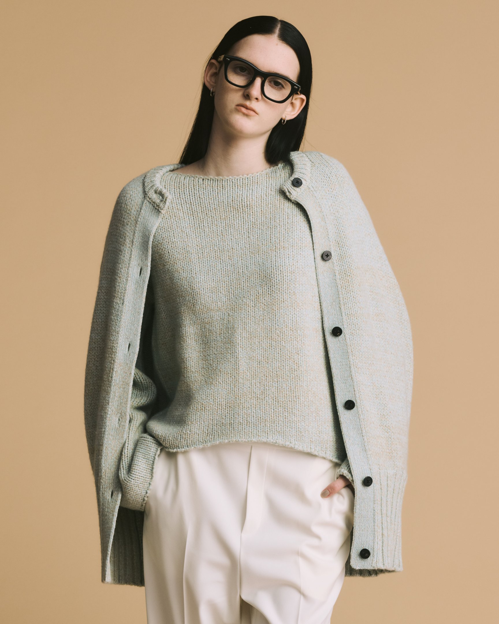 ファーストコレクションでは、アウターからシャツ、ニット、パンツ、スカート、ワンピース、ジュエリーまで、ブランドの女性像を体現する計70型のアイテムをラインナップ。代表的なアイテムとして、群馬県桐生市の工場で織ったオリジナル生地を用いたジャカードのベスト(3万5200)とパンツ(3万9600)のセットアップや、軽い着心地と素材のハリ感、異なるトーンの絶妙なカラーコンビネーションにこだわったダブルフェイスのロングコート(7万9200)、色味からいち早く秋冬のムードを楽しめる、程よいシアー感のシルクコットンシャツ(1万9800)、大人の女性が美しく着られるシルエットや素材感を追求したカーゴパンツ(3万5200/全て税込)などを揃える。