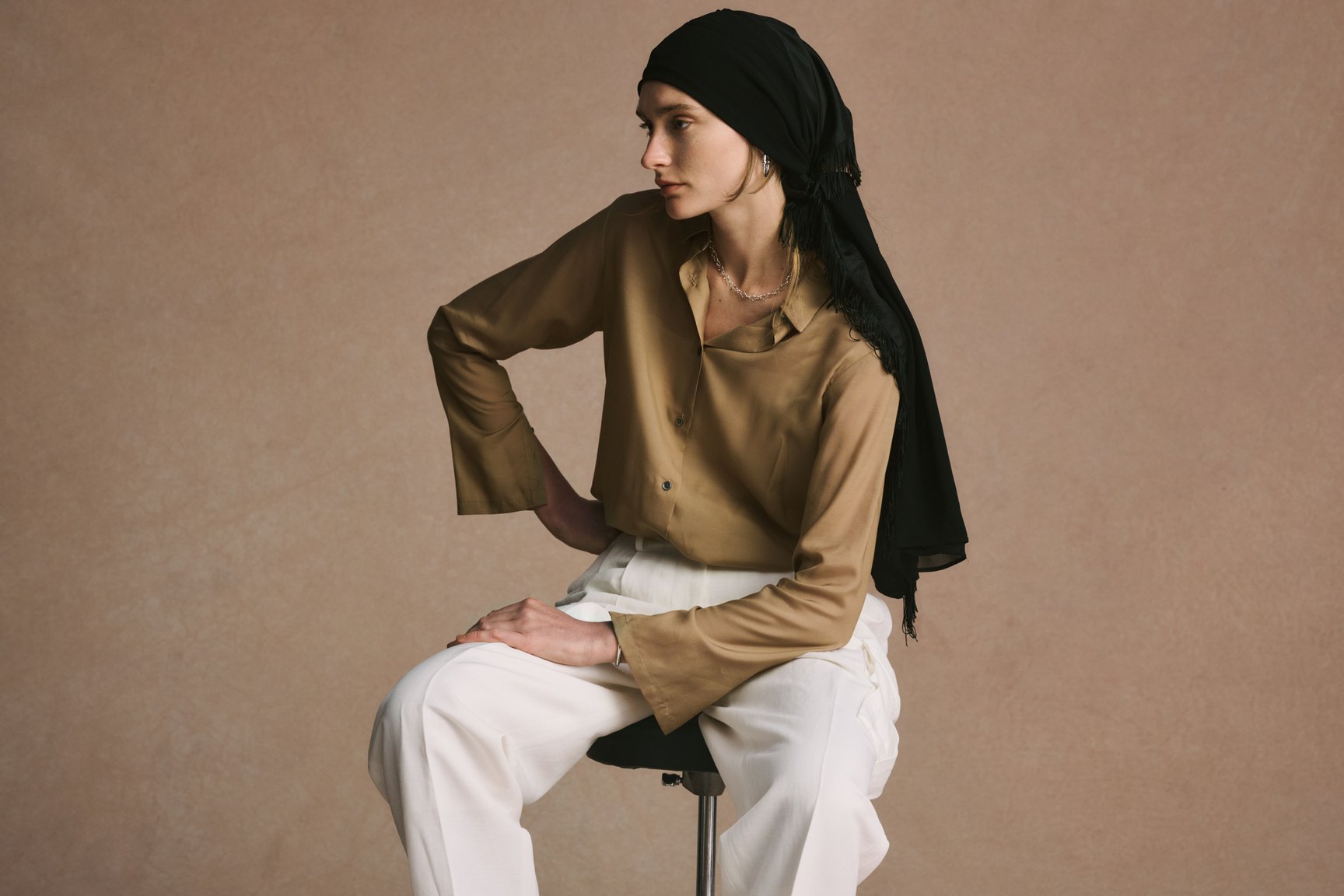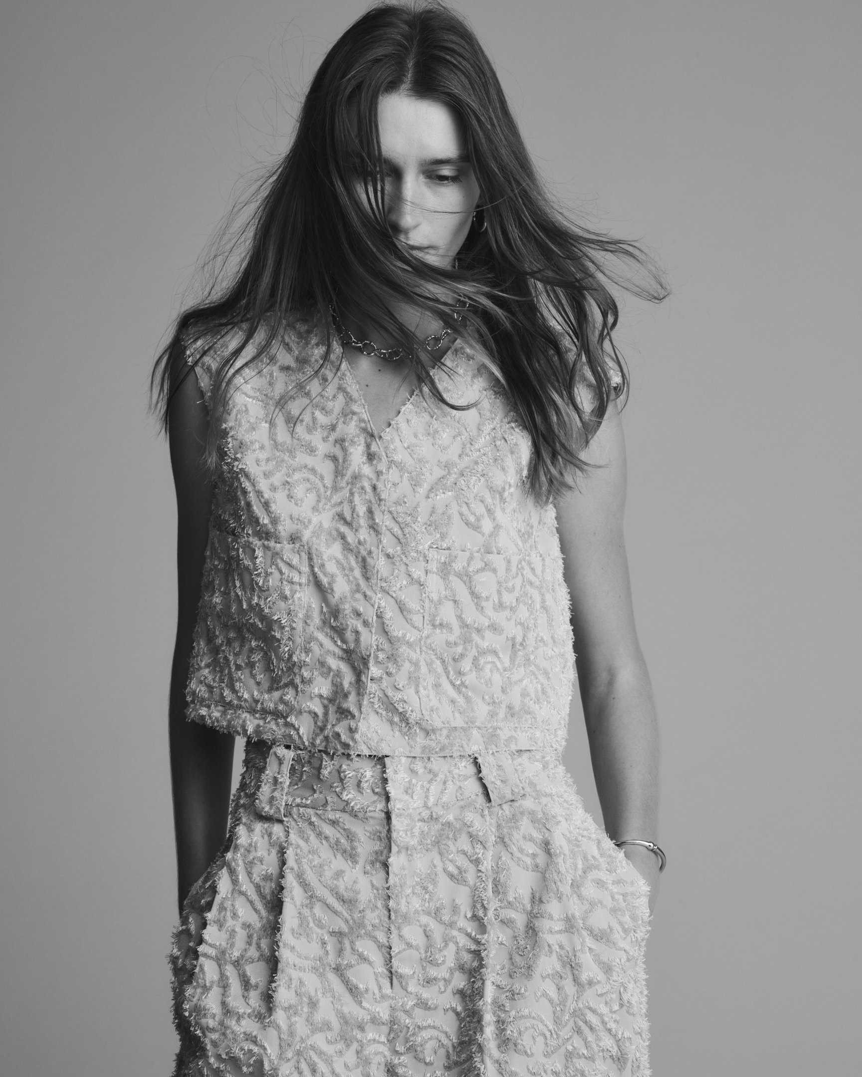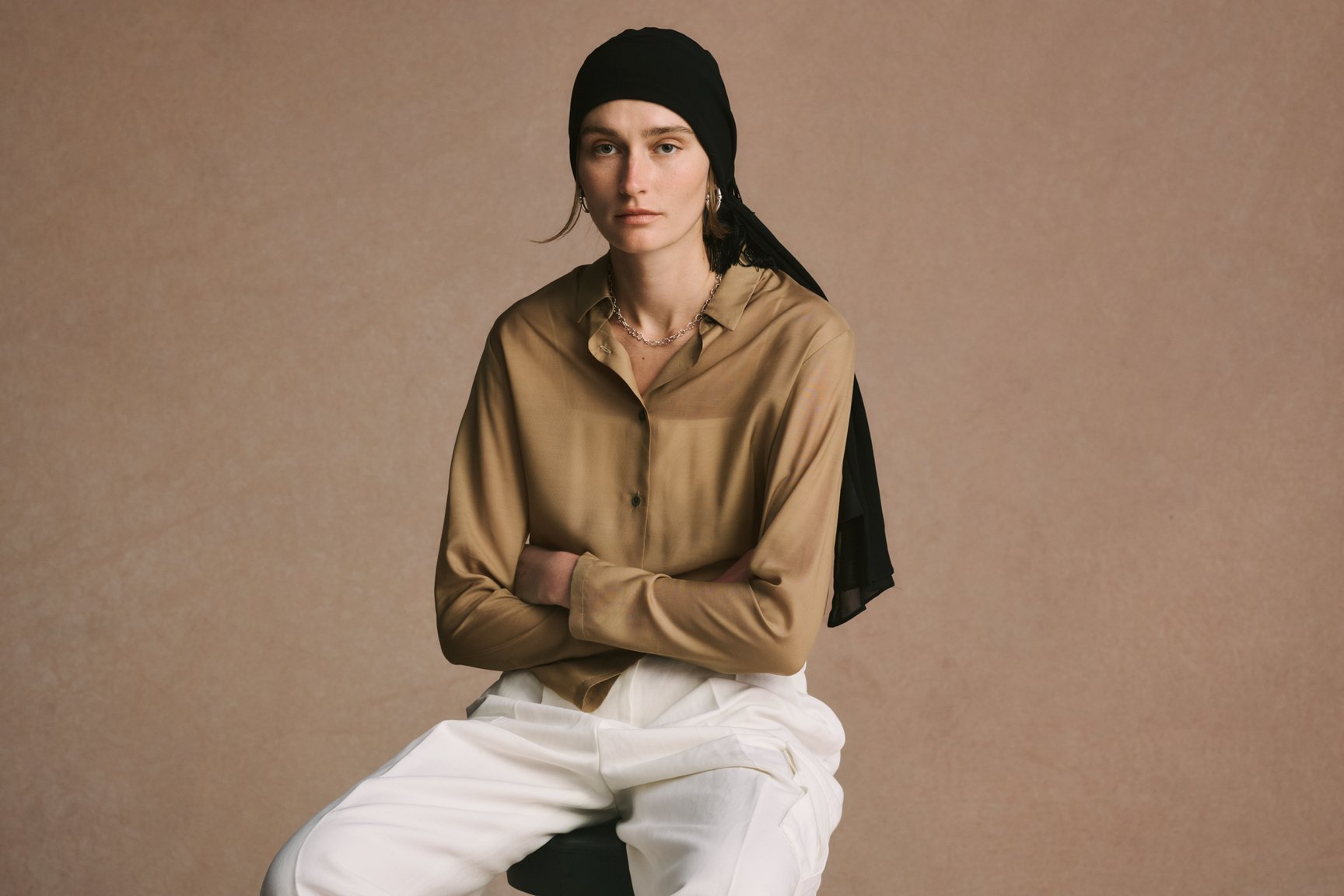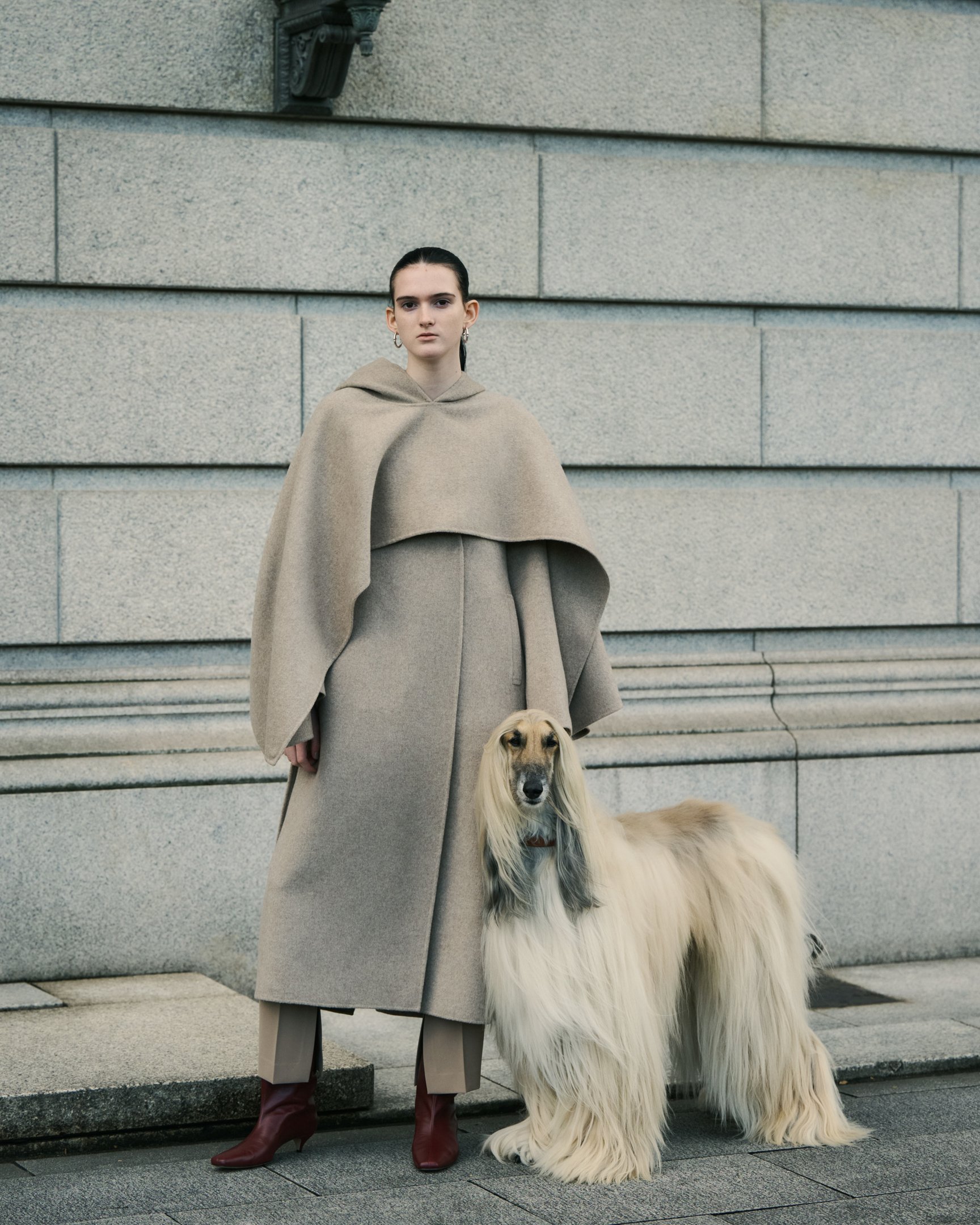 ファーストコレクションでは、アウターからシャツ、ニット、パンツ、スカート、ワンピース、ジュエリーまで、ブランドの女性像を体現する計70型のアイテムをラインナップ。代表的なアイテムとして、群馬県桐生市の工場で織ったオリジナル生地を用いたジャカードのベスト(3万5200)とパンツ(3万9600)のセットアップや、軽い着心地と素材のハリ感、異なるトーンの絶妙なカラーコンビネーションにこだわったダブルフェイスのロングコート(7万9200)、色味からいち早く秋冬のムードを楽しめる、程よいシアー感のシルクコットンシャツ(1万9800)、大人の女性が美しく着られるシルエットや素材感を追求したカーゴパンツ(3万5200/全て税込)などを揃える。