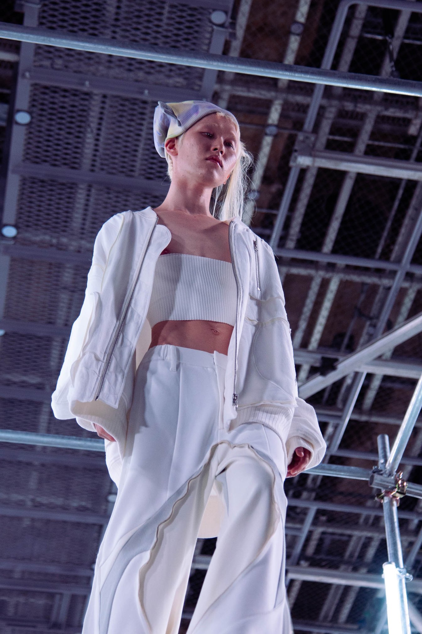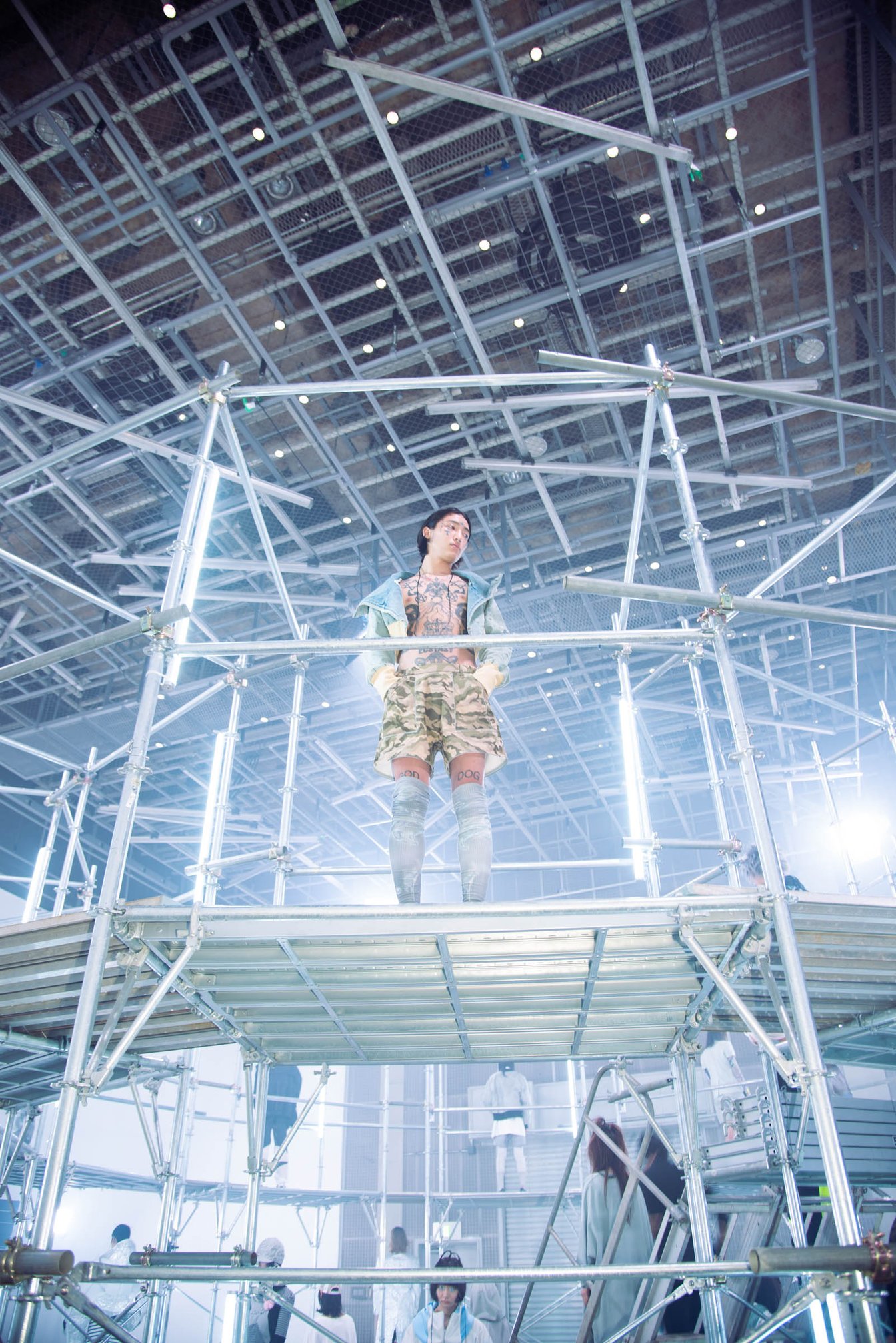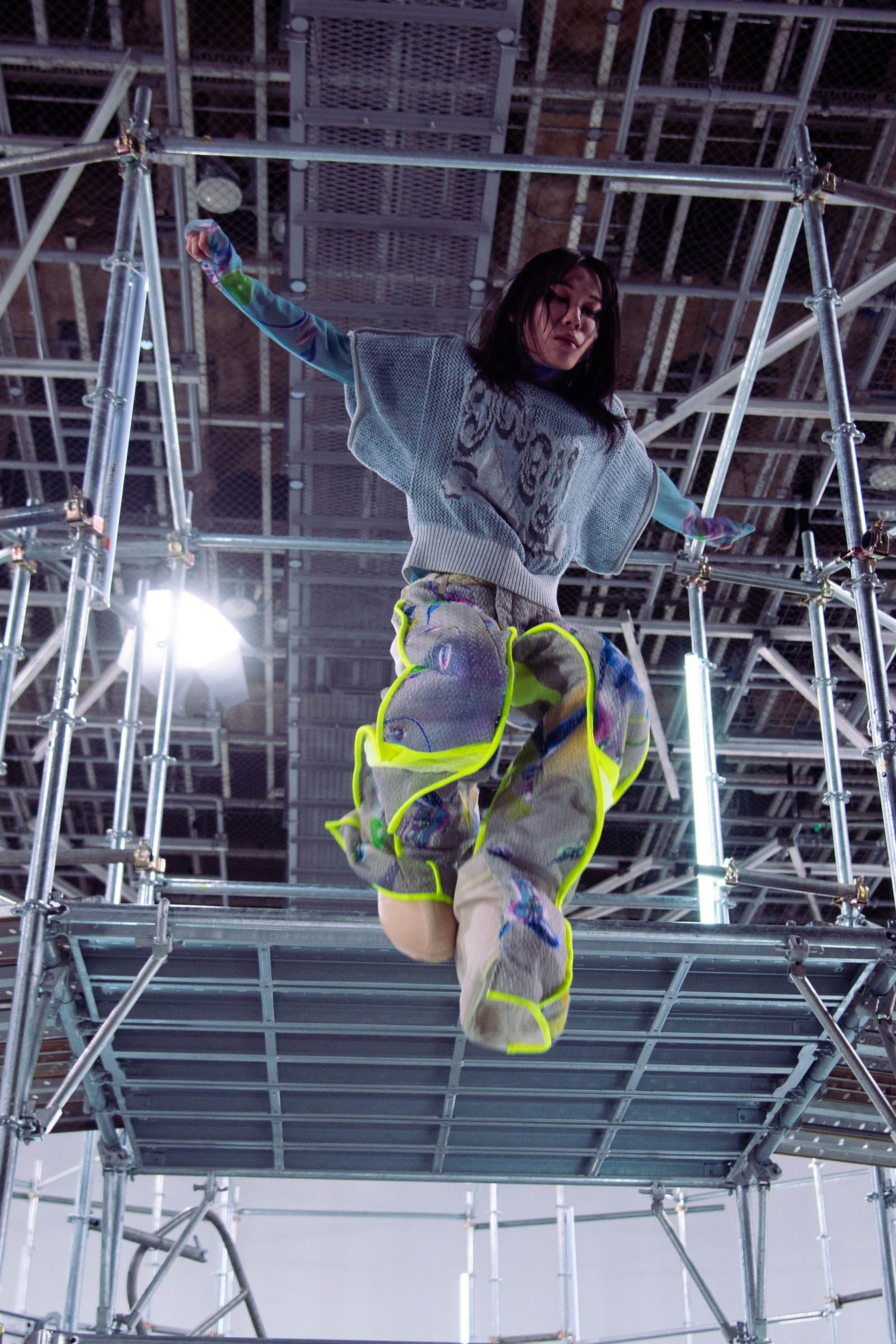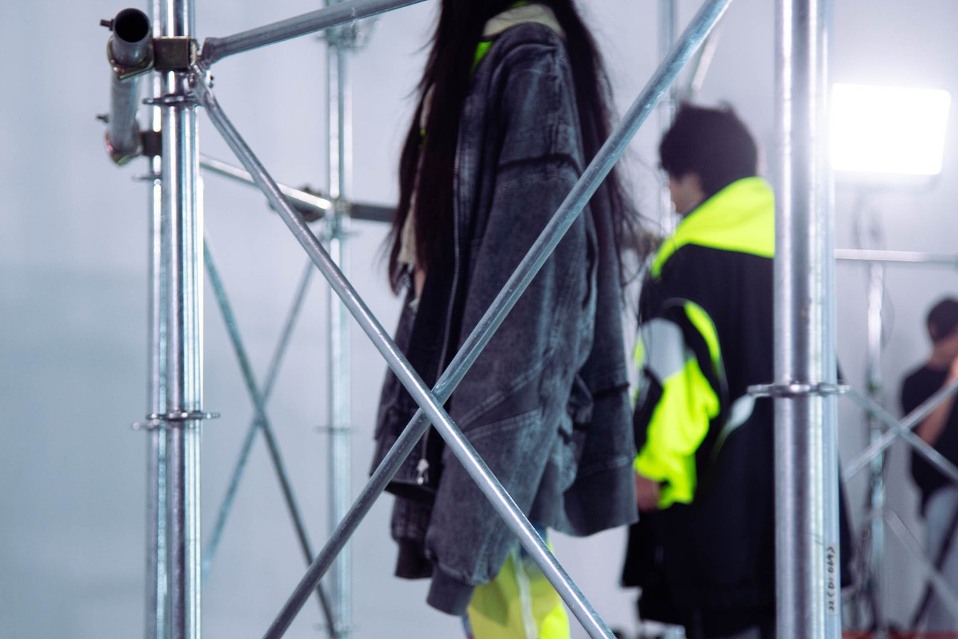 前情報があった上で本コレクションに戻ると、会場は鉄パイプで作られた二階構造。形のランウェイをモデルが上下に交差し、観客の間近でモデルが飛び込むという危険性を帯びた緊張感が漂っていた。モデルは寝癖頭で着崩したスタイリング、浮かない表情のまま階段を登り、躊躇いもなく「飛び降りる」よりも「飛び降りちゃった」という少しシリアスな空気感を醸し出していた。浮かない表情、飛び降りる行動で私はトー横界隈で起きているオーバードーズや飛び降り事件とシンクロするパフォーマンスだと感じ取った。また会場とリンクしたテーマ「circle」から「飛び降りる=脱却」と解釈するならば、ポジティブな側面だとより良い環境に変えるための脱却、ネガティブな側面はこの世を去る。どちらにしても、現状から抜け出したい人の「救い」となるような服を提案しているようにも伺える。ブランドのアイコニックなグレーカラーと、いつも以上に鮮やかな生地やグラフィック、それと対象的な迷彩柄やボーダーなど普遍的な生地を混ぜている点においても、着る人の生活空間に入り込みやすいようあえて情報量を多くし、さまざまな事情で脱却または逸脱したいと考えている若者への受け皿を作っているように感じとった。