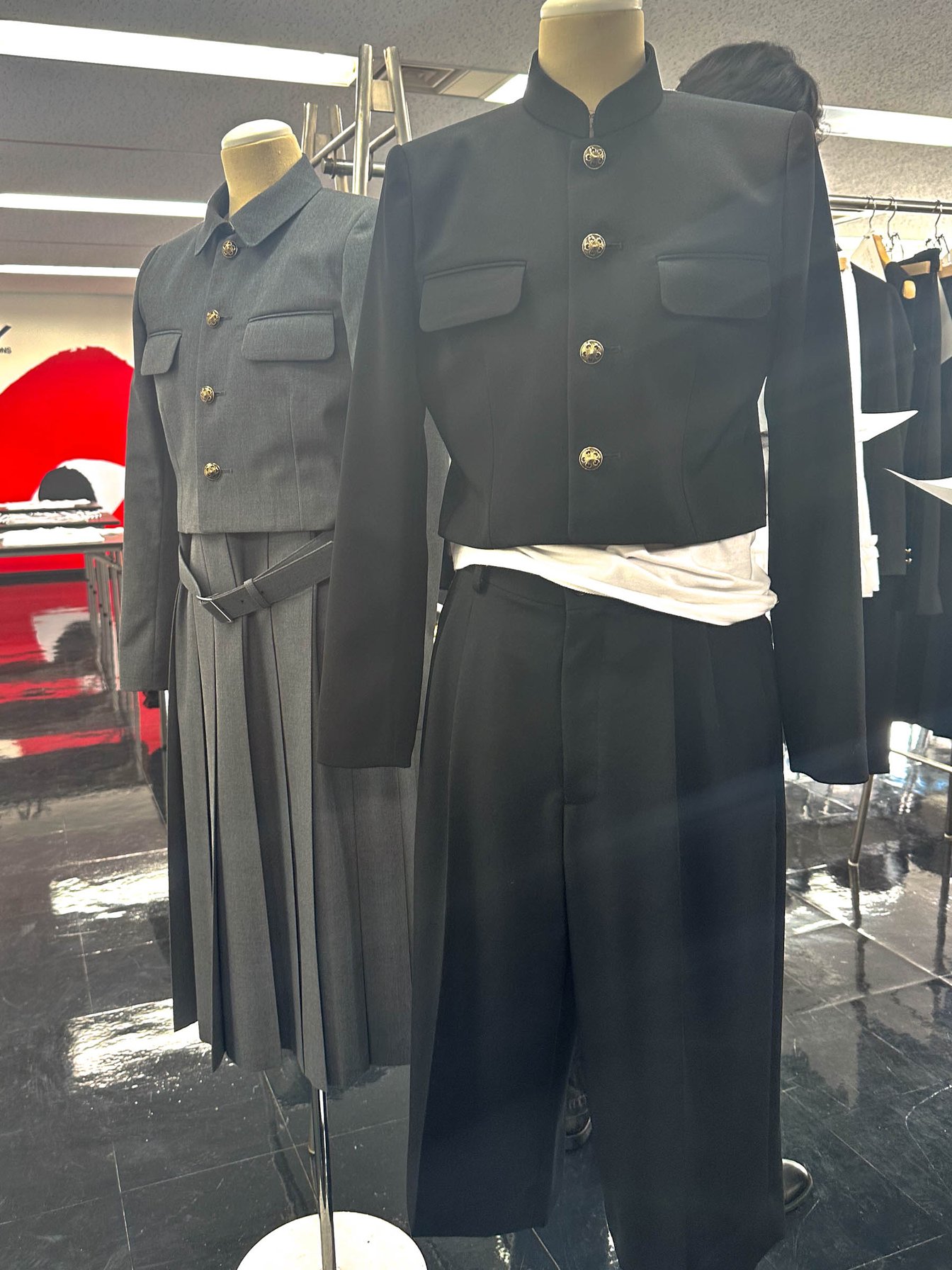 このほか、先シーズンに発表した“上履き”風シューズに続き、今シーズンは“学ラン”風ジャケットが登場。これらの新作アイテムが発表された2025年春夏シーズンの展示会会場では、インナーシャツを無造作に出し、七分丈パンツと組み合わせた学生服風のスタイリングで提案された。