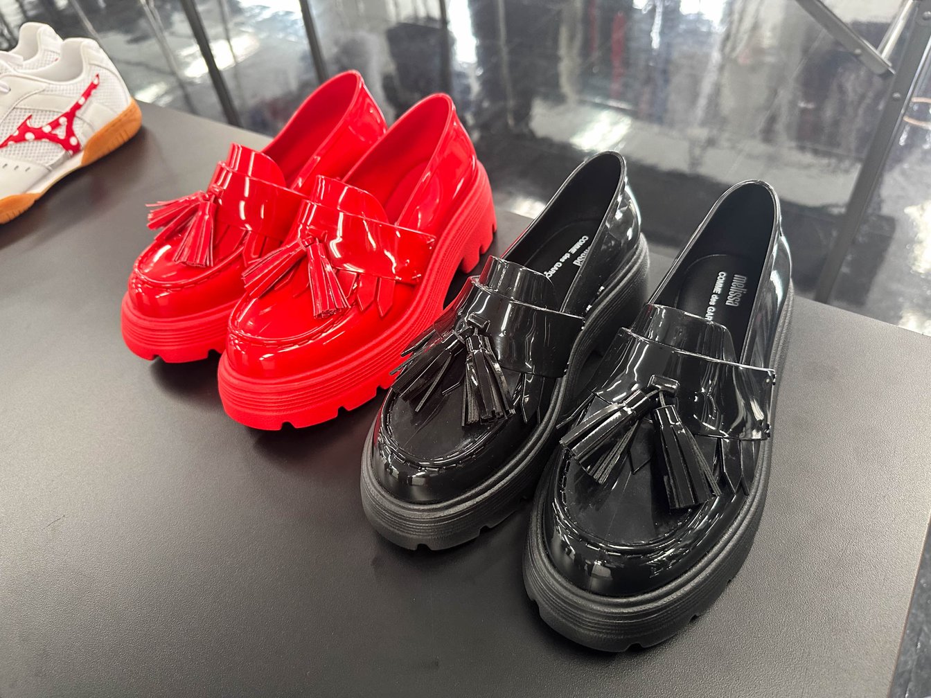 メリッサとのコラボシューズとして、アッパーにメリッサのオリジナルメルフレックス素材を採用した厚底ラバーソールのタッセルローファーを発表。ブラックとレッドの2色展開で、価格は3万3000。