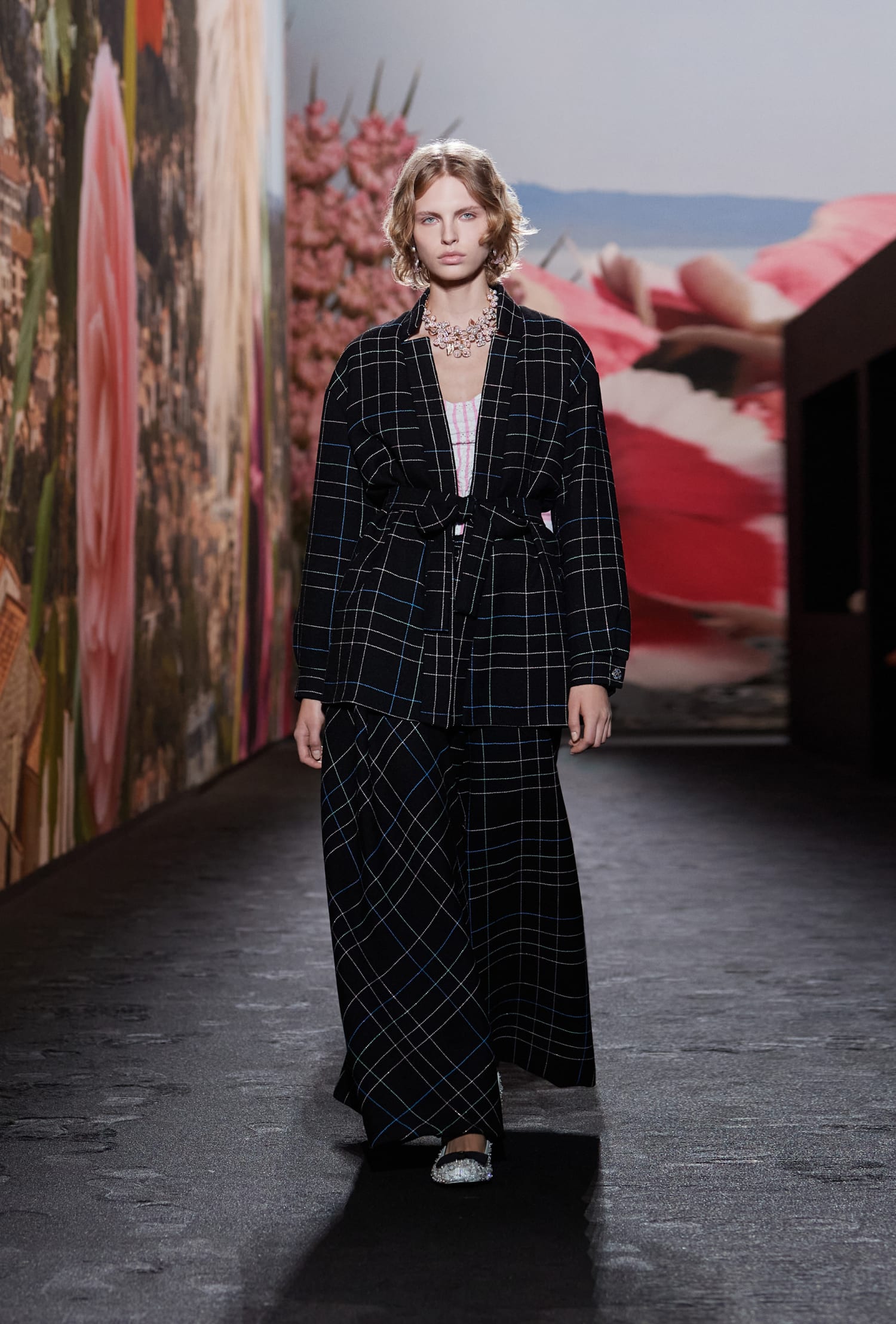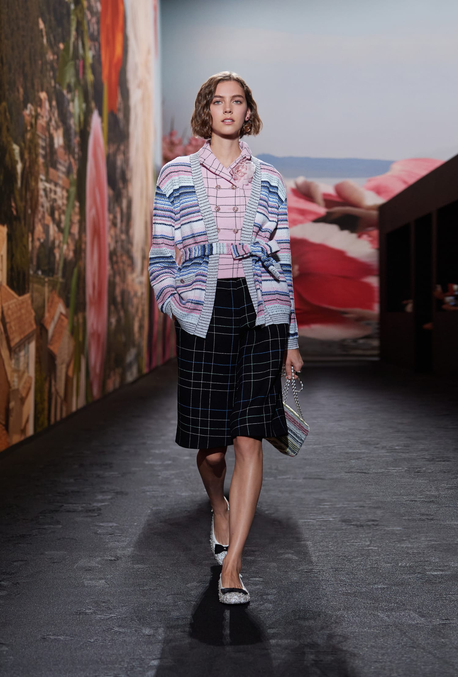 ロバート・マレット=スティーブンス(Robert Mallet-Stevens)によって設計されたこの建築は、今年着工100周年を迎える。丘の上にあるモダニズム様式のヴィラは牧歌的な雰囲気に満ちており、ガブリエル・シャネル(Gabrielle Chanel)と親交のあったアーティストたちが集う場所でもあったという。ショー会場には、南仏の入江と花のイメージがスクリーンに映し出され、ヴィラの庭園が持つ幾何学模様がパッチワーク、チェック柄、ストライプといったデザインに取り入れられた。