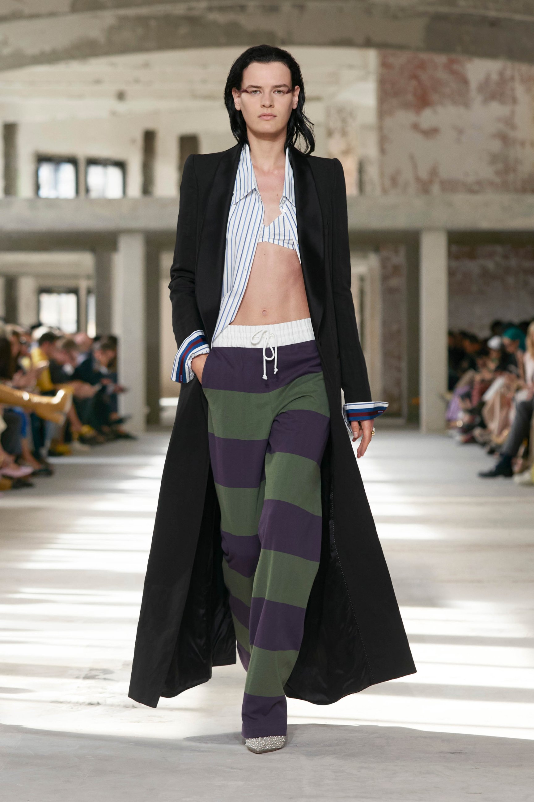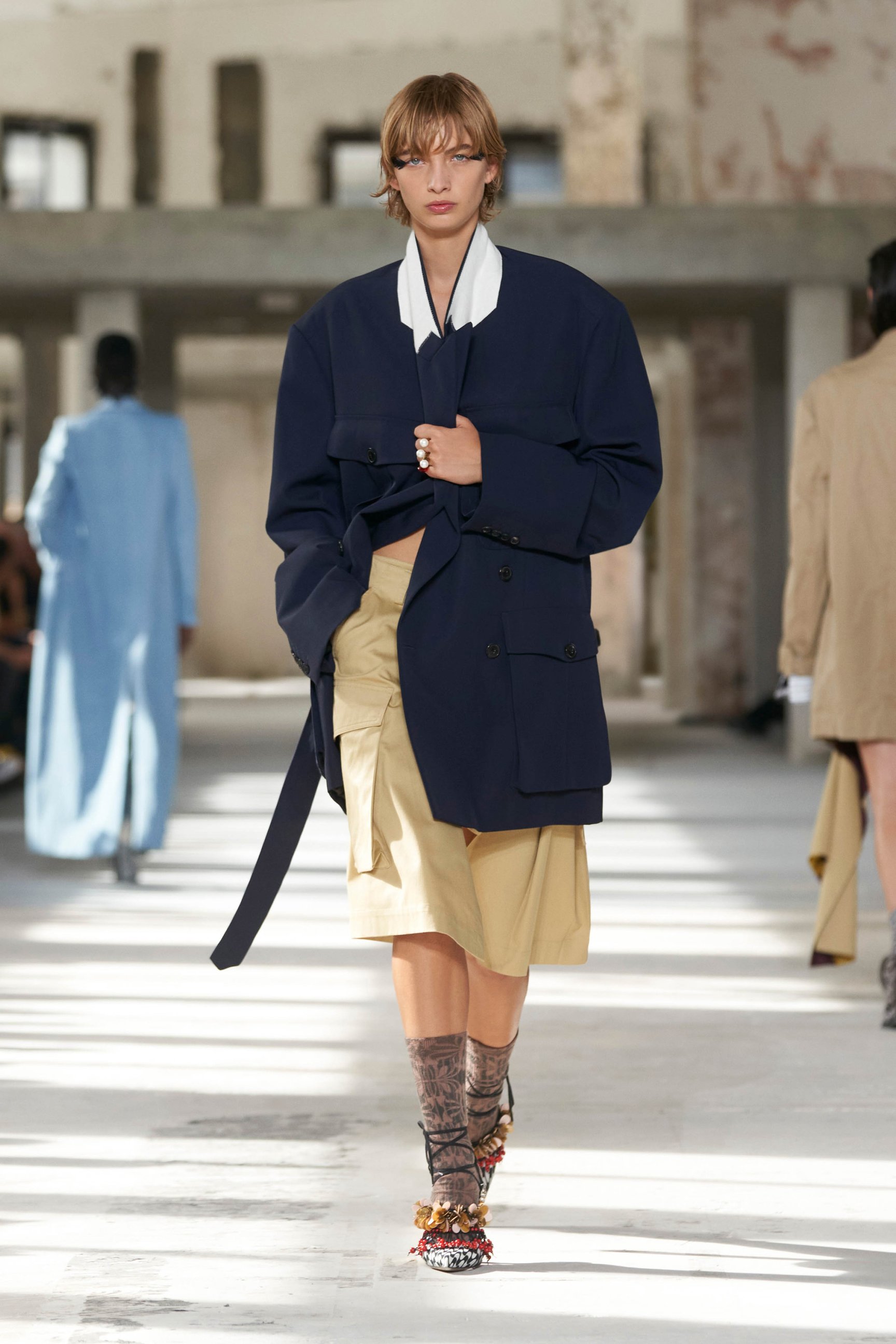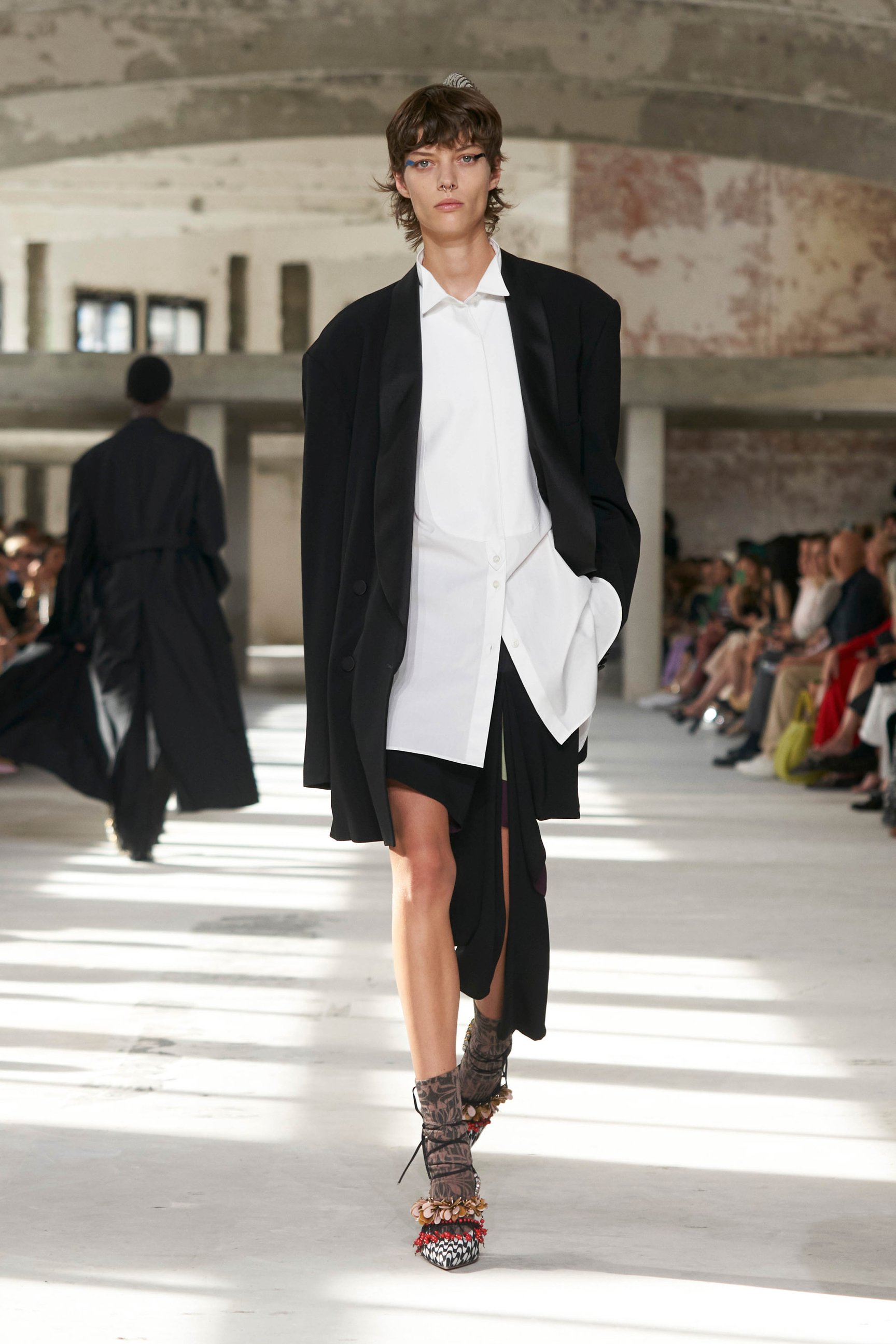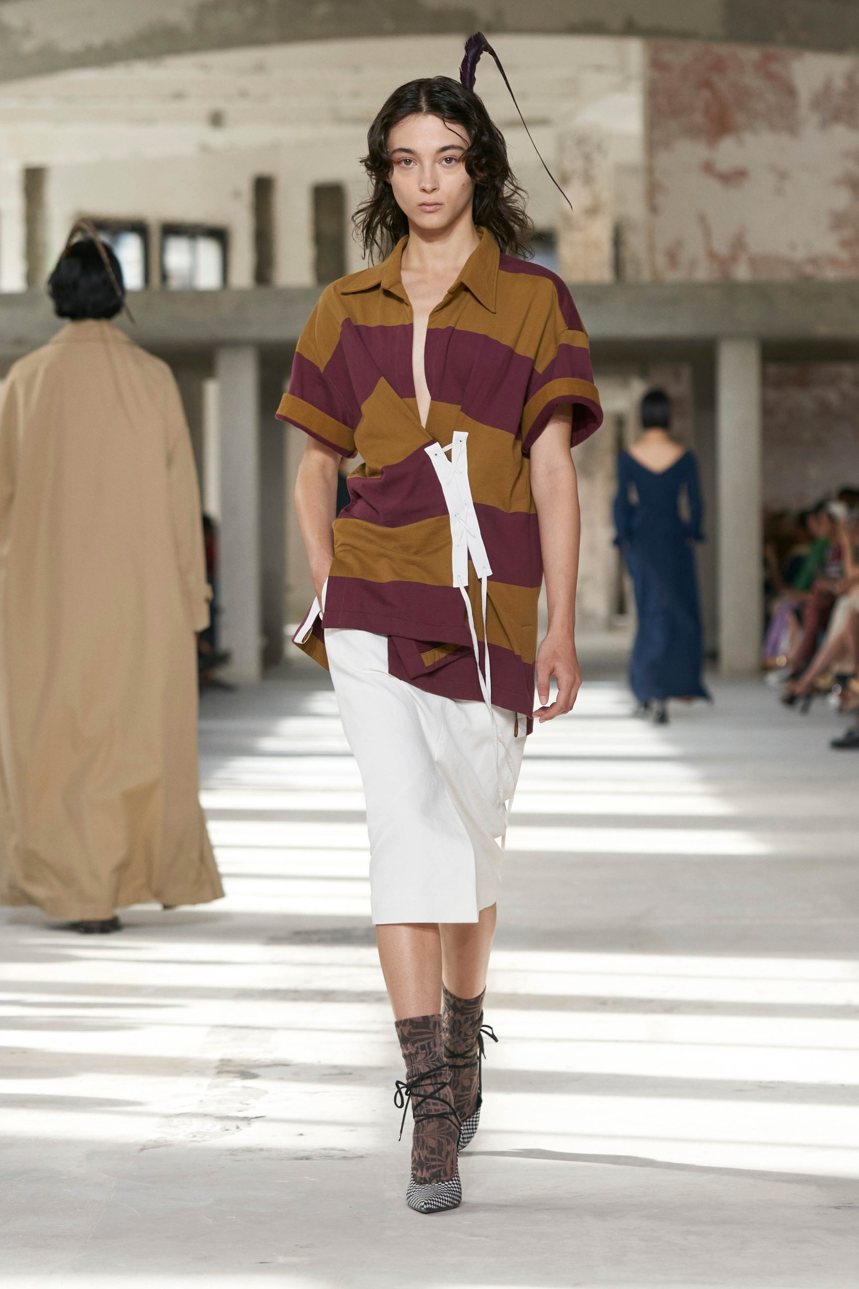 ショーのティザー映像では、一枚の鳥の羽が軽やかに宙を舞う様が公開された。廃墟風の会場に現れたモデルたちは髪に長い羽を差し、目尻にもアイライン代わりに羽を付けている。どこかファンタジックで洗練されたムードはドリスならではだ。コレクションでまず目を引いたのは、スポーツウェアのコード。ラガーシャツや、ジャージーテープのディテールなどがエレガントな装いにアレンジされている。ジャージーにブラトップとラップスカートを合わせたルックなど、意外性のあるコーディネートも登場し、見る者の固定観念を揺さぶった。