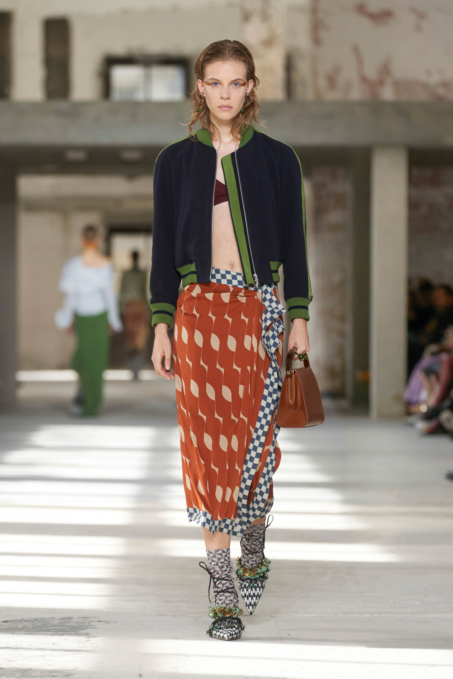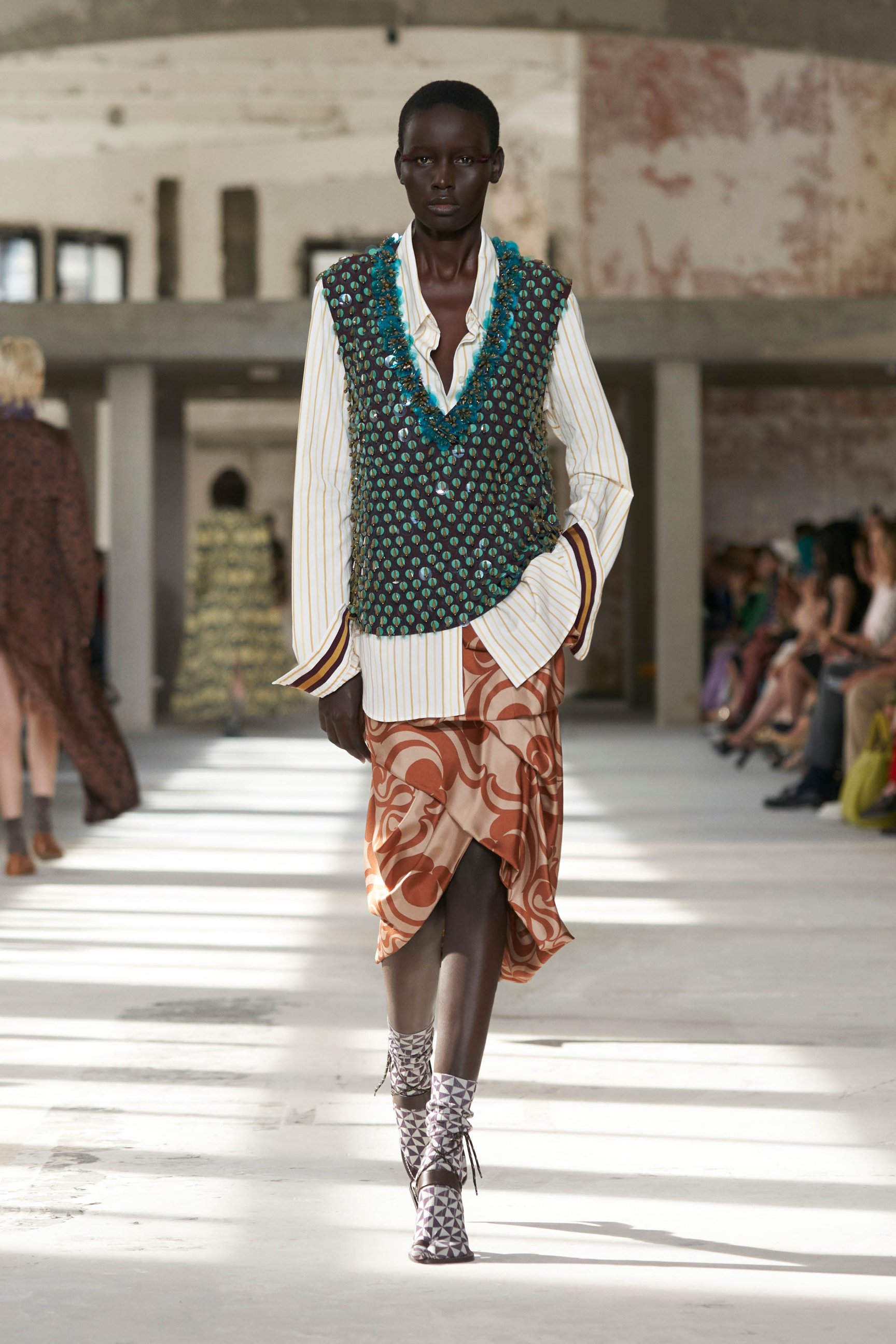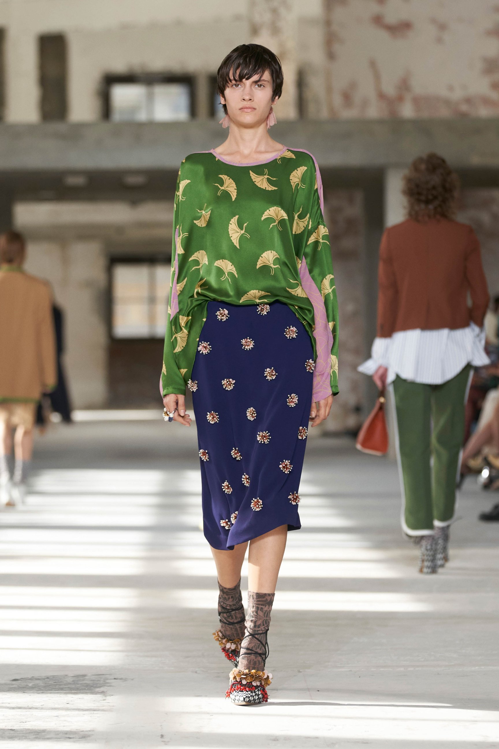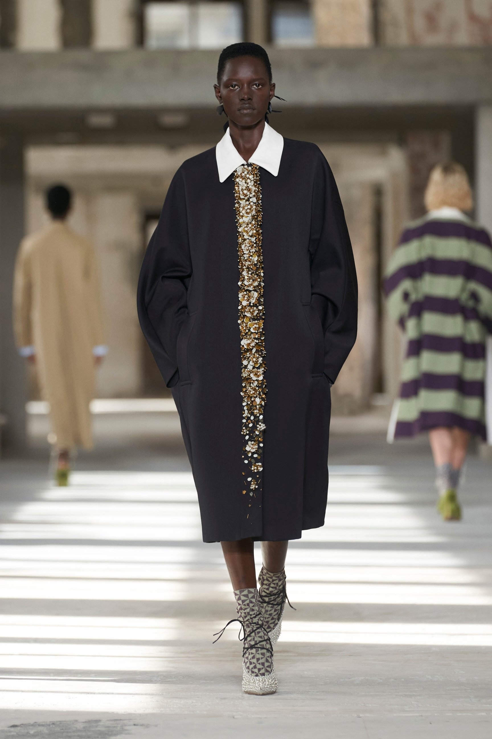 ショーのティザー映像では、一枚の鳥の羽が軽やかに宙を舞う様が公開された。廃墟風の会場に現れたモデルたちは髪に長い羽を差し、目尻にもアイライン代わりに羽を付けている。どこかファンタジックで洗練されたムードはドリスならではだ。コレクションでまず目を引いたのは、スポーツウェアのコード。ラガーシャツや、ジャージーテープのディテールなどがエレガントな装いにアレンジされている。ジャージーにブラトップとラップスカートを合わせたルックなど、意外性のあるコーディネートも登場し、見る者の固定観念を揺さぶった。
