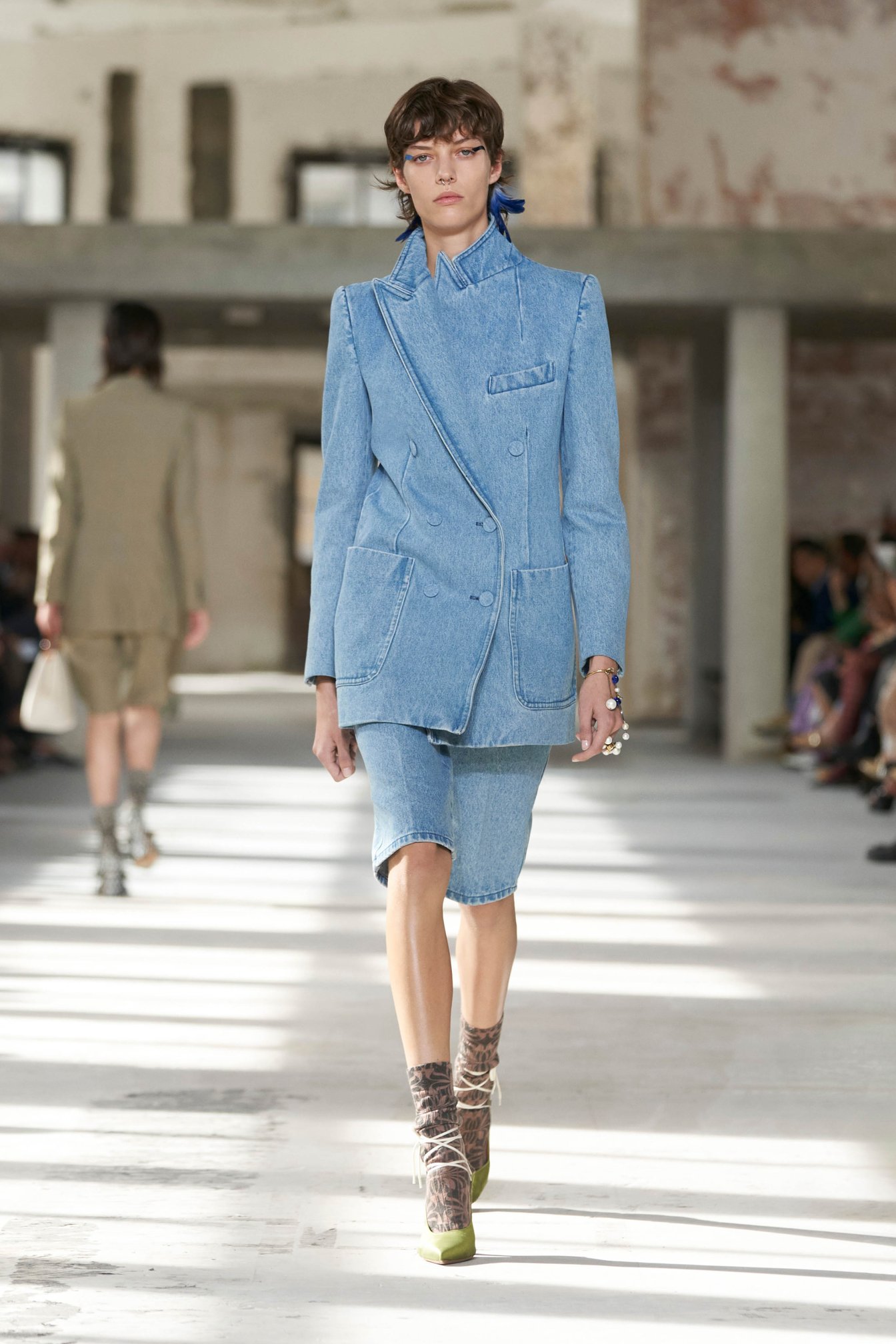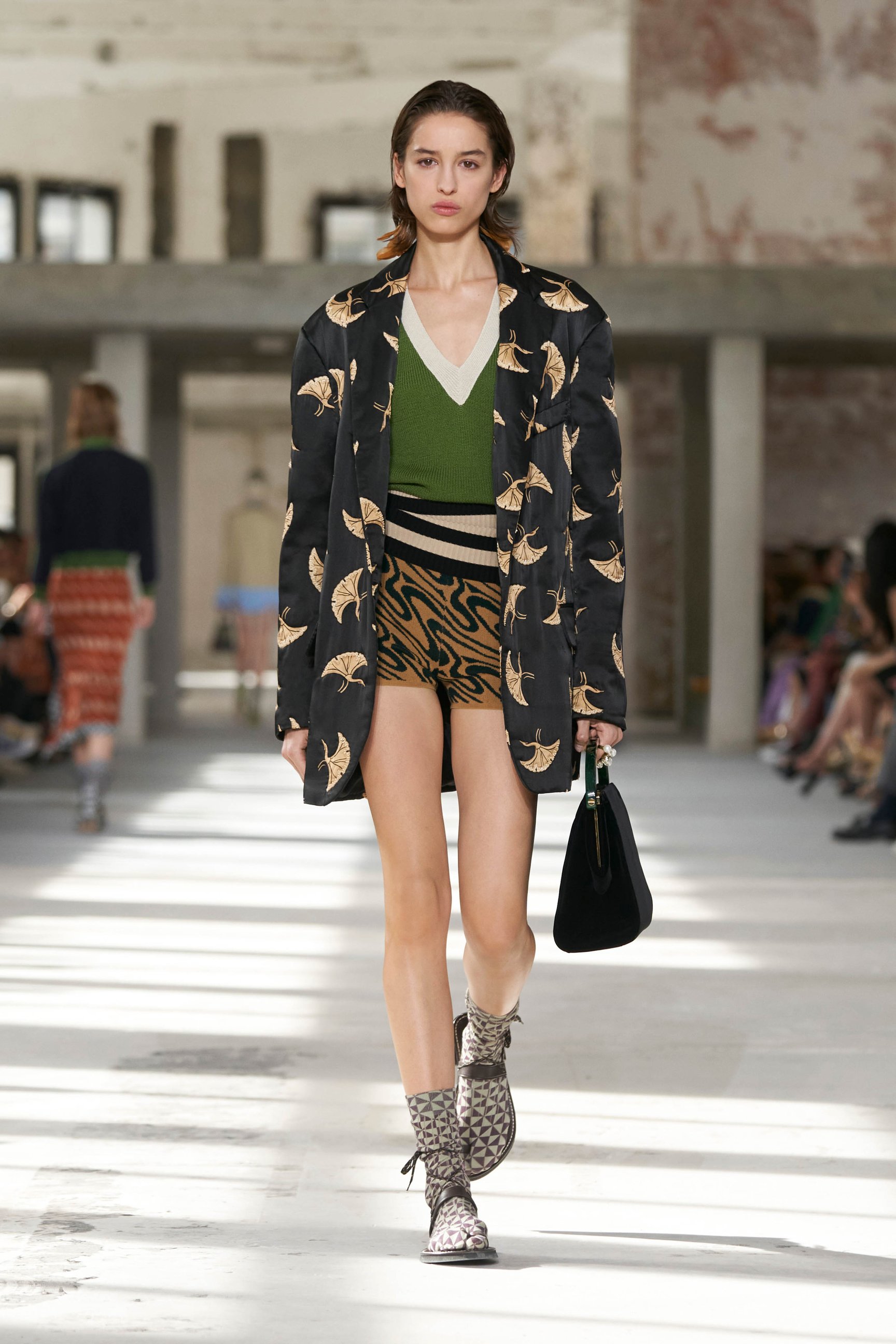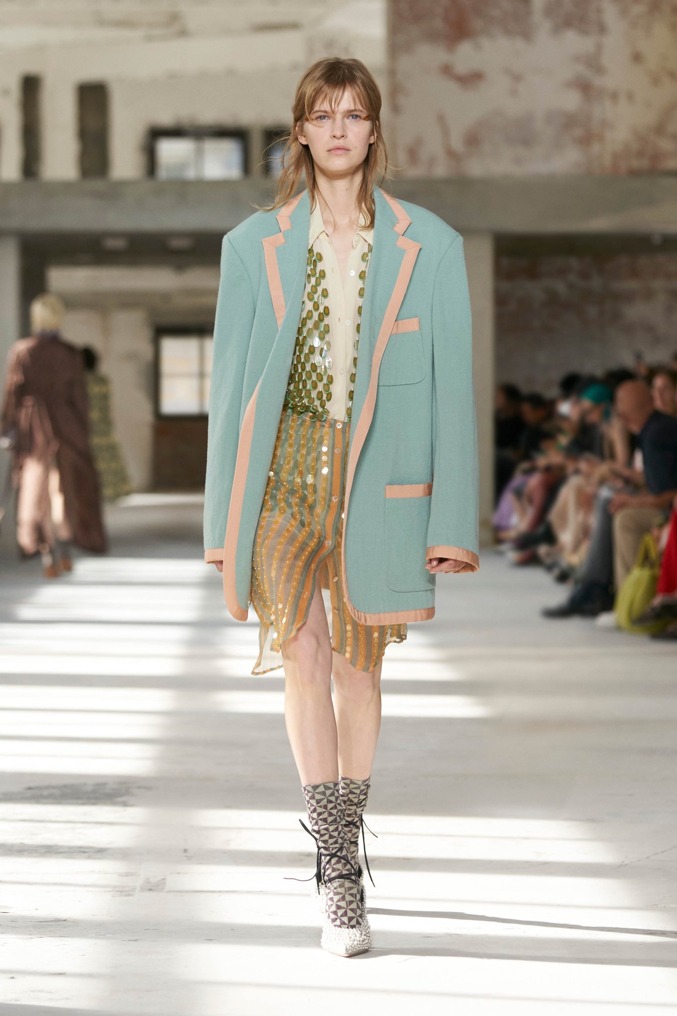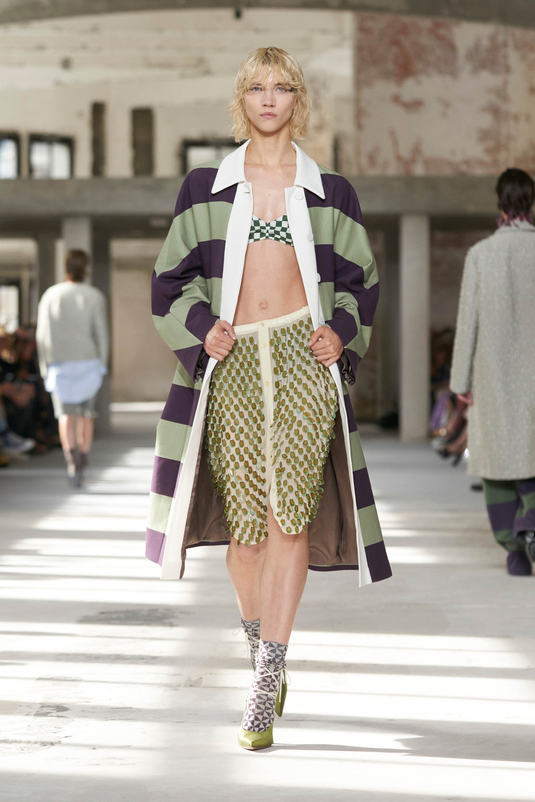 ショーのティザー映像では、一枚の鳥の羽が軽やかに宙を舞う様が公開された。廃墟風の会場に現れたモデルたちは髪に長い羽を差し、目尻にもアイライン代わりに羽を付けている。どこかファンタジックで洗練されたムードはドリスならではだ。コレクションでまず目を引いたのは、スポーツウェアのコード。ラガーシャツや、ジャージーテープのディテールなどがエレガントな装いにアレンジされている。ジャージーにブラトップとラップスカートを合わせたルックなど、意外性のあるコーディネートも登場し、見る者の固定観念を揺さぶった。