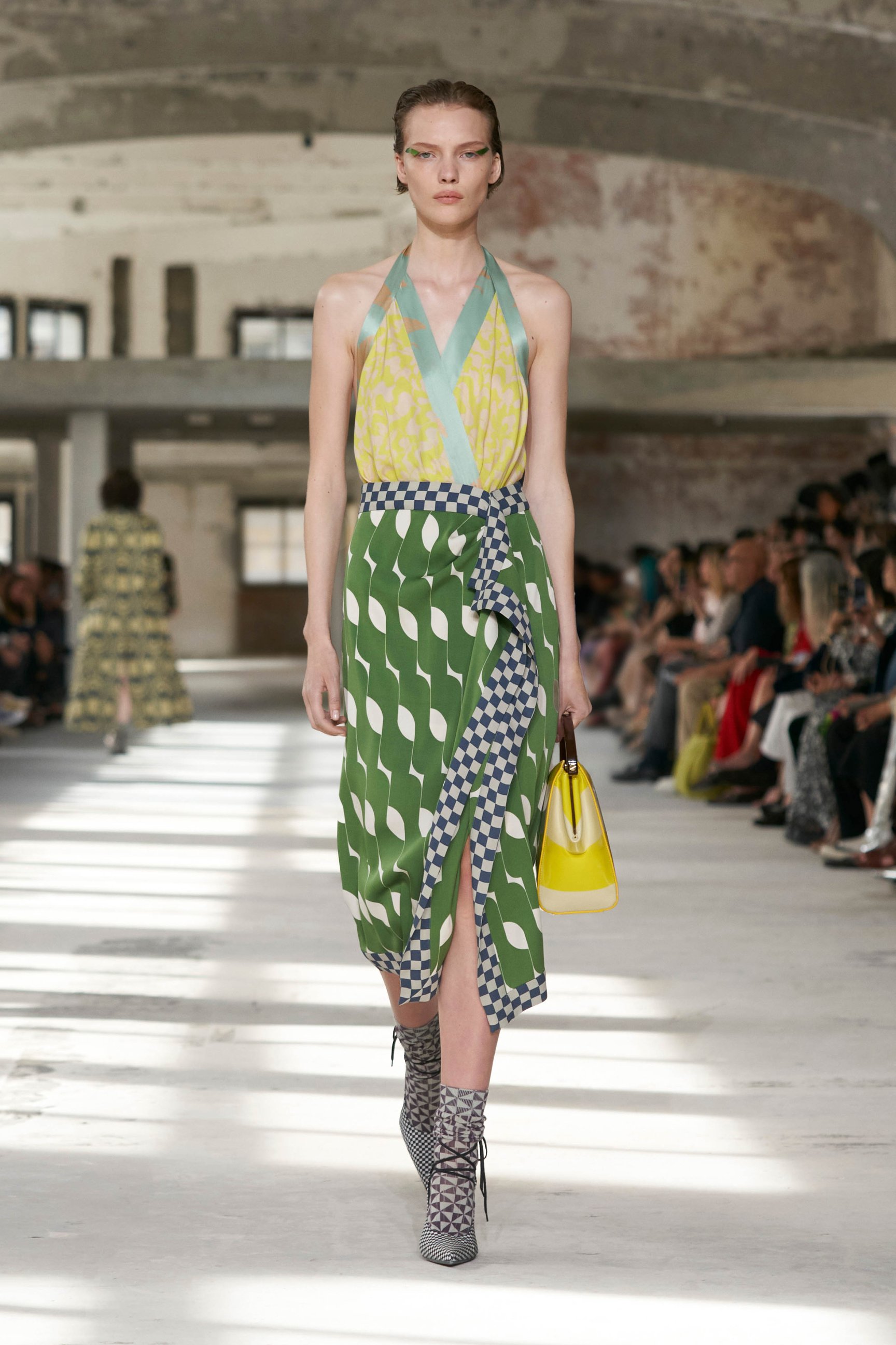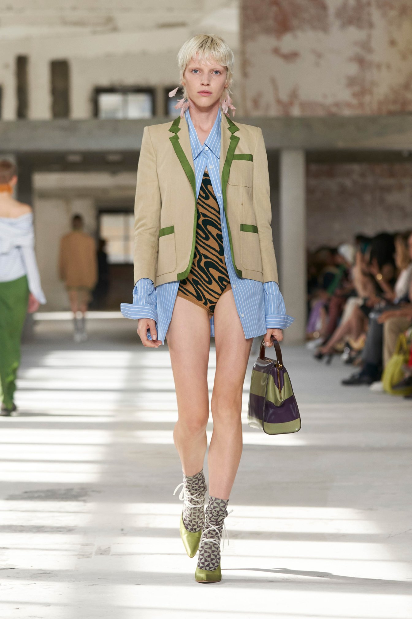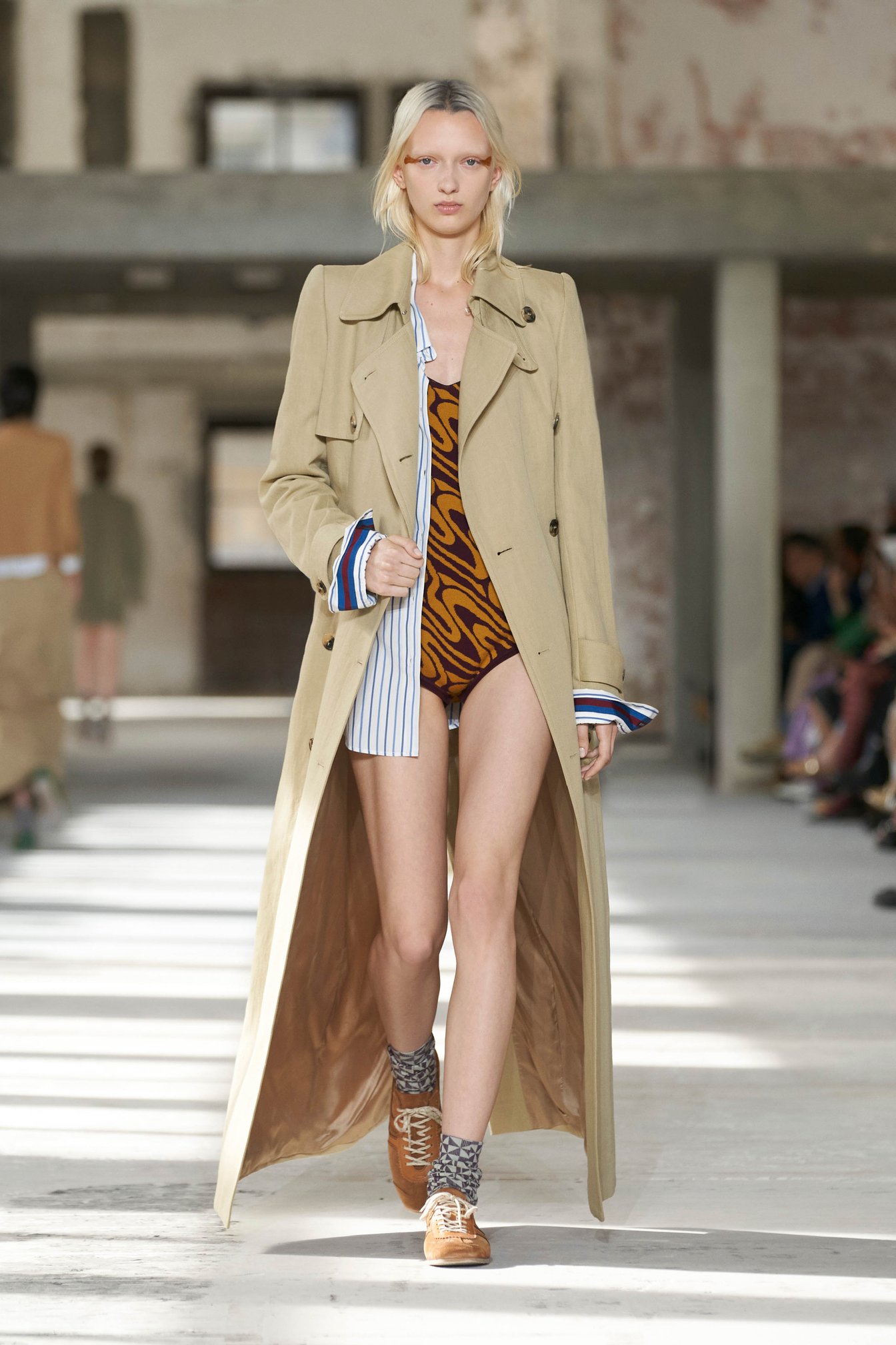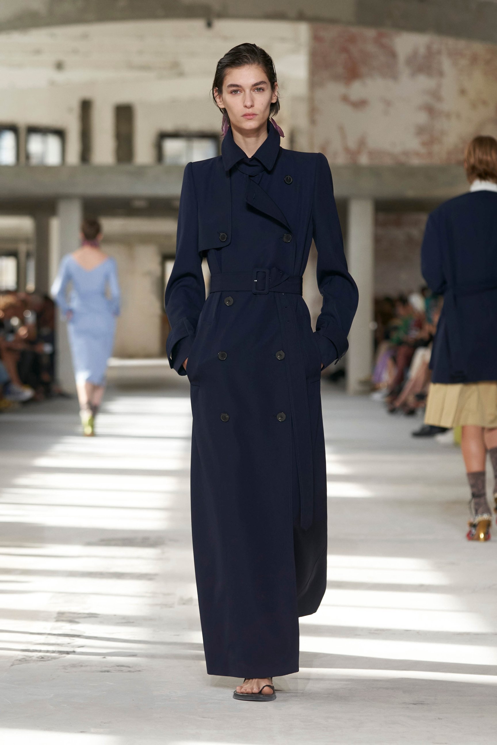 ショーのティザー映像では、一枚の鳥の羽が軽やかに宙を舞う様が公開された。廃墟風の会場に現れたモデルたちは髪に長い羽を差し、目尻にもアイライン代わりに羽を付けている。どこかファンタジックで洗練されたムードはドリスならではだ。コレクションでまず目を引いたのは、スポーツウェアのコード。ラガーシャツや、ジャージーテープのディテールなどがエレガントな装いにアレンジされている。ジャージーにブラトップとラップスカートを合わせたルックなど、意外性のあるコーディネートも登場し、見る者の固定観念を揺さぶった。