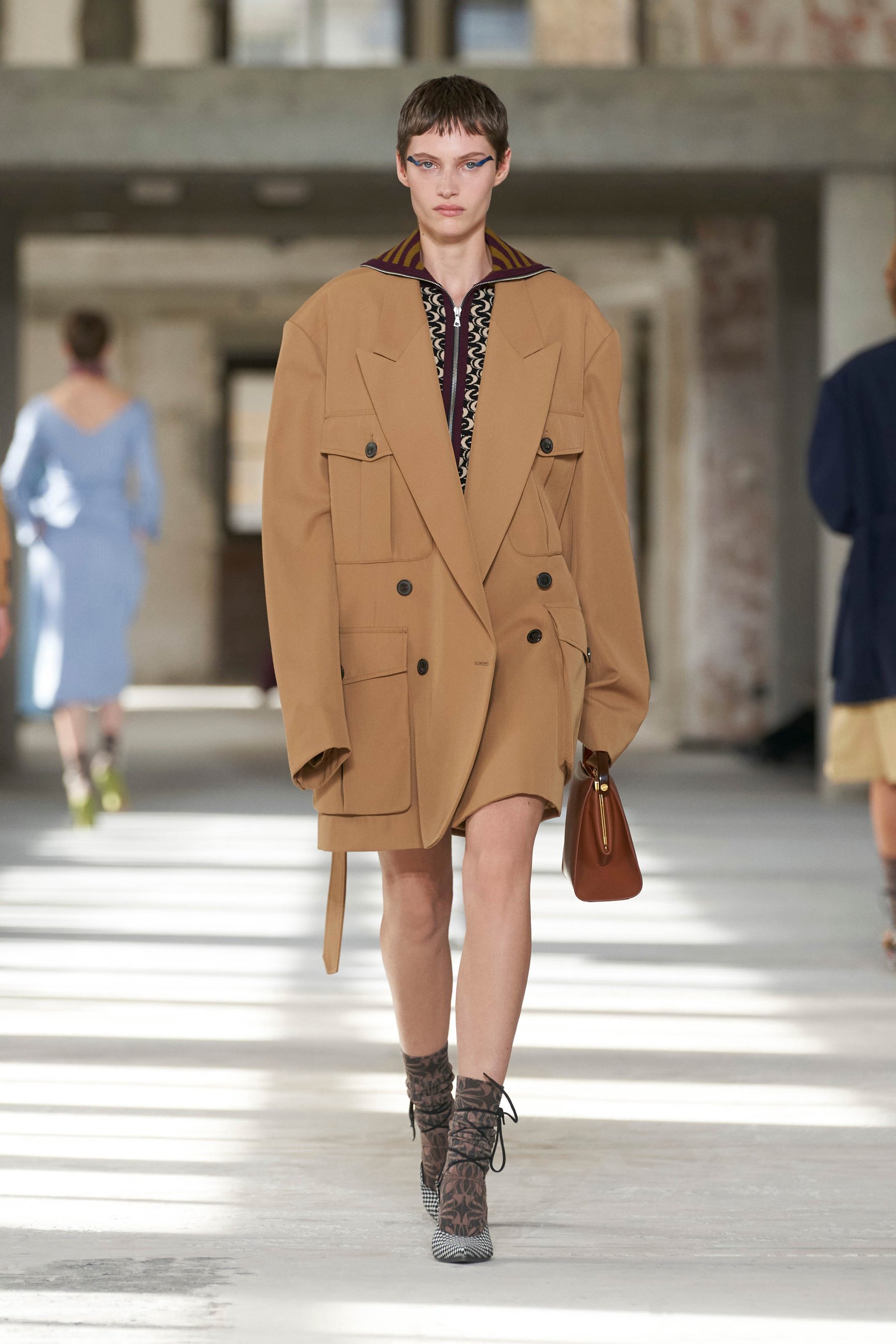 また、シャツやダブルブレストのセットアップ、トレンチコート、タキシードなど、メンズのテーラリングを作り変え、女性らしいフォルムへと変化。襟やポケットにカラフルなパイピングを施すなど、バイカラーのアクセントを効かせた。