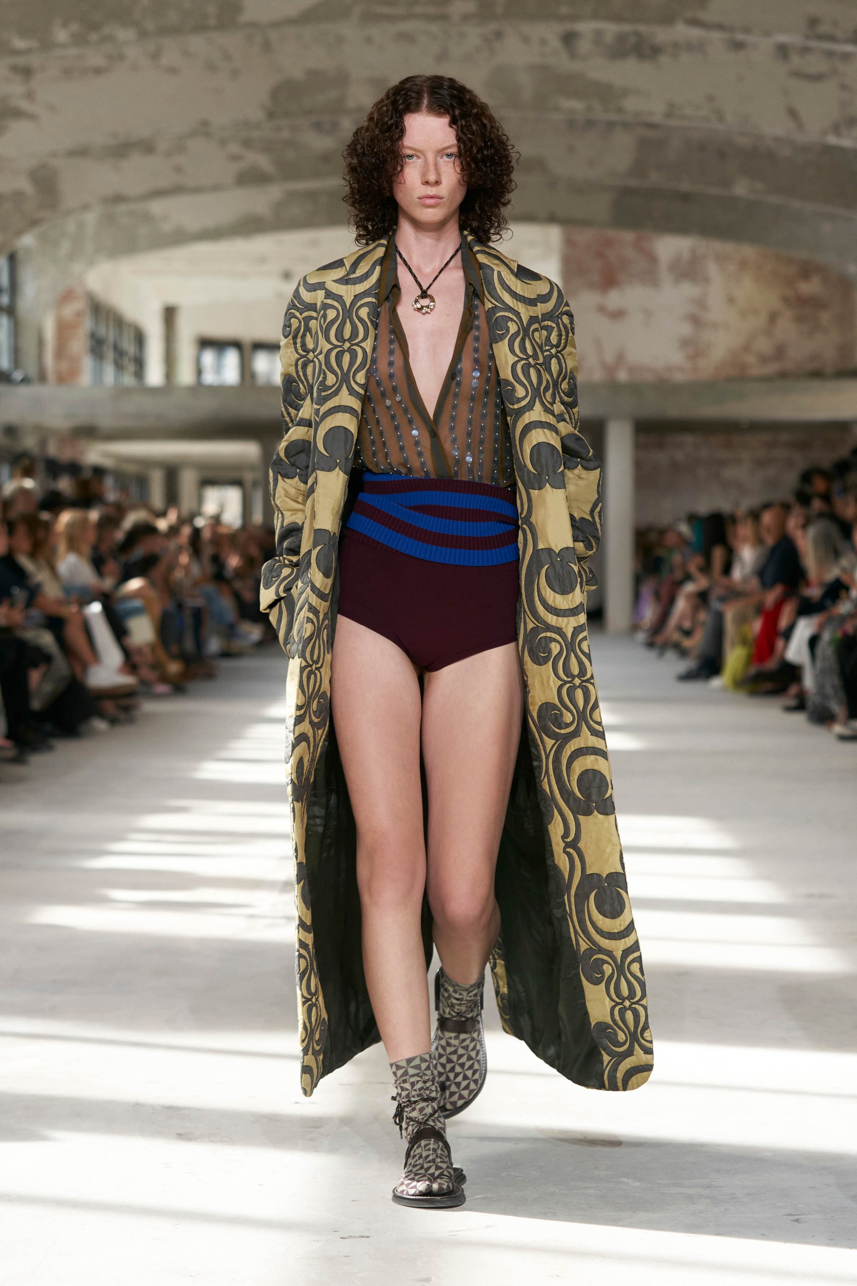 ドリスならではの繊細な装飾はウェアだけでなく、シューズにも施されている。カーブしたヒールと、誇張されたポインテッドトゥを持ち、甲部分は華やかなスパングルで彩られた。ショートソックスと組み合わせたスタイリングは多くのルックに取り入れられ、ユニークな存在感を放っていた。