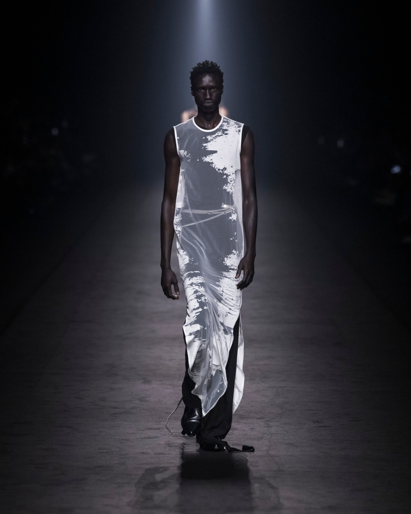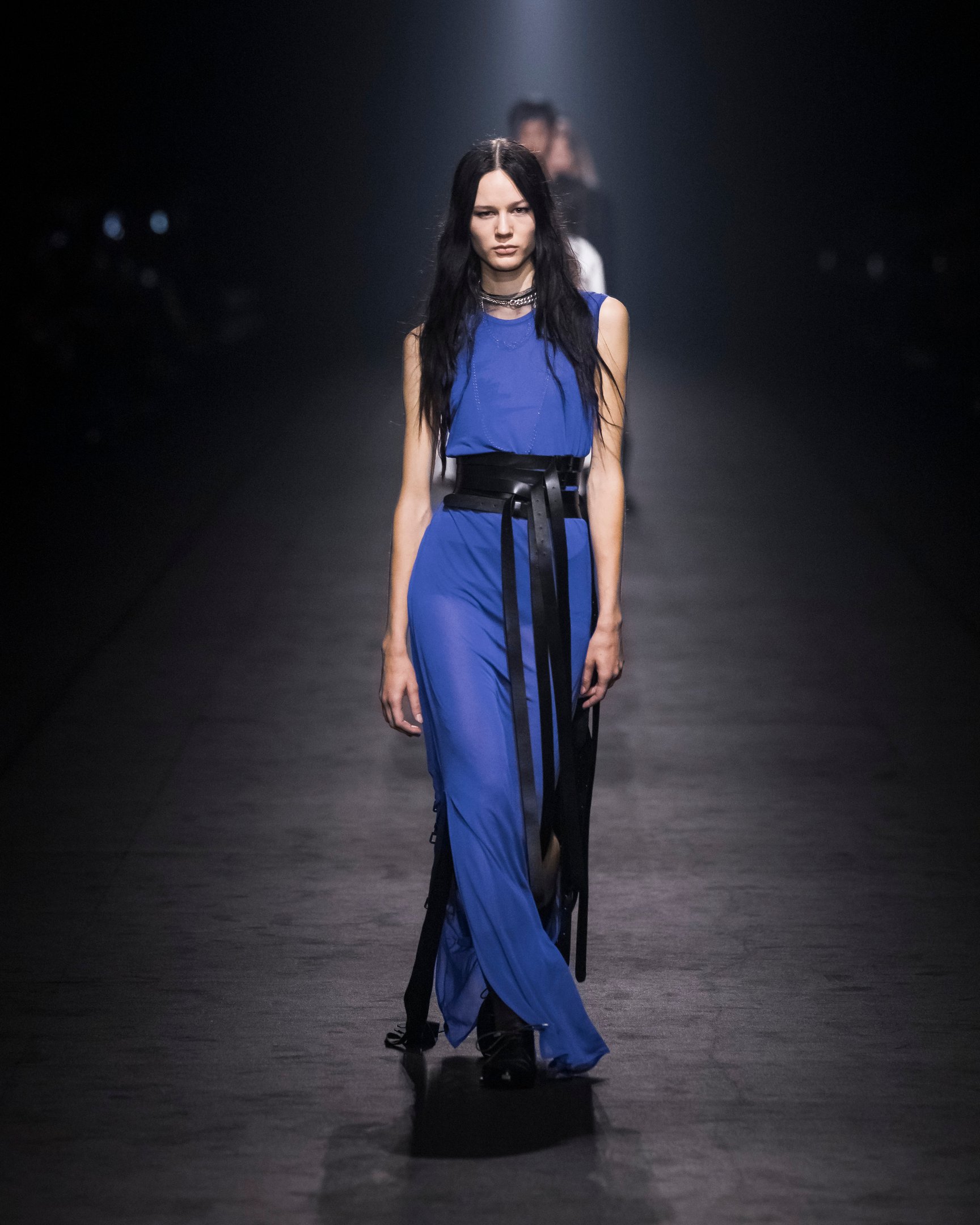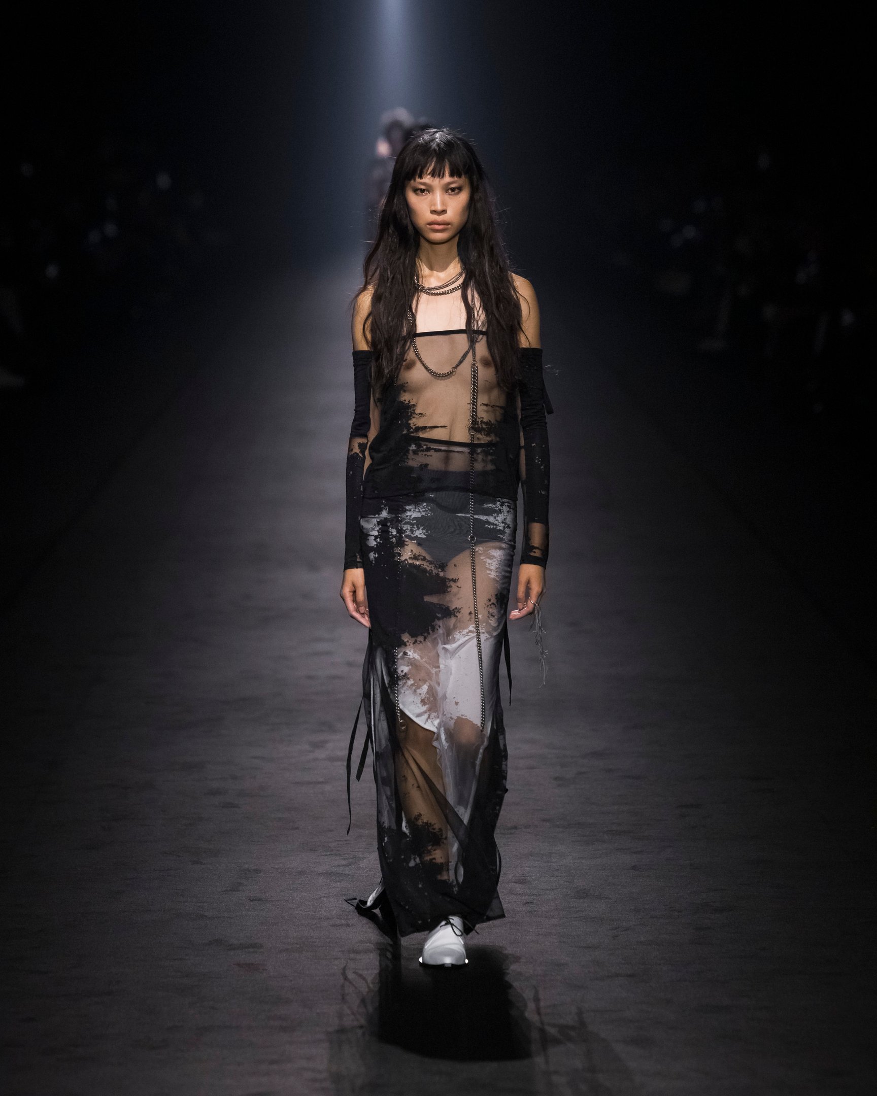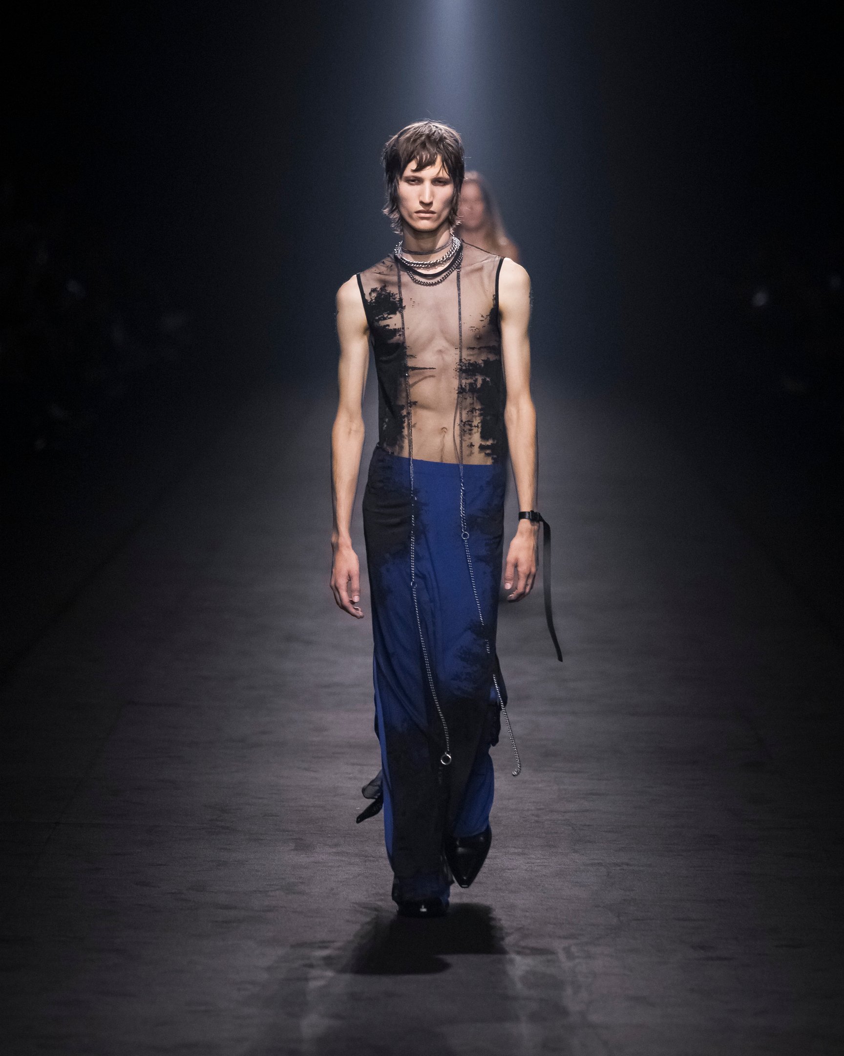 暗い鉄道跡地を会場に、風が吹き荒ぶようなBGMでショーはスタート。透ける素材は巧みにレイヤードされており、細長いシルエットがダークな官能性をアピール。袖や裾に付けられたリボンは地面を引き摺る長さで、太いレザーベルトやチェーンがタイトなシルエットに強さをプラスした。ブランドのシグネチャーとも言えるブラックを基調に、白やエレクトリックブルーの差し色も印象的。後半には大きなポケットをあしらったカーゴパンツなども登場し、神秘的なエレガンスと実用性を両立させた。