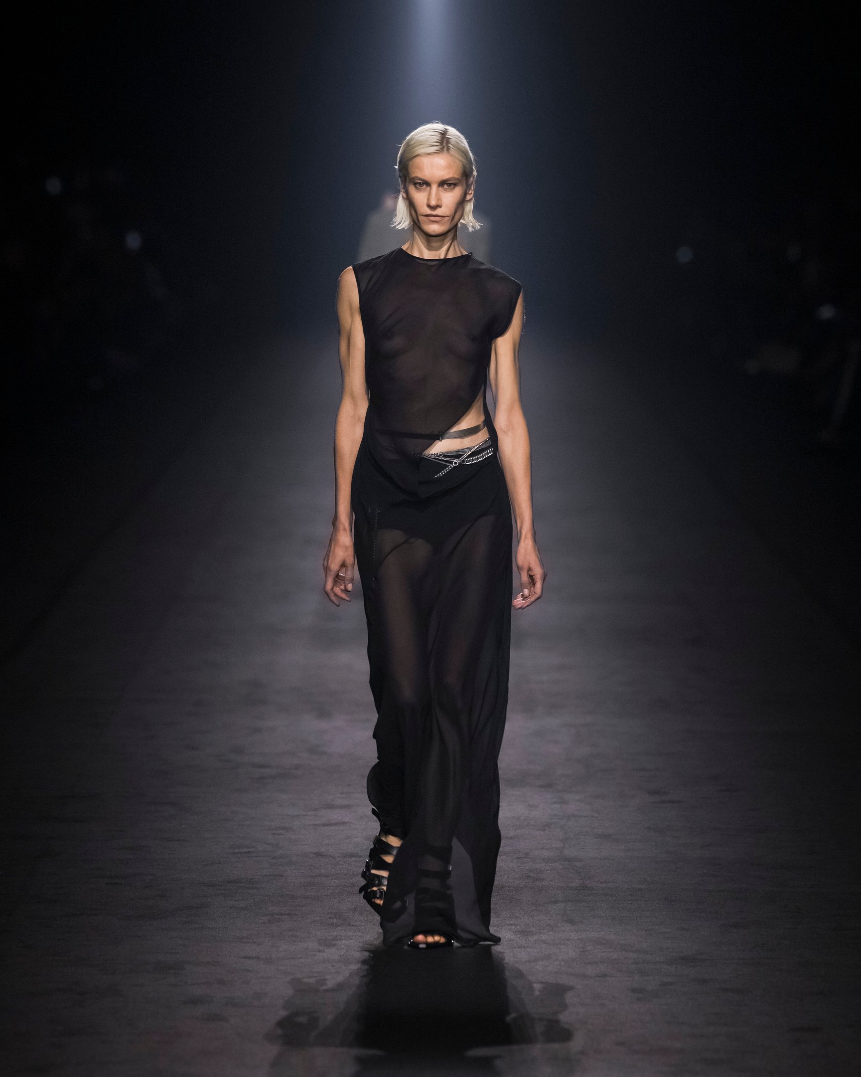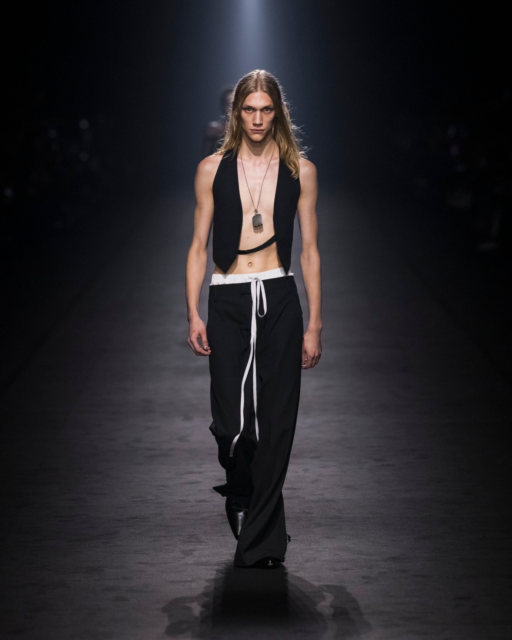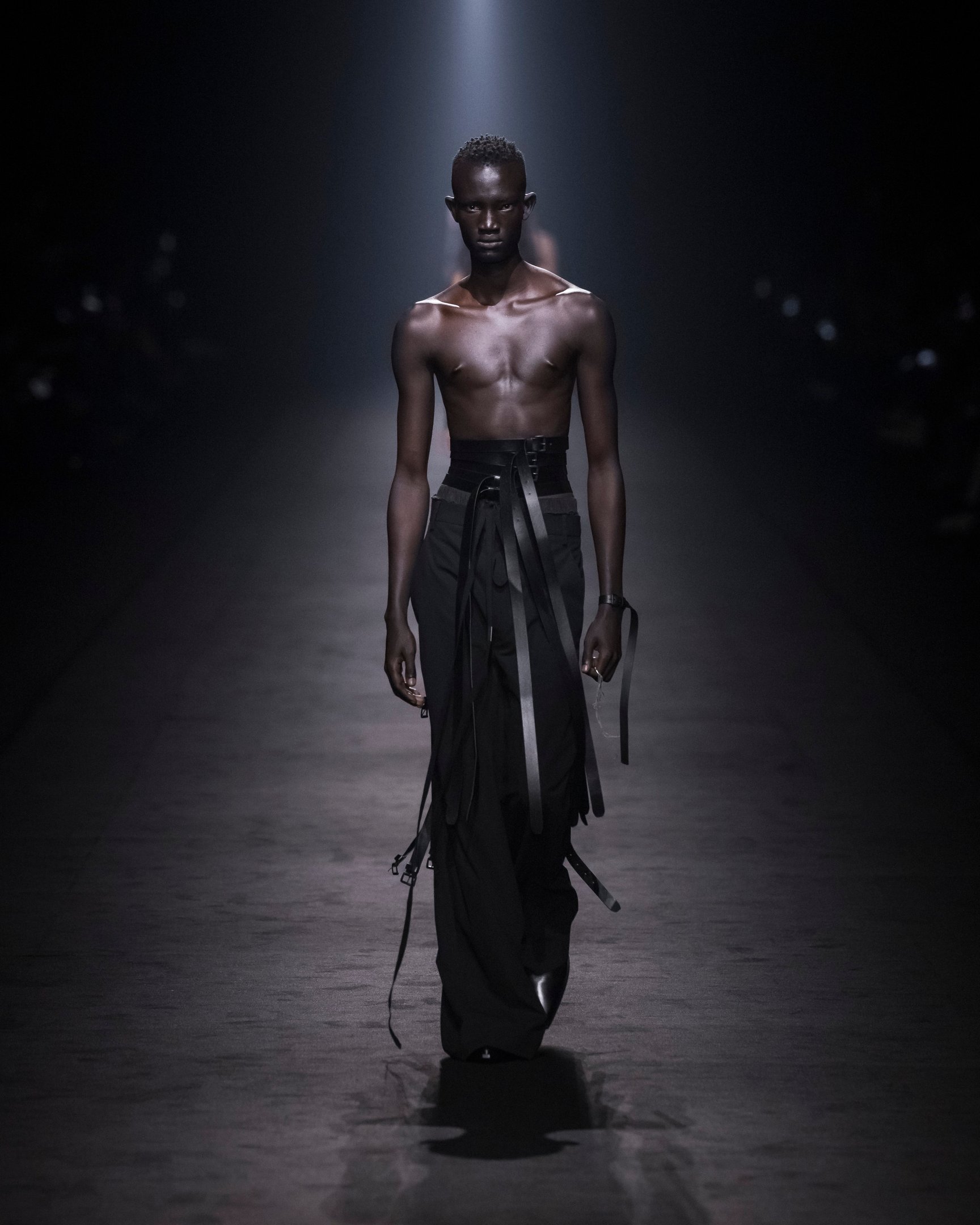 暗い鉄道跡地を会場に、風が吹き荒ぶようなBGMでショーはスタート。透ける素材は巧みにレイヤードされており、細長いシルエットがダークな官能性をアピール。袖や裾に付けられたリボンは地面を引き摺る長さで、太いレザーベルトやチェーンがタイトなシルエットに強さをプラスした。ブランドのシグネチャーとも言えるブラックを基調に、白やエレクトリックブルーの差し色も印象的。後半には大きなポケットをあしらったカーゴパンツなども登場し、神秘的なエレガンスと実用性を両立させた。