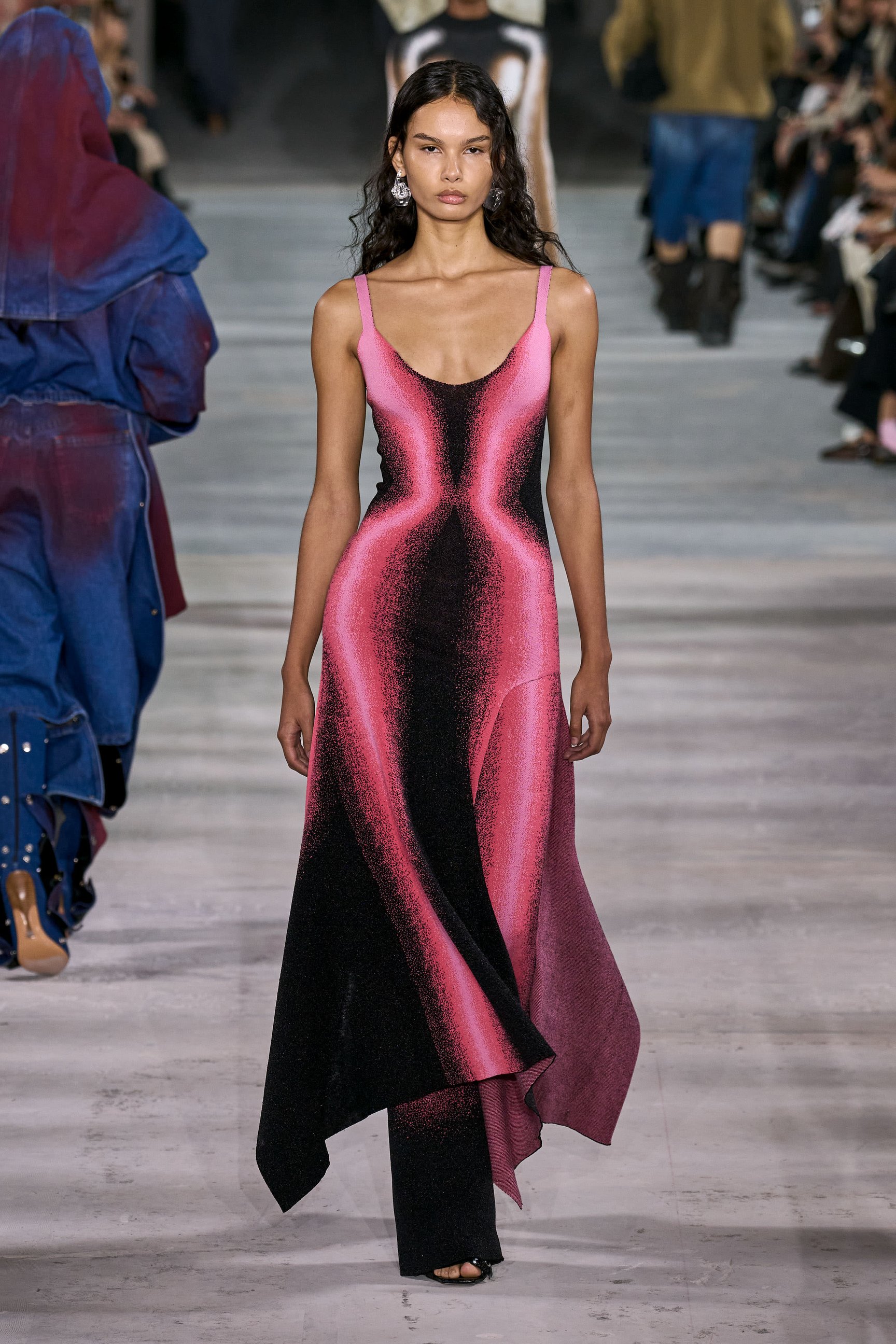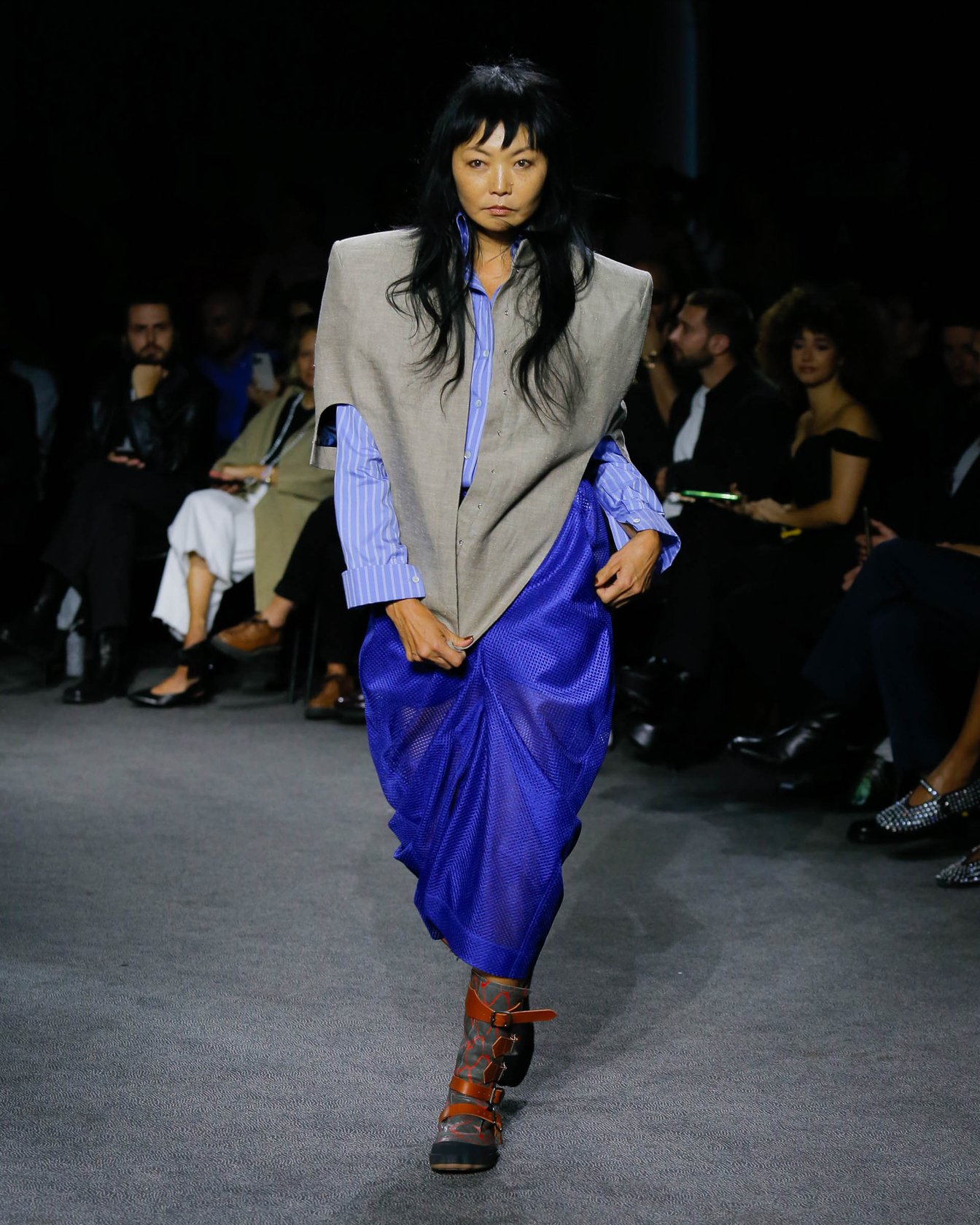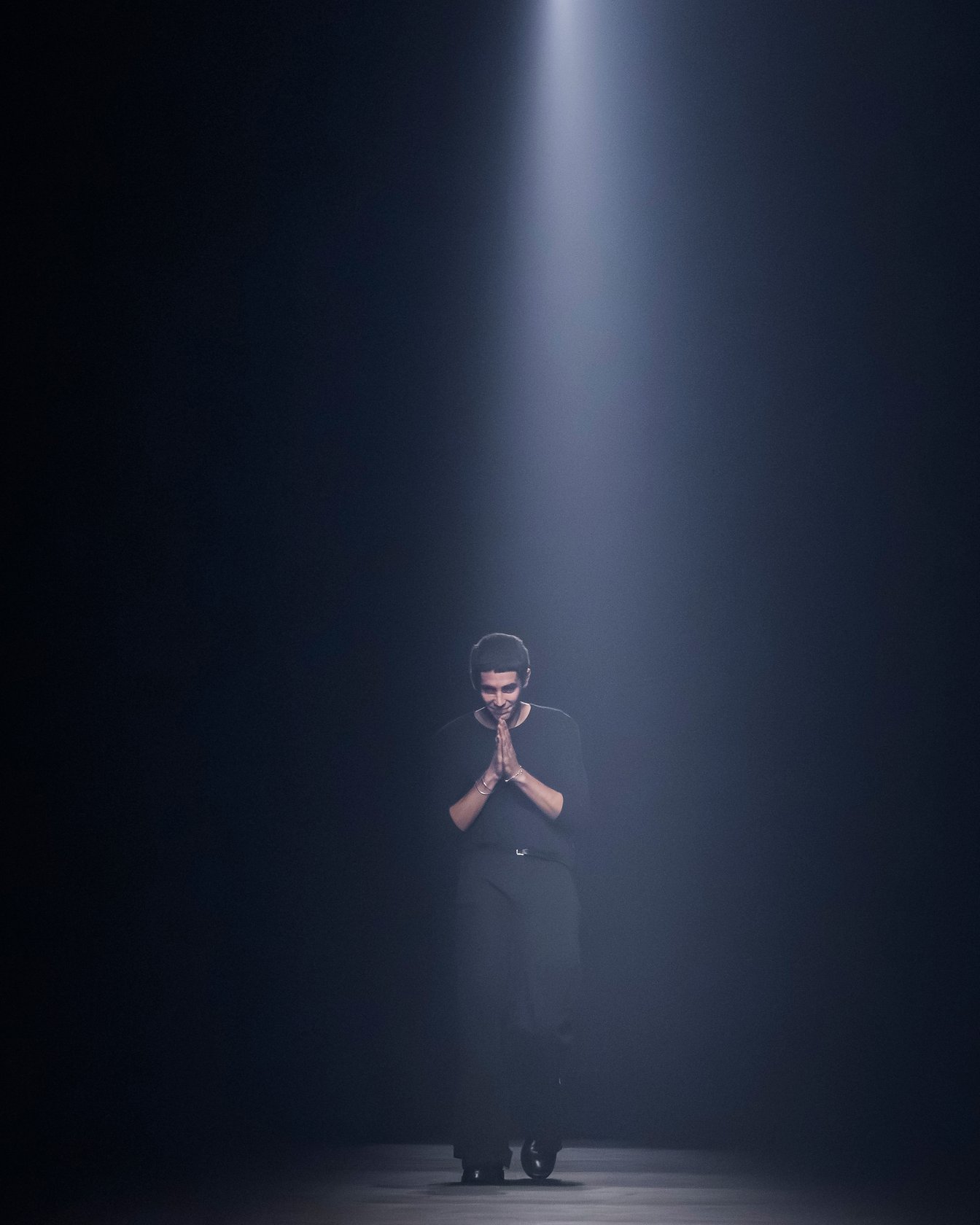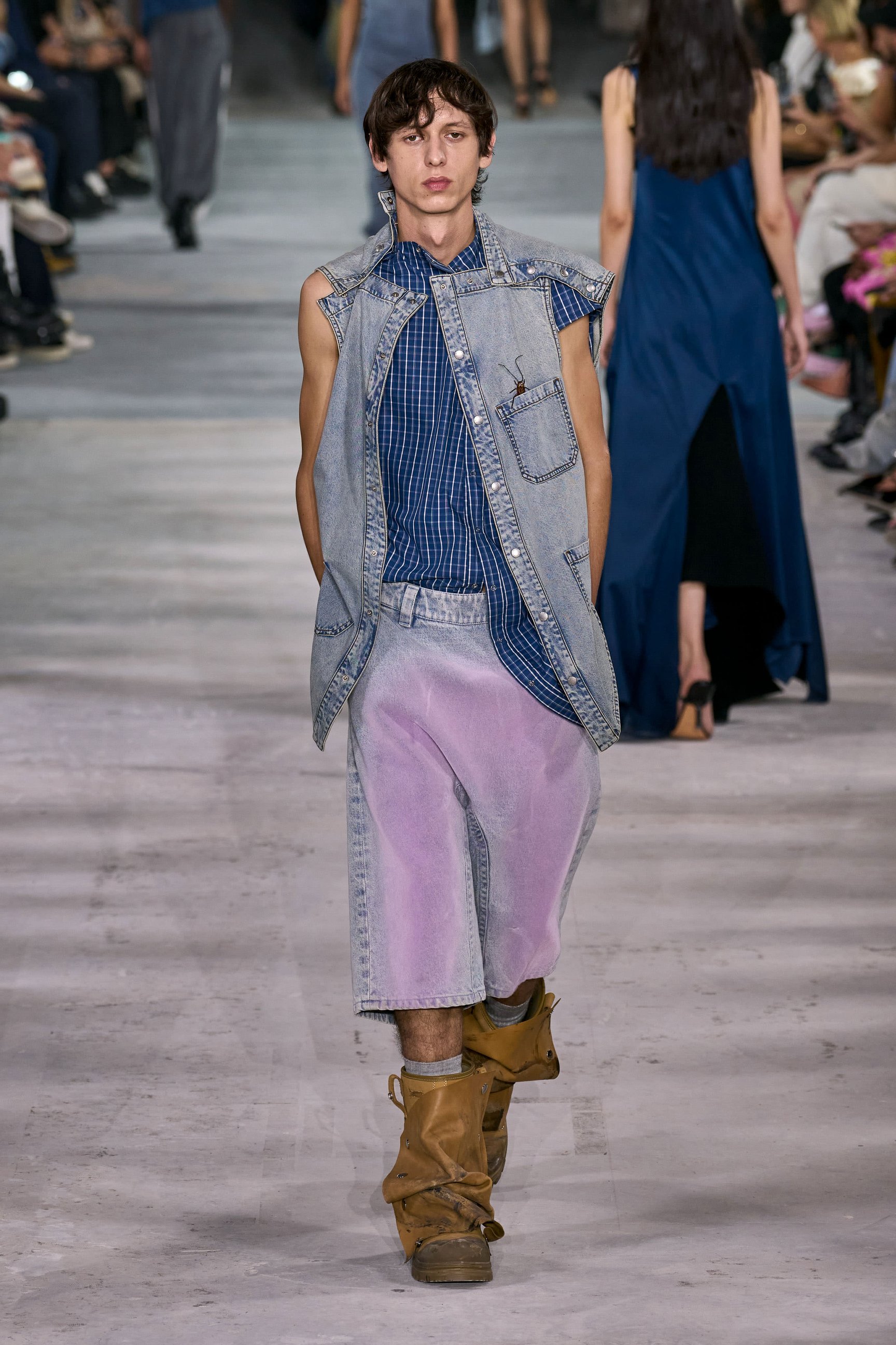 暗い鉄道跡地を会場に、風が吹き荒ぶようなBGMでショーはスタート。透ける素材は巧みにレイヤードされており、細長いシルエットがダークな官能性をアピール。袖や裾に付けられたリボンは地面を引き摺る長さで、太いレザーベルトやチェーンがタイトなシルエットに強さをプラスした。ブランドのシグネチャーとも言えるブラックを基調に、白やエレクトリックブルーの差し色も印象的。後半には大きなポケットをあしらったカーゴパンツなども登場し、神秘的なエレガンスと実用性を両立させた。