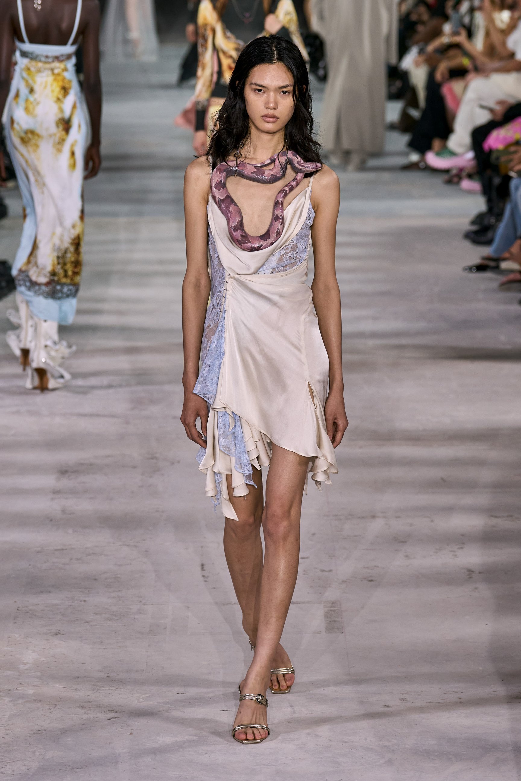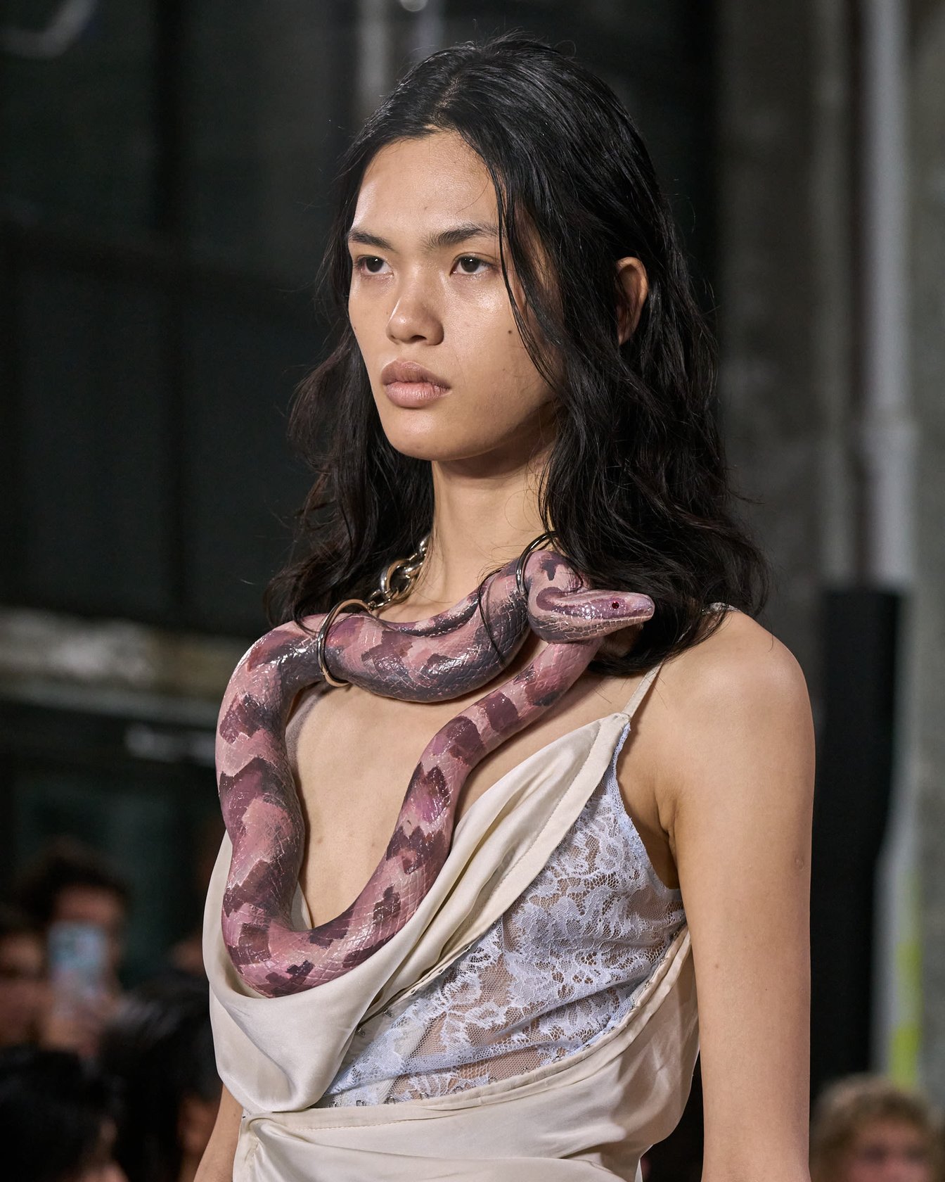 また、モデルたちがおもちゃのヘビをネックレス代わりに巻いたり、ゴキブリのようなピアスを付けたりするなど、一見すると気持ち悪いものをアクセサリーにするというアプローチに含みを持たせた。