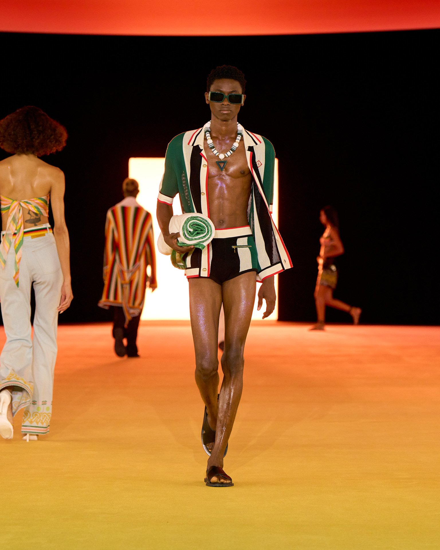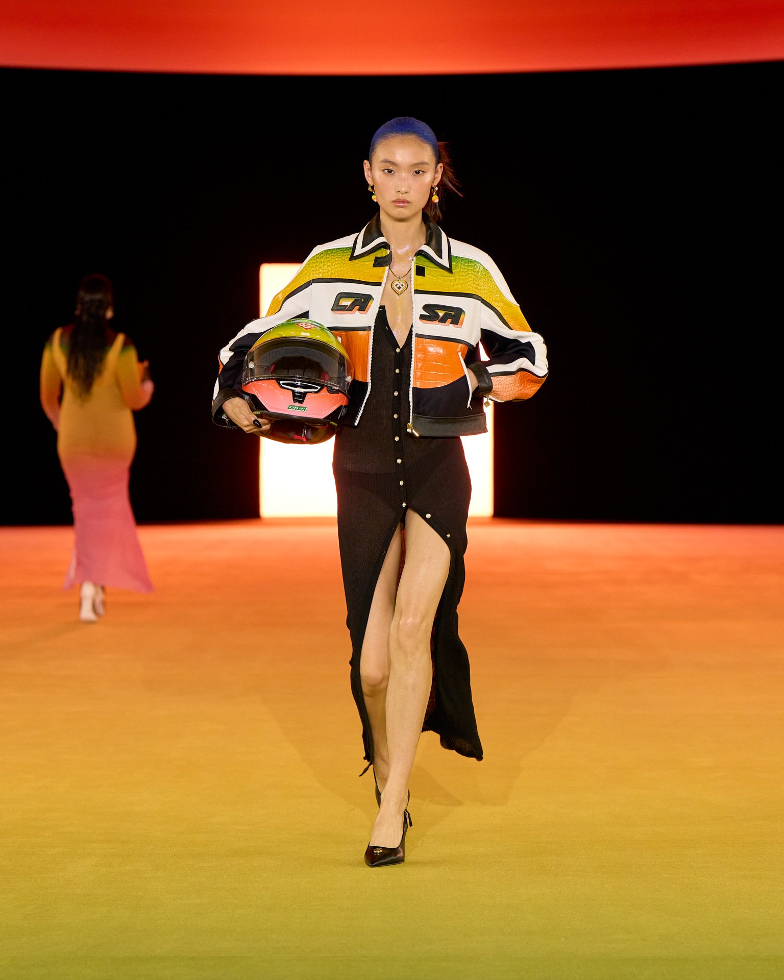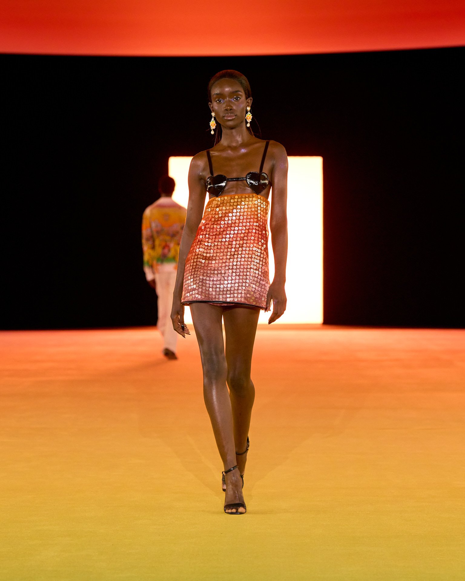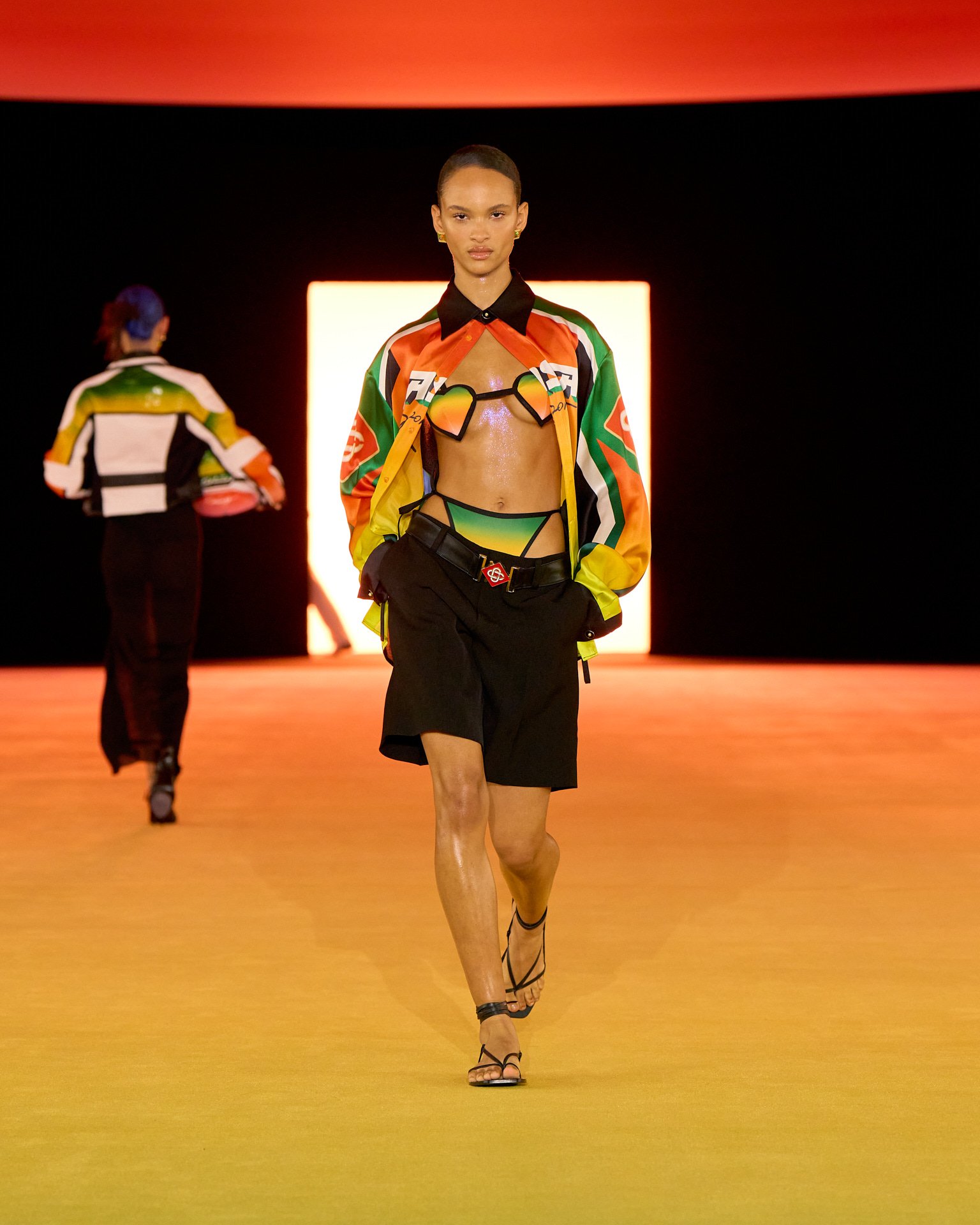 夕焼けのようなグラデーションで彩られた会場装飾とルックは、色が目まぐるしく移り変わるサハラ地域の光景を表現したもの。ブランドが得意とするテニスウェアの要素はもちろん、バイクのヘルメットを小脇に抱えたライダースルックやスイムウェアなども取り入れ、スポーティかつエネルギッシュな世界観を作り出した。ラストに登場したのは、スパンコールでグラデーションを表現したミニドレス。ハート型のビキニと組み合わせたテクノ風のルックが華やかにショーを締め括った。