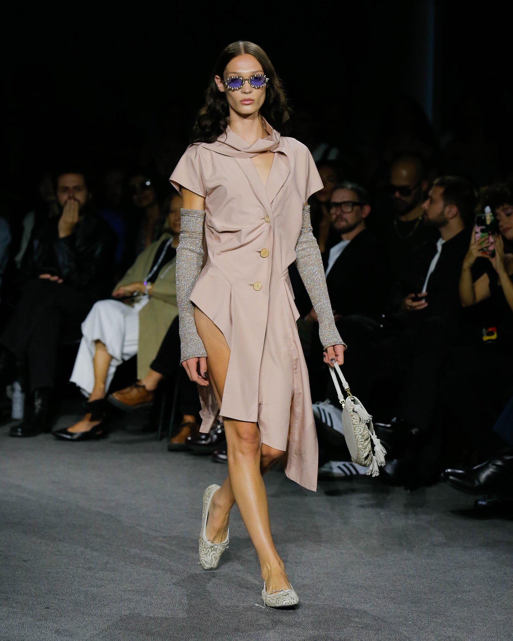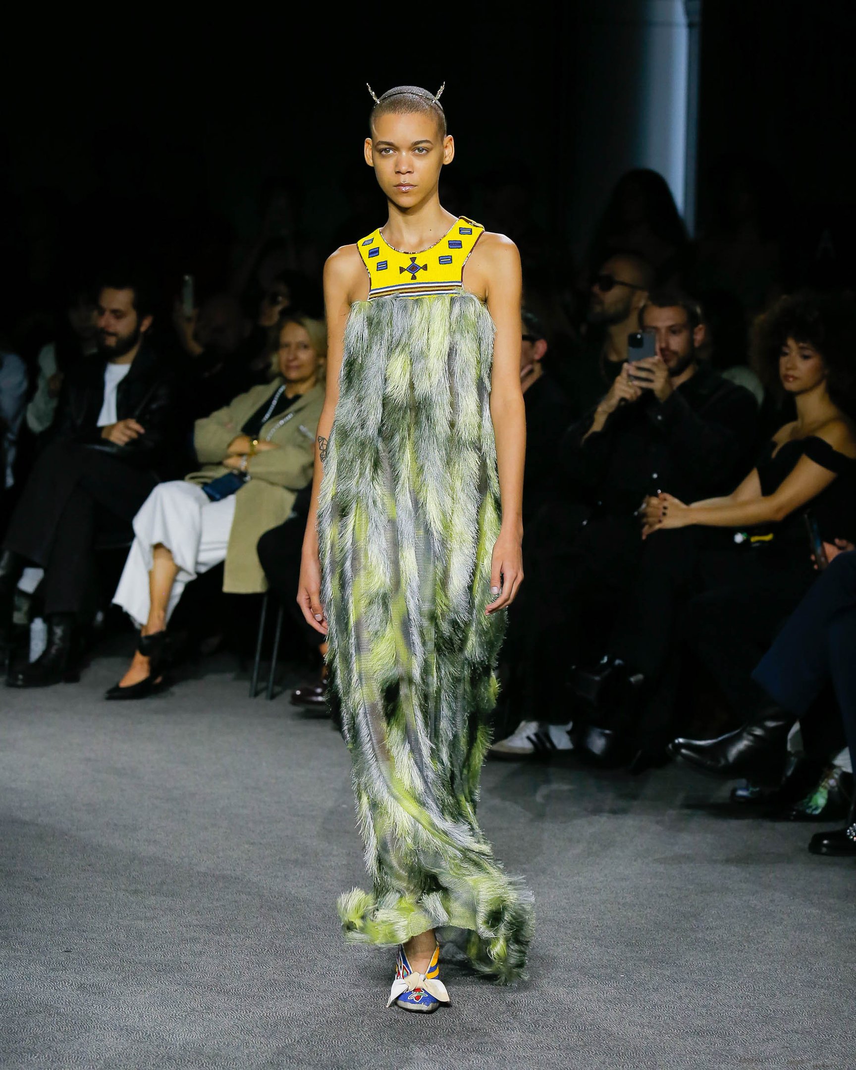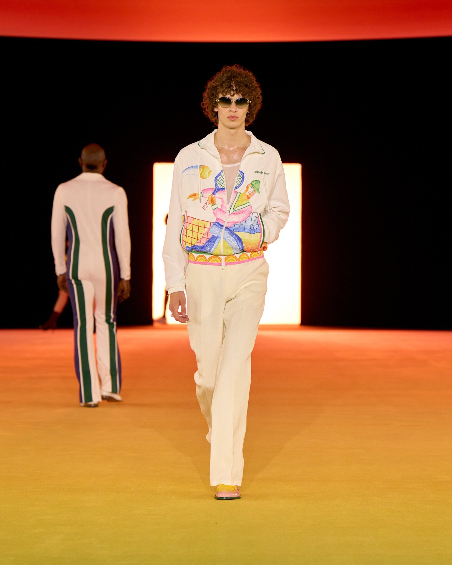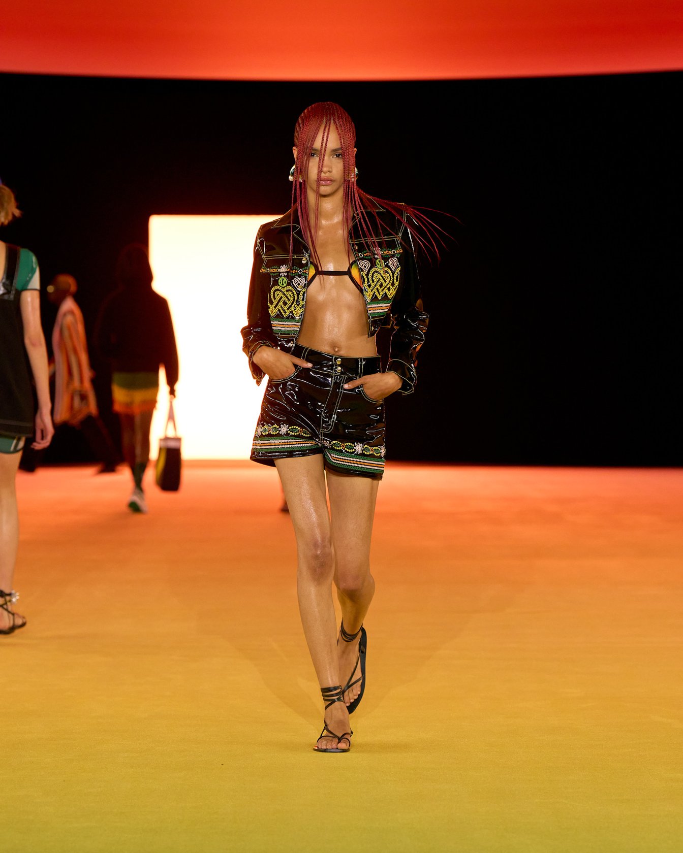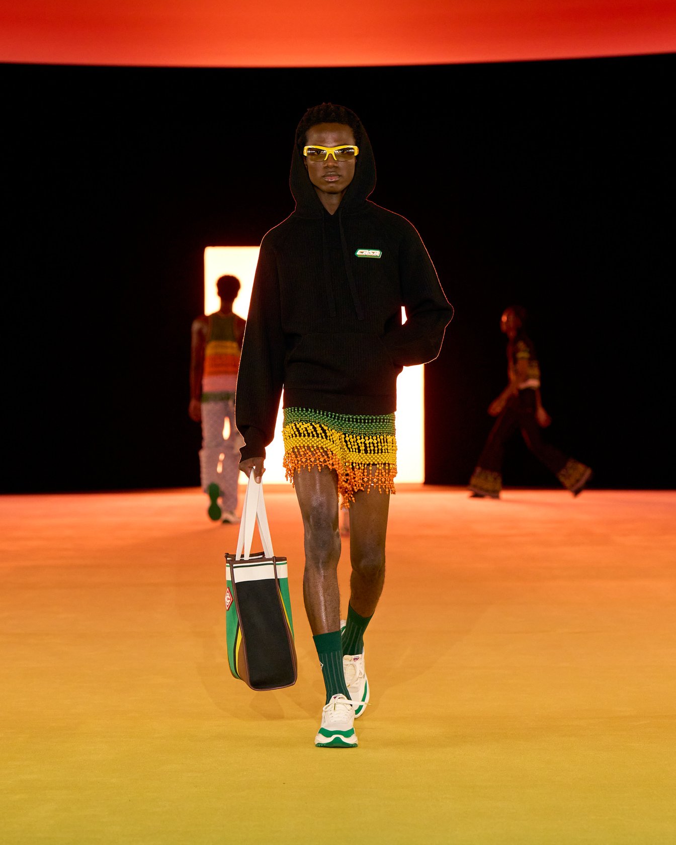夕焼けのようなグラデーションで彩られた会場装飾とルックは、色が目まぐるしく移り変わるサハラ地域の光景を表現したもの。ブランドが得意とするテニスウェアの要素はもちろん、バイクのヘルメットを小脇に抱えたライダースルックやスイムウェアなども取り入れ、スポーティかつエネルギッシュな世界観を作り出した。ラストに登場したのは、スパンコールでグラデーションを表現したミニドレス。ハート型のビキニと組み合わせたテクノ風のルックが華やかにショーを締め括った。
