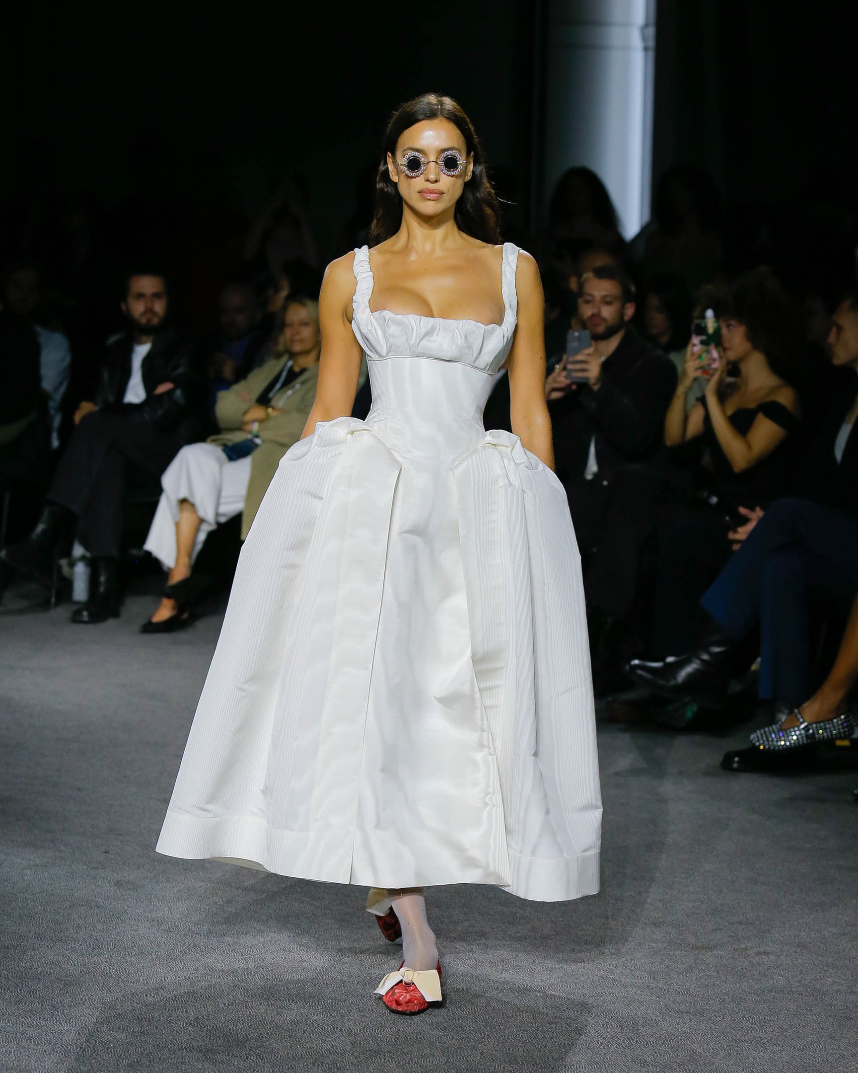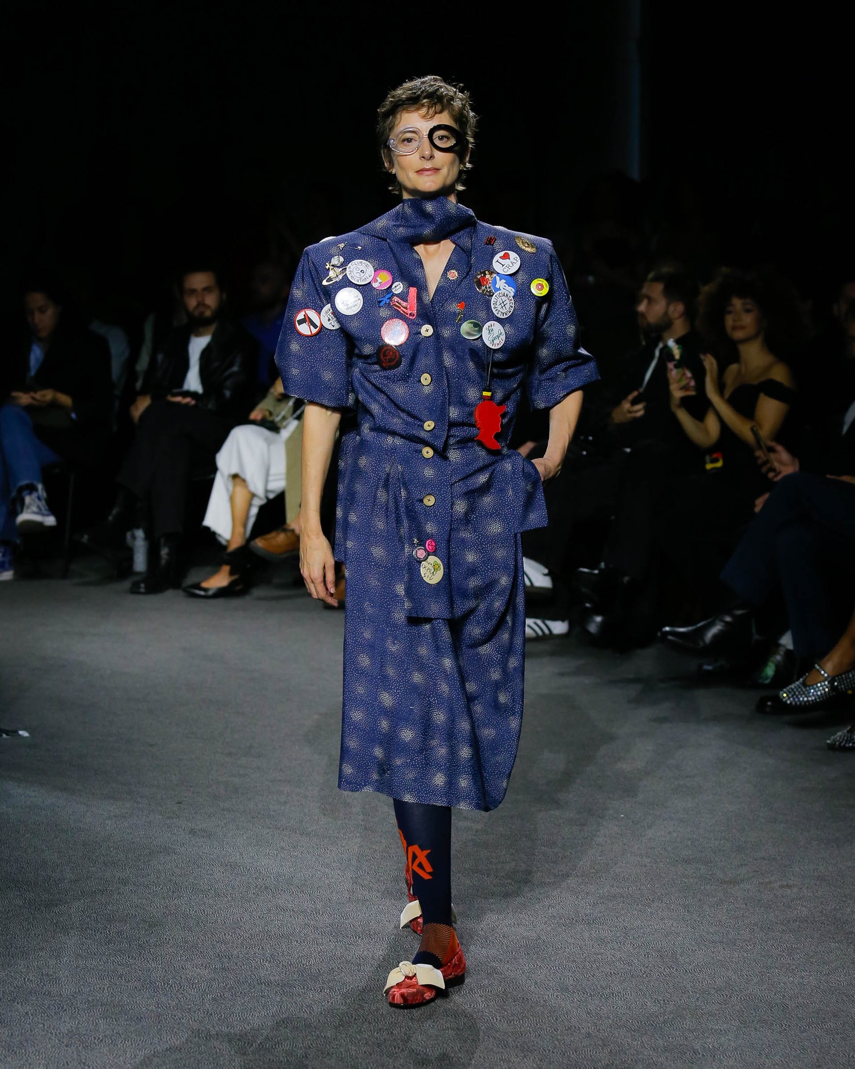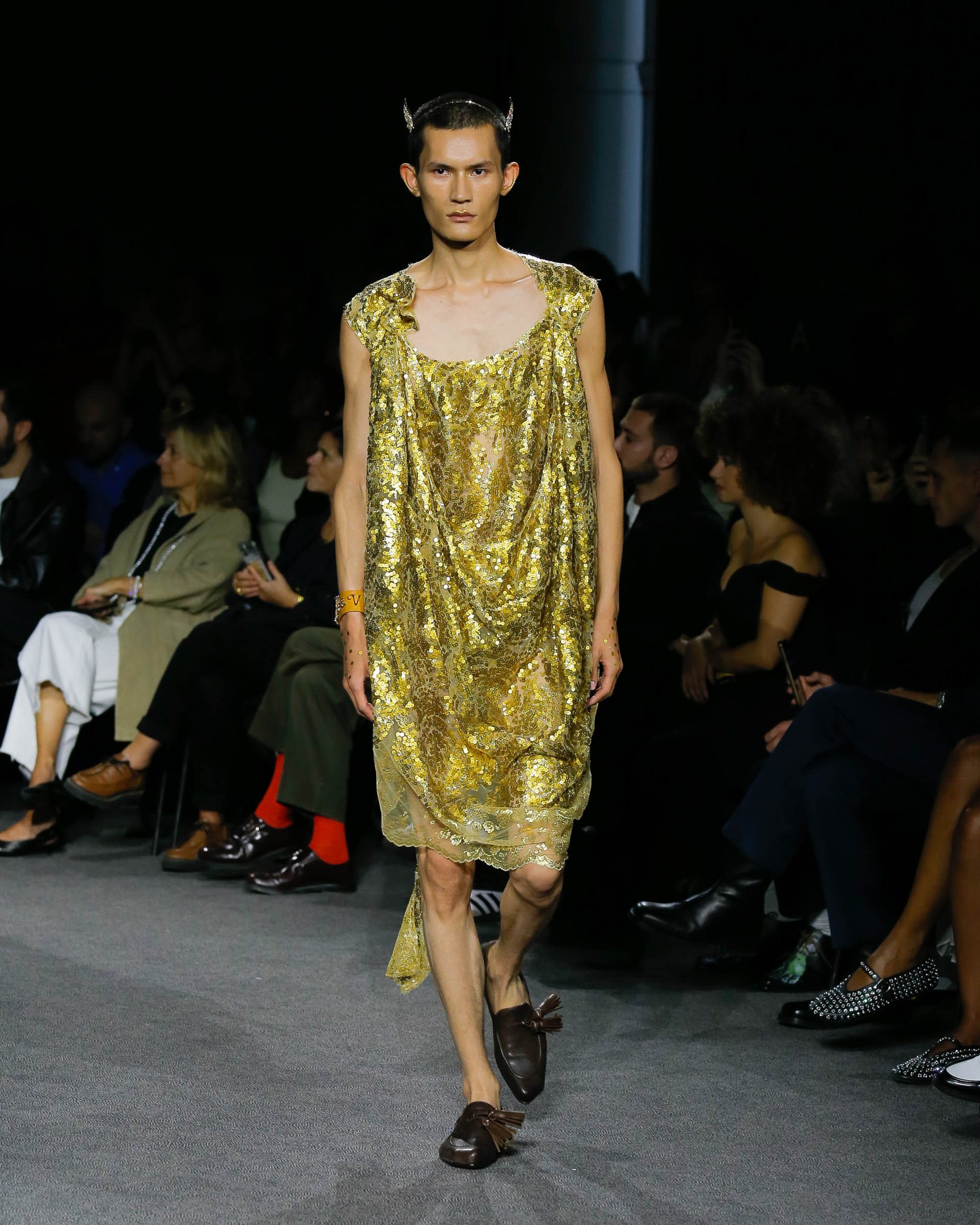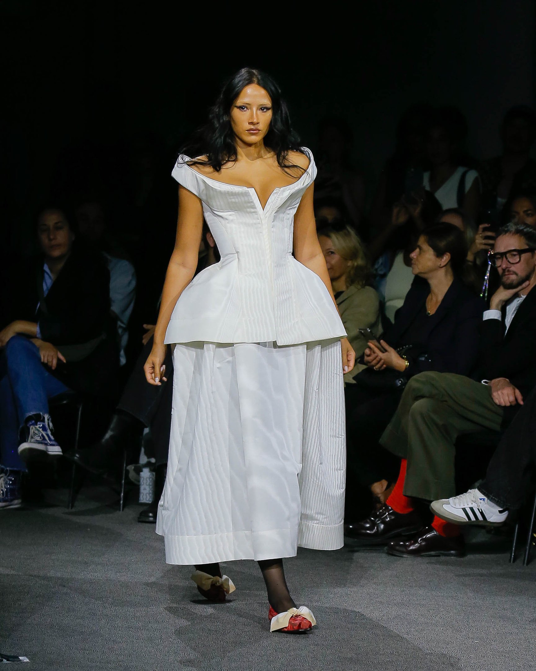 ツノのカチューシャやプラットフォームブーツといったパンクな要素を踏襲しながら、最後に登場したのはエレガントな白いドレス。ヴィヴィアンのクリエイションは時が経っても色褪せないということを強く証明する、愛情深いトリビュートとなった。