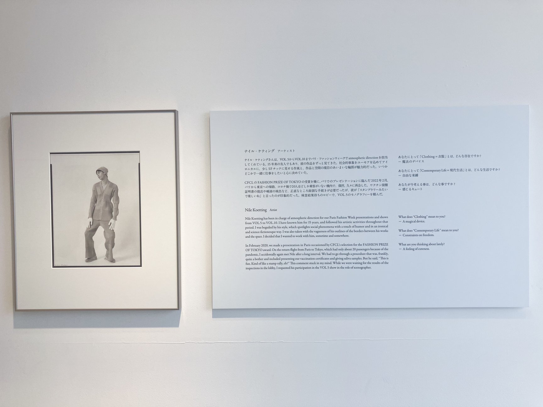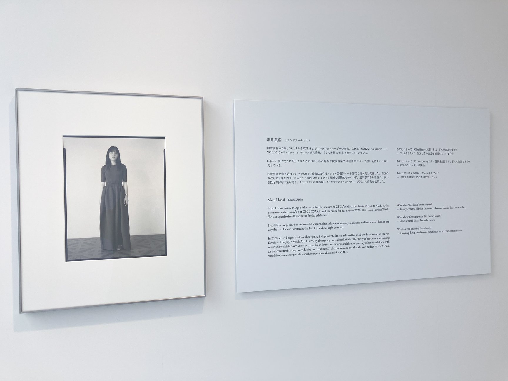 最後の部屋では、「現代生活に必要な衣服とは何か?」という問いをクリエイションのテーマとするCFCLが、写真家の蓮井幹生とともにブランドデビュー時から続けているポートレート撮影プロジェクト「SILHOUETTE」の作品を紹介。「現代的な生活を送る人」だと高橋が感じる友人や知人67組の姿をアナログフィルムに収めてきた中から、近年プロジェクトをともにしてきた4人をピックアップし、高橋との出会いのエピソードと、「あなたにとって衣服とはどんな存在か?」「あなたにとって現代生活とはどんな生活か?」「今考えていることはどんなことか?」という3つの質問に対する答えとともに展示している。