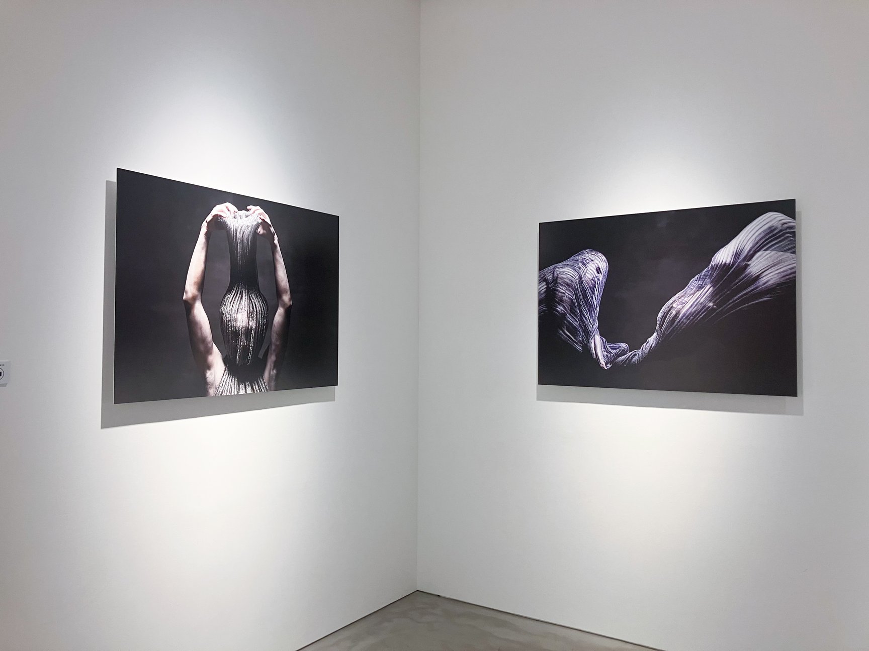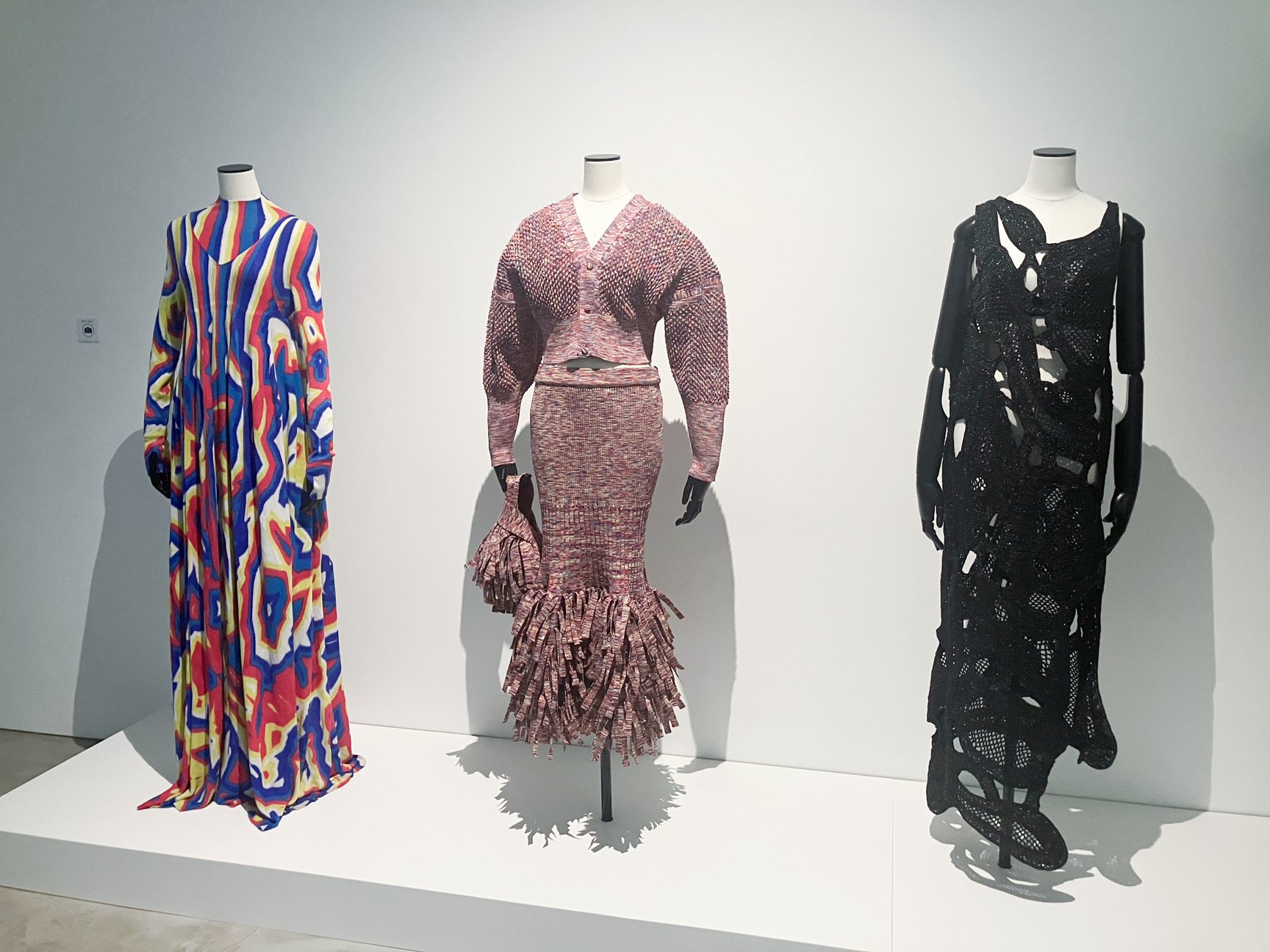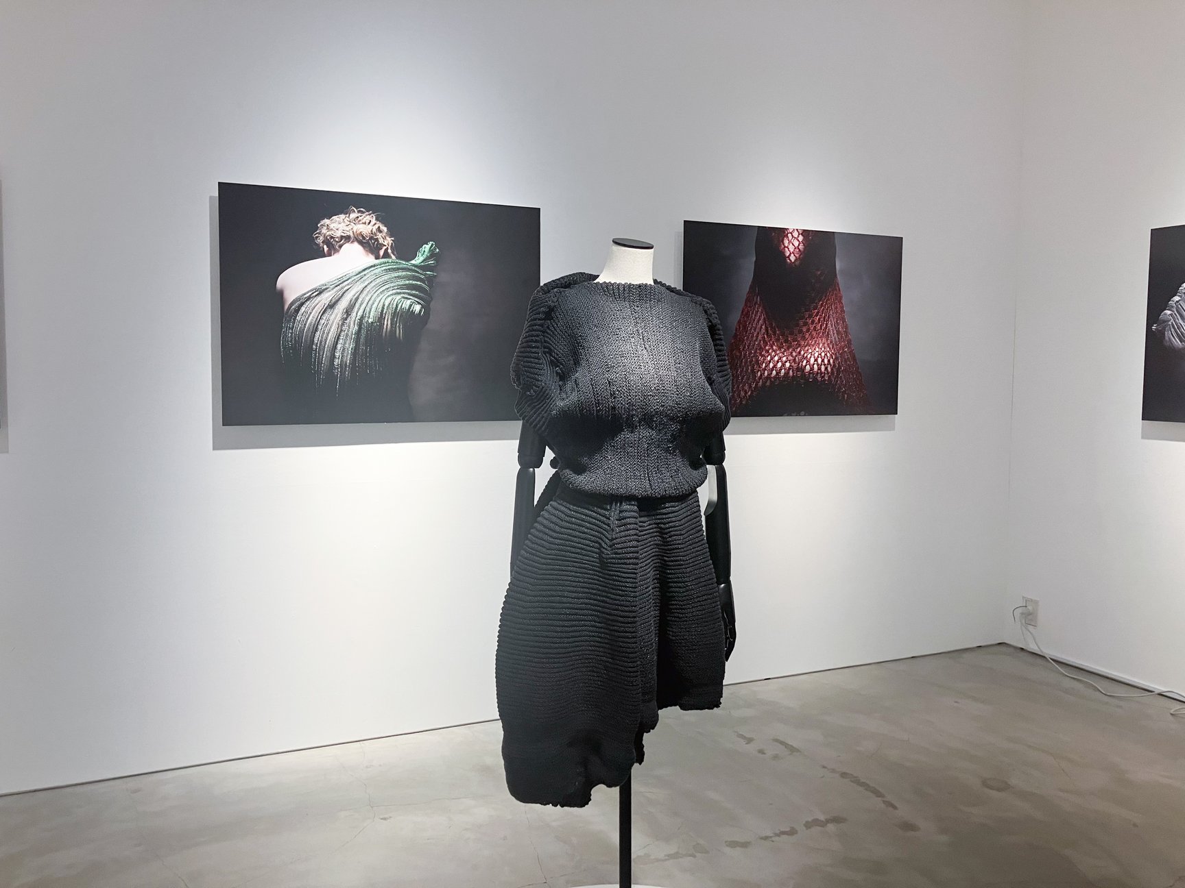 1部屋目では、高橋が「3Dコンピューター・ニッティング」の技術と出合い、ファッションデザイナーとしてのキャリアのスタートにもなった文化ファッション大学院大学生時代の作品を披露。2009年に第83回装苑賞を受賞した、当時最先端の丸みを帯びた現代建築を着想源とした作品「BLOBITECTURE FORM」をはじめ、大学院の修了制作として手がけた「THE KNITTING SCULPTURE」を収めた写真を展示している。