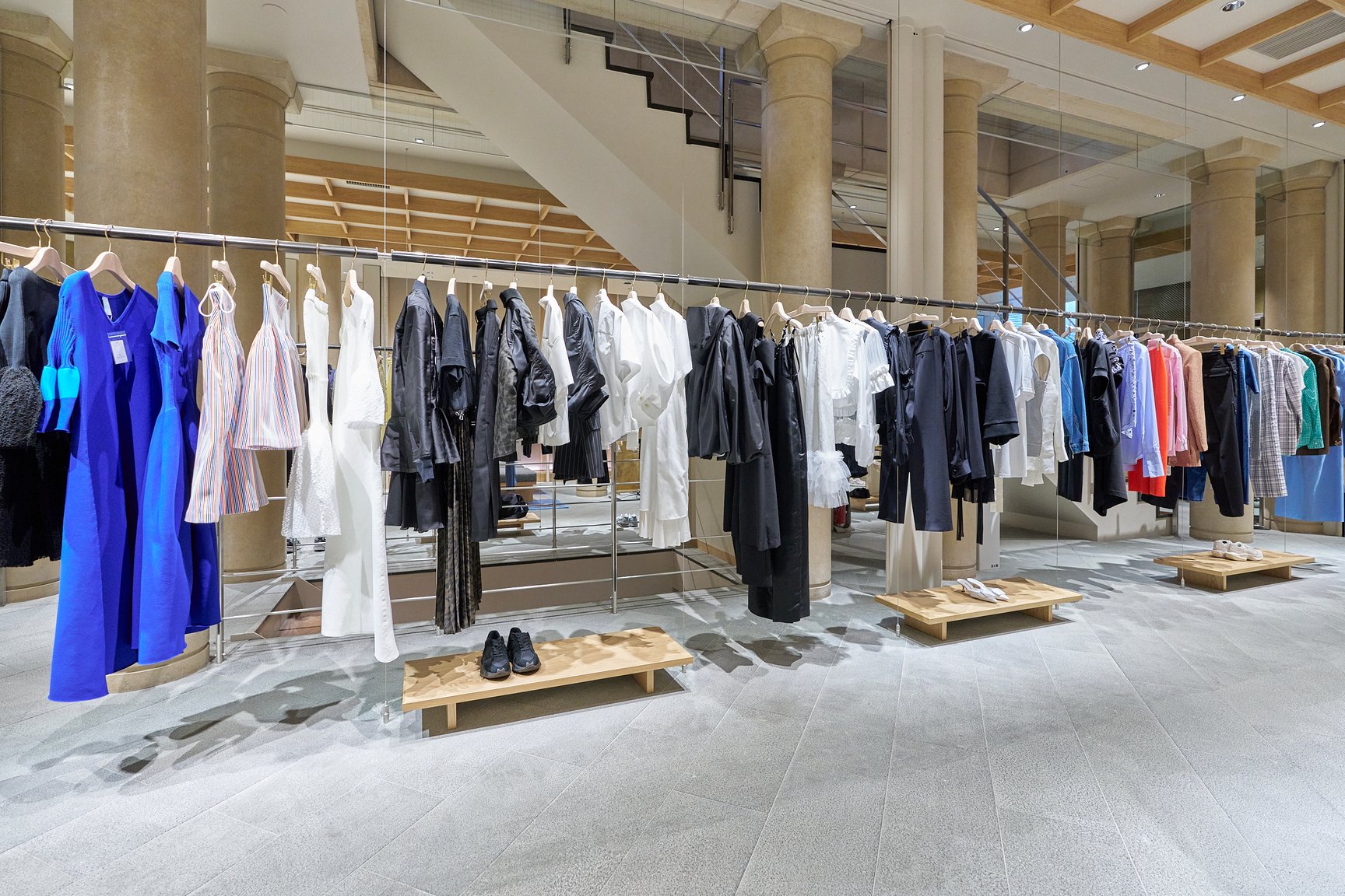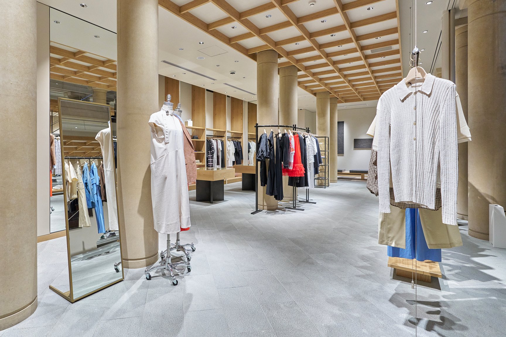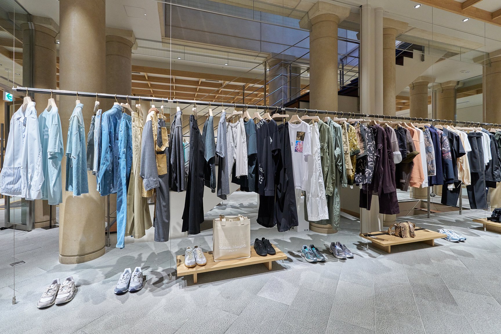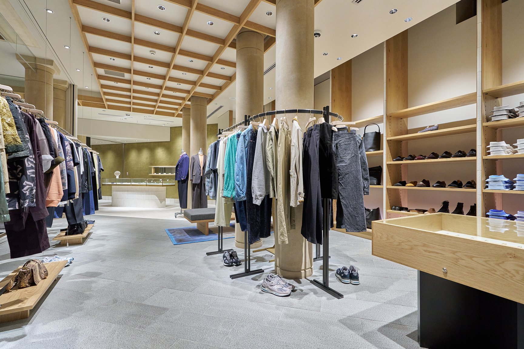 「衣」をテーマに構成された地下1階では、ウィメンズとメンズのウェアやシューズ、ハンドバッグ、ジュエリーなどをラインナップ。「日本が影響を受け、また影響を与えている」素材やディテール、柄、職人技などへの敬意が込められたブランドを中心に、「ロエベ(LOEWE)」「ザ・ロウ(THE ROW)」「メゾン マルジェラ(Maison Margiela)」「ドリス ヴァン ノッテン(DRIES VAN NOTEN)」「セッチュウ(SETCHU)」「オーラリー(AURALEE)」「コモリ(COMOLI)」「コッキ(KHOKI)」「ノワール ケイ ニノミヤ(noir kei ninomiya)」「ジョンロブ(JOHN LOBB)」「マノロ ブラニク(Manolo Blahnik)」「ミオ ハルタカ(MIO HARUTAKA)」など、国内外のブランドを揃えている。