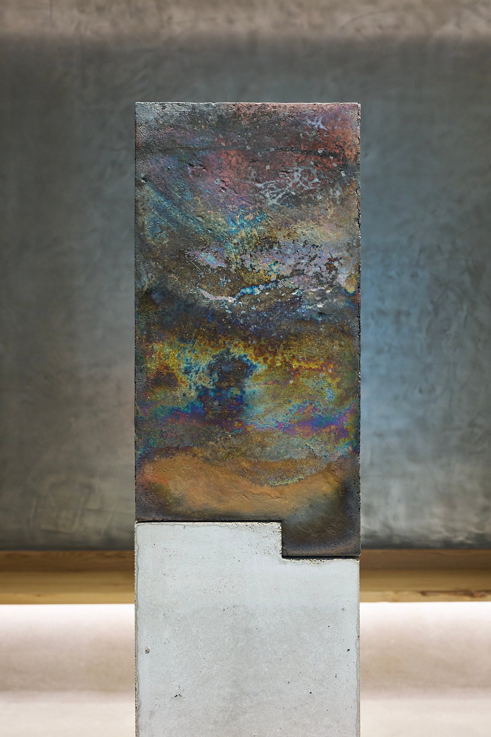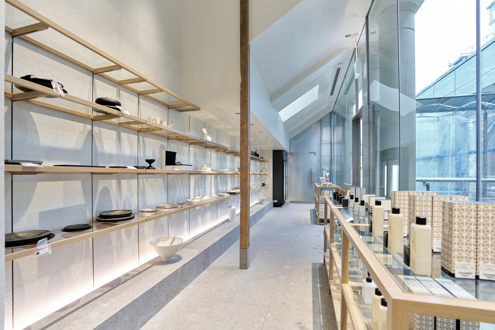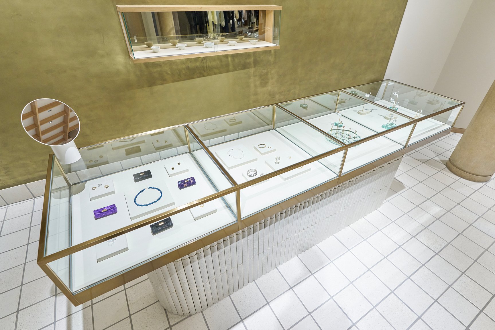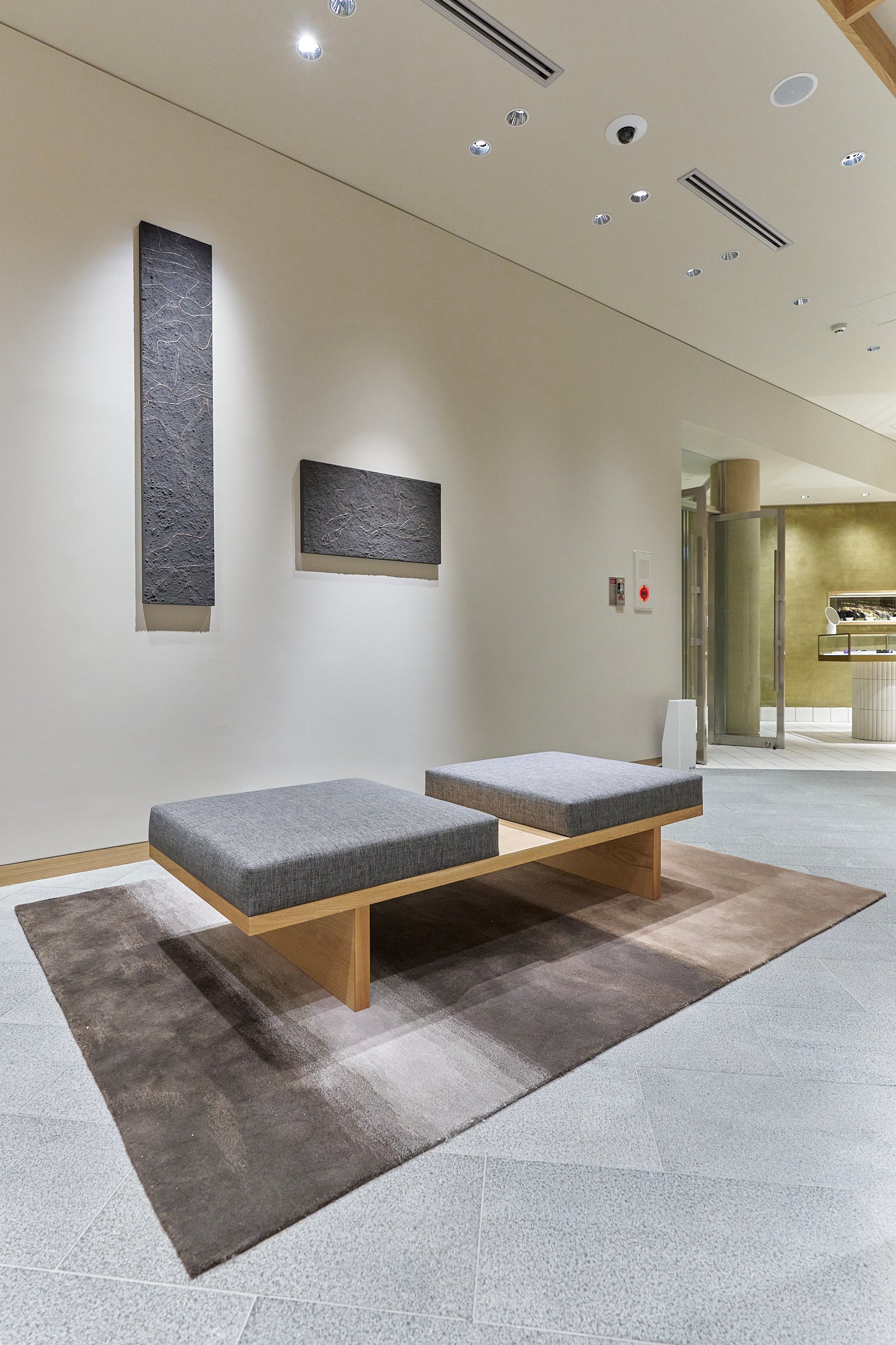 店舗内装や什器は、今回のリニューアルに伴い一新。内装には、荒壁仕上げの土壁や、真鍮や亜鉛を練り込んだ金色や銀色の左官壁、「三椏(みつまた)」を原材料とした和紙の壁をはじめ、京都産の山砂や南部石などを練り込んだ洗い出しの床、瀬戸産の土と多治見の砂を用いた特注タイルなど、国内の職人の手による伝統的技術が詰まった素材を採用した。
