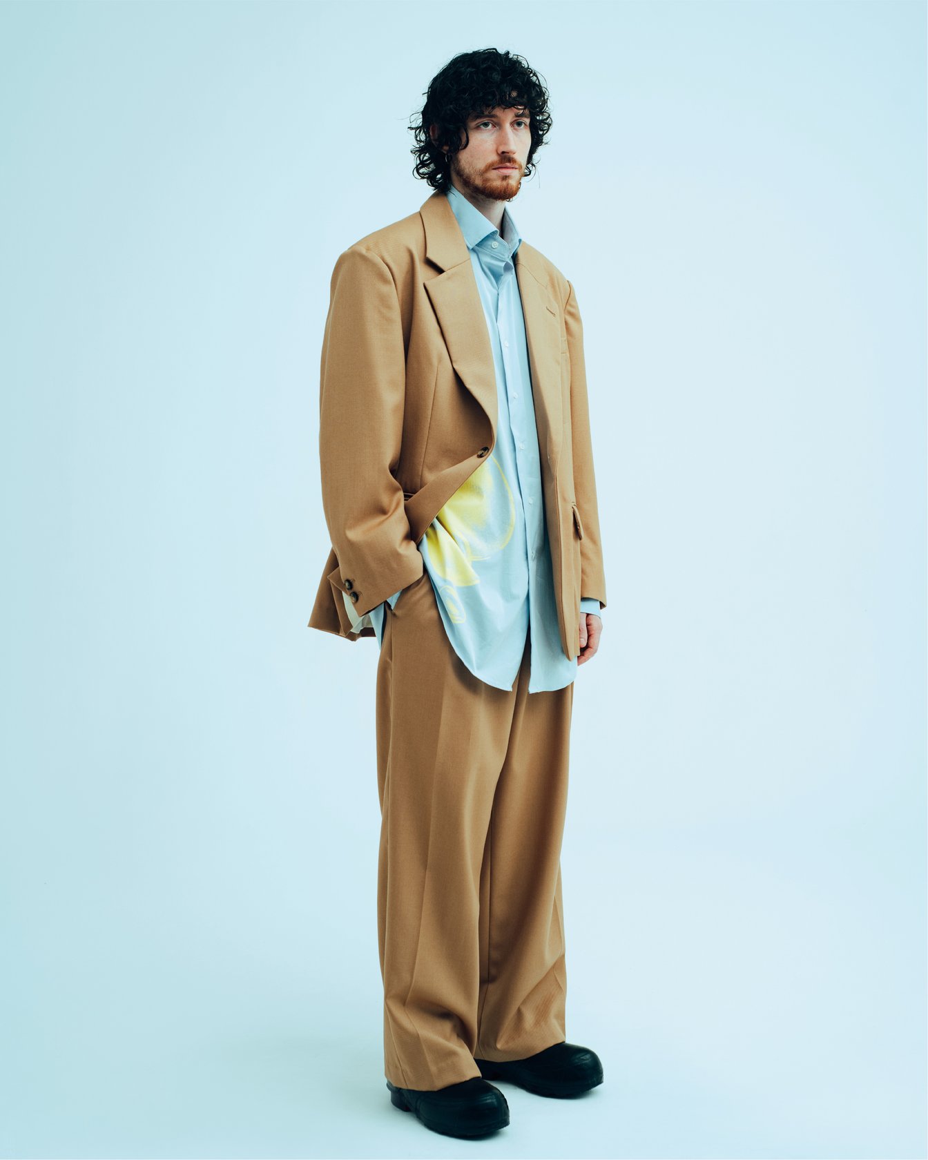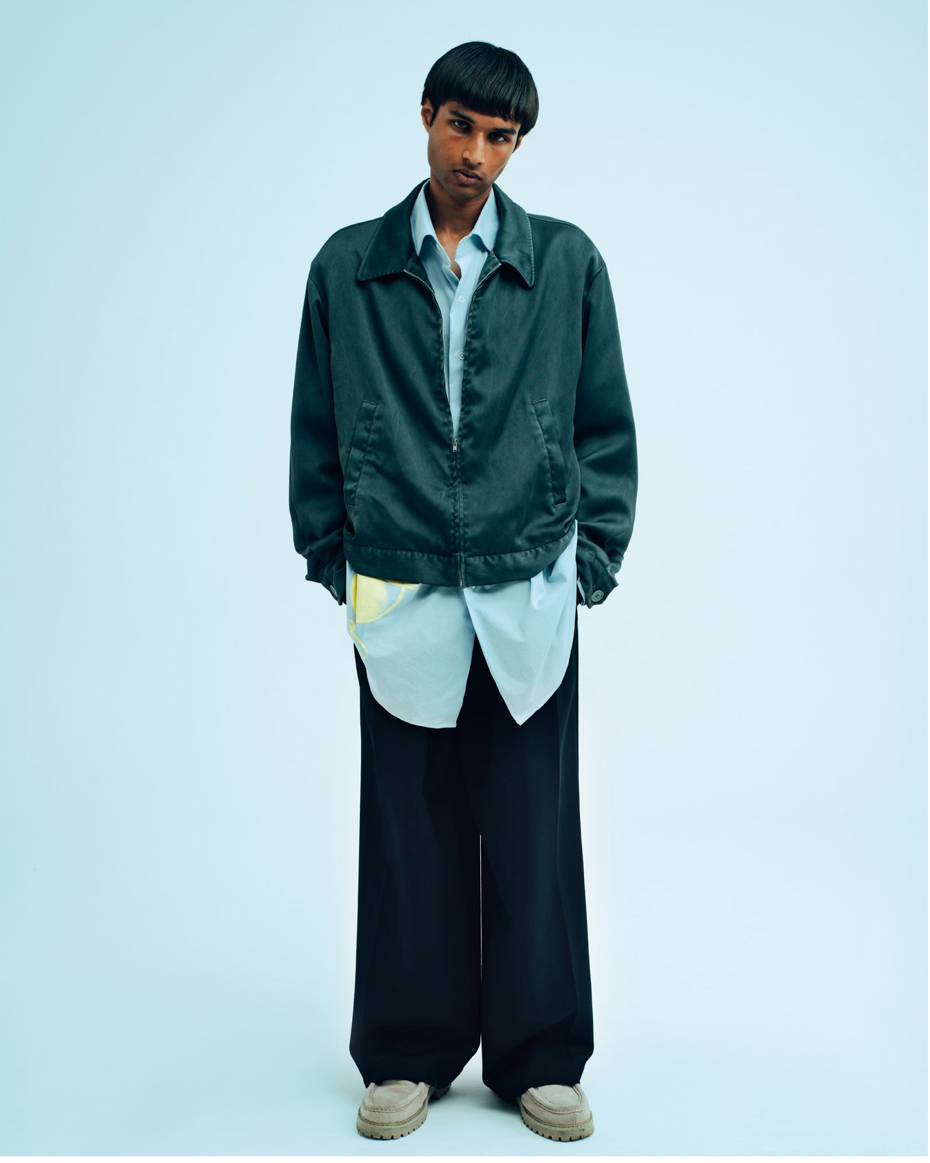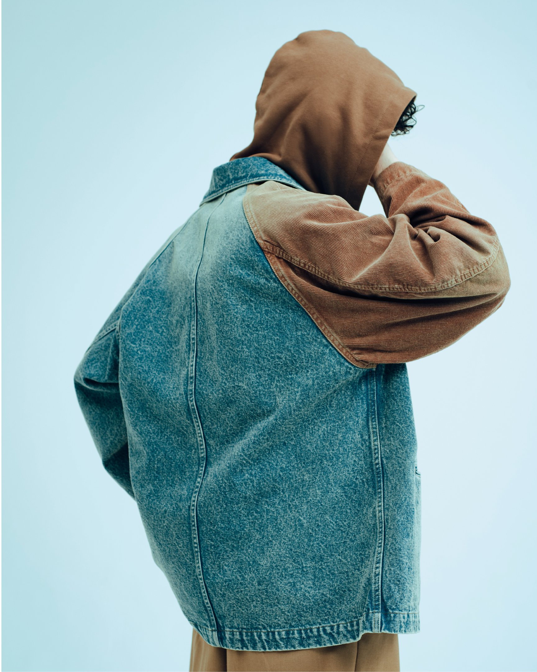 デビューコレクションとなる今シーズンは、「DIALOG(対話)」をテーマに製作。デザインチームや職人との打ち合わせを重ねる中で、効率性を偏重する社会で軽視される丁寧なコミュニケーション(=対話)こそが、物作りの本質だと気付いたという。学生時代から親交のあるアーティストに依頼したグラフィックや、岡山・倉敷の工場に通って試作を重ねたユーズド加工など、人と人との密な関係に基づく要素を盛り込んだ。