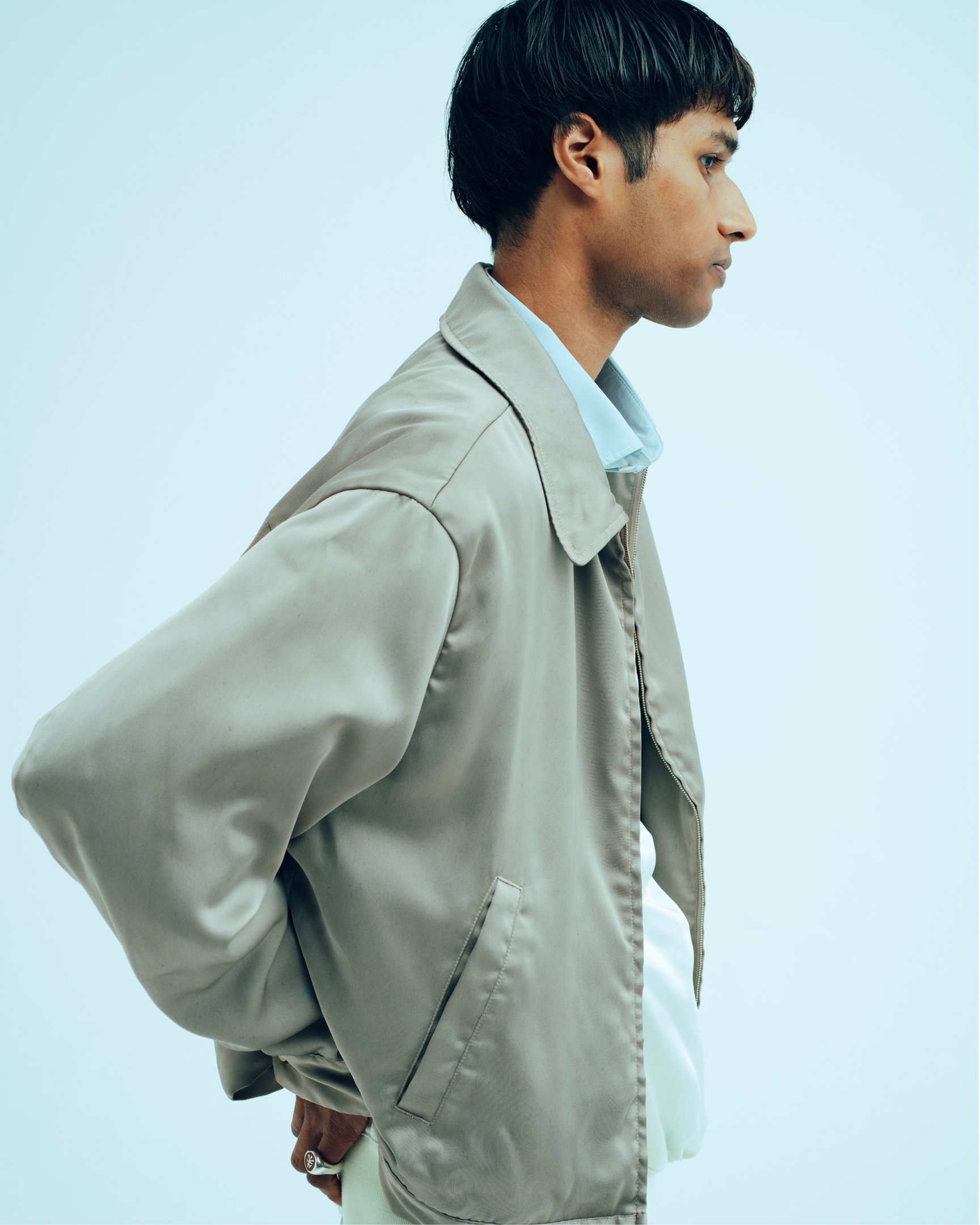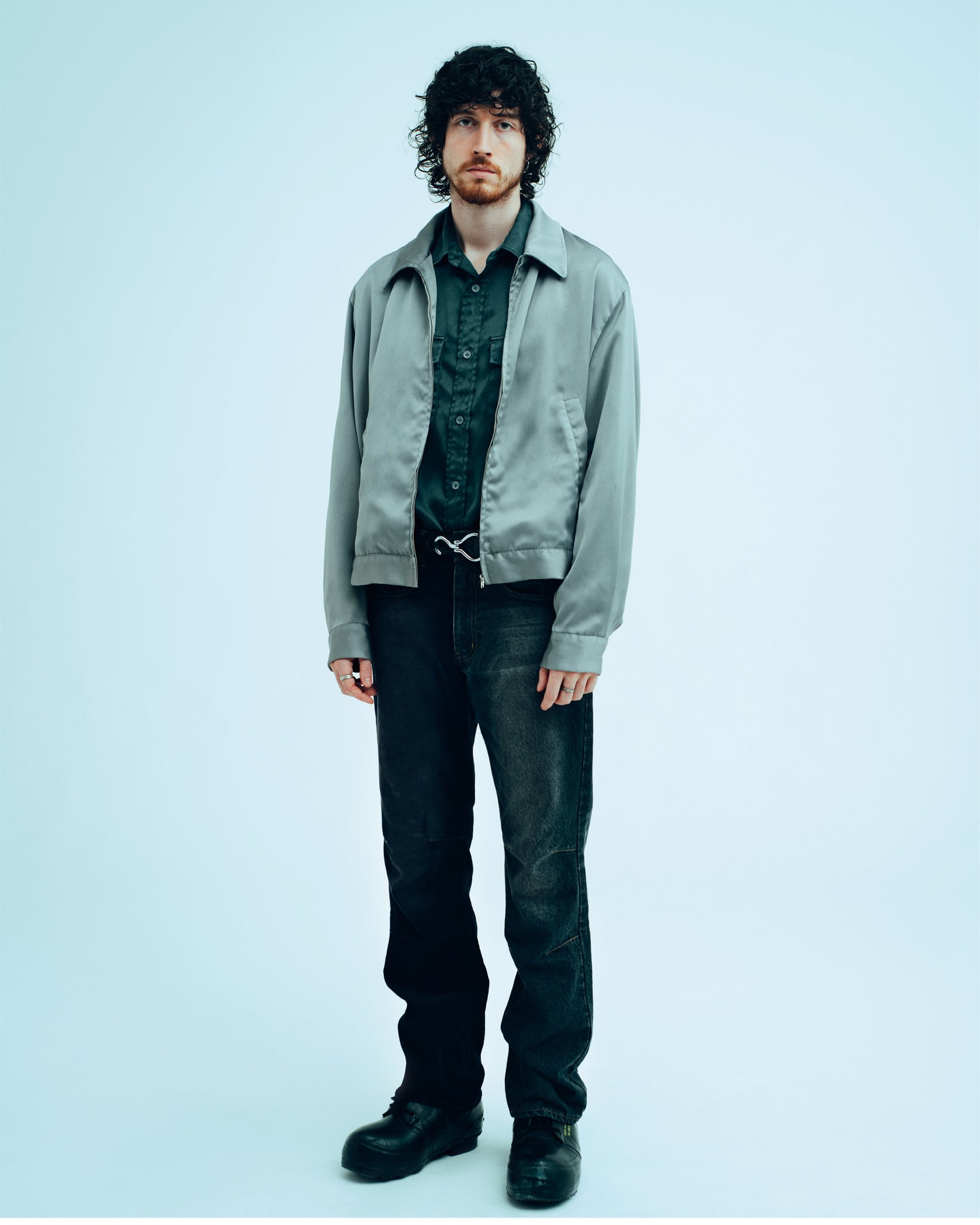 アイテムは、メンズウェアの定番であるテーラードスタイルやワークウェアを軸に展開。ピーター・リンドバーグ(Peter Lindbergh)による舞踏家 ピナ・バウシュ(Pina Bausch)のポートレートから着想を得たボクシーなジャケットは、胸ポケットの袋布をミシンで留めつけるワークウェアの仕様を取り入れた。また、ユーロヴィンテージがベースのワークジャケットはラグランスリーブにアレンジし、本来直線的な作りの服にダーツで丸みをプラス。スタンダードな衣服に正反対の要素を混ぜ込む手法は、サテン生地を用いたカレッジロゴのスウェットや、ブリーチしたコットンナイロン生地をホリゾンタルカラーに仕立てたシャツなどにも見られた。