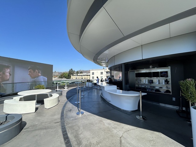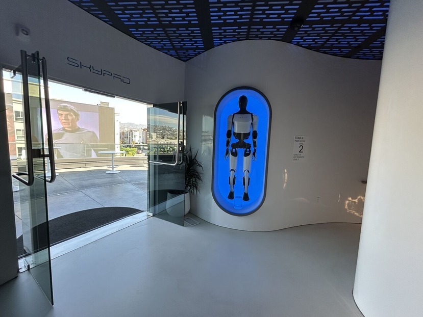 2階の屋外デッキでイートインスペース「スカイパッド(Skypad)」への出口にはヒューマノイド・ロボット「オプティマス(Optimas)」を”未来”を展示。横幅13メートルにもなる巨大スクリーンには”過去”映像のミスター・スポックが映し出されている。後ろには”現在”のアパートがあり、現在、過去、未来は、渡辺真知子か!