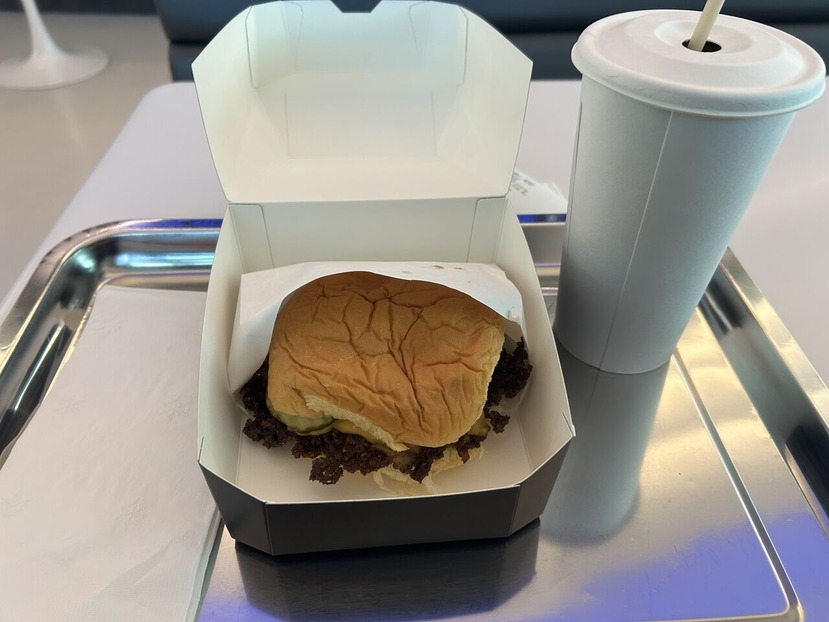 注文は店内のテーブルにあるタブレット端末から注文でき、テスラの所有者なら車内からアプリを介して注文ができるとなっていたが実際には入口で注文。支払いはクレジットカードやデビットカードのみでキャッシュは受け付けていない。テスラバーガーは飲み物を入れて20ドル!も味はシェイクシャックかと。