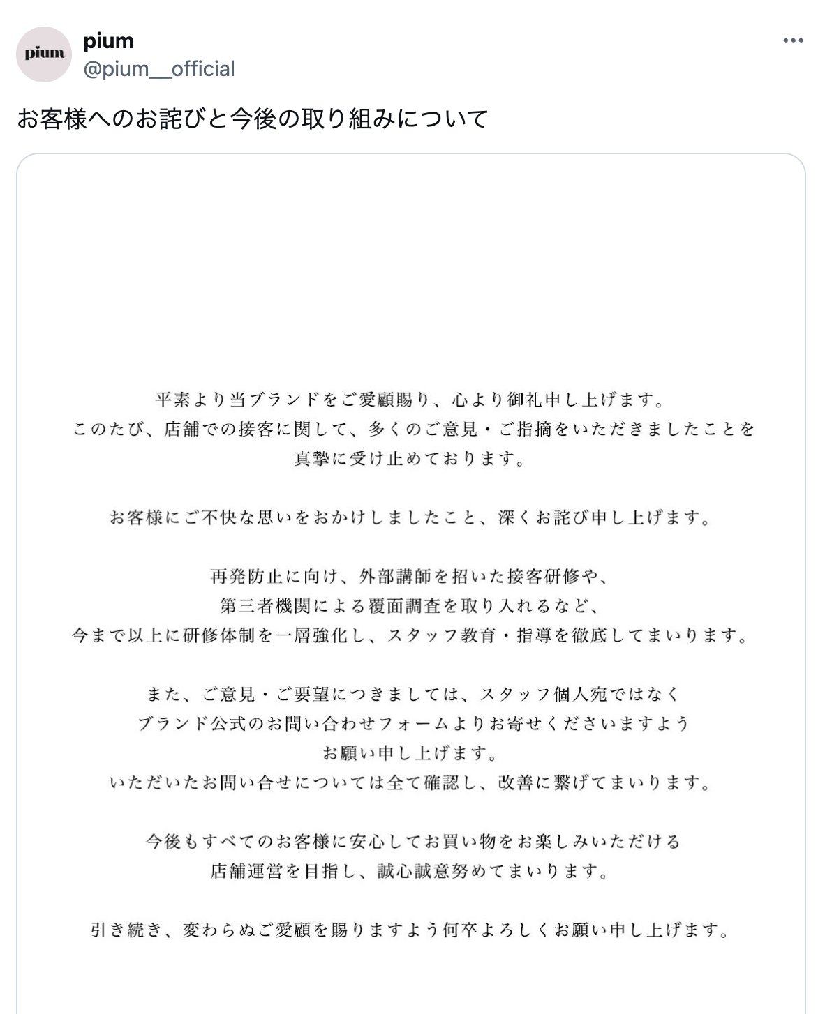アパレルブランド「ピウム」が謝罪 “カスハラ”への方針掲出から一転、スタッフの接客対応に不備