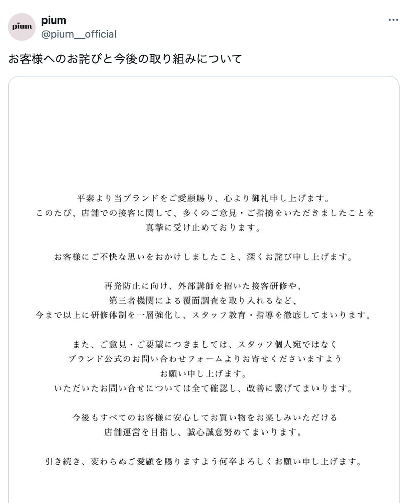 公式Xアカウントで同ブランドは「このたび、店舗での接客に関して、多くのご意見・ご指摘をいただきましたことを真摯に受け止めております。お客様にご不快な思いをおかけしましたこと、深くお詫び申し上げます。いただいたお問い合せについては全て確認し、改善に繋げてまいります。今後もすべてのお客様に安心してお買い物をお楽しみいただける店舗運営を目指し、誠心誠意努めてまいります。引き続き、変わらぬご愛顧を賜りますよう何卒よろしくお願い申し上げます」と綴った。