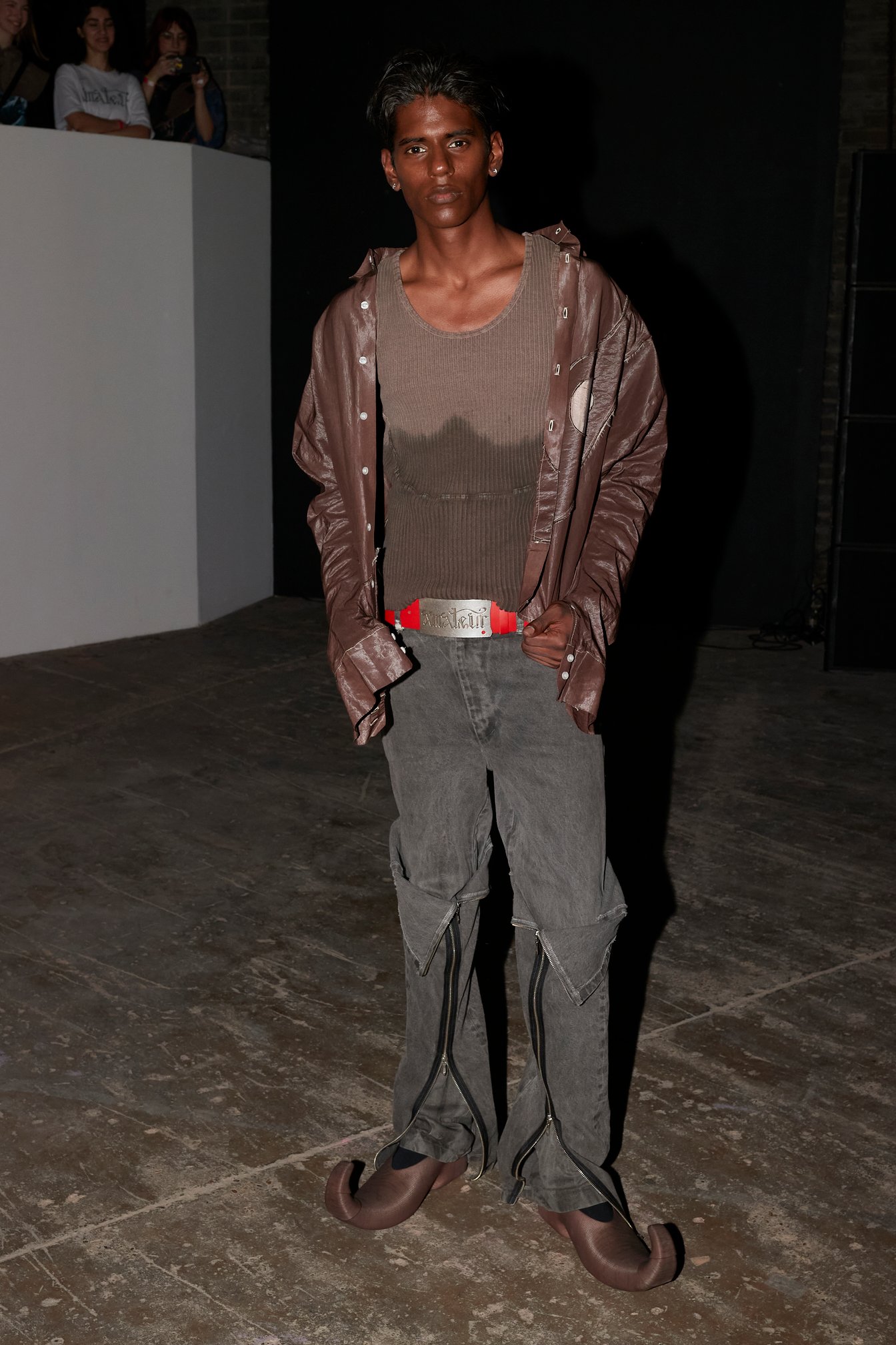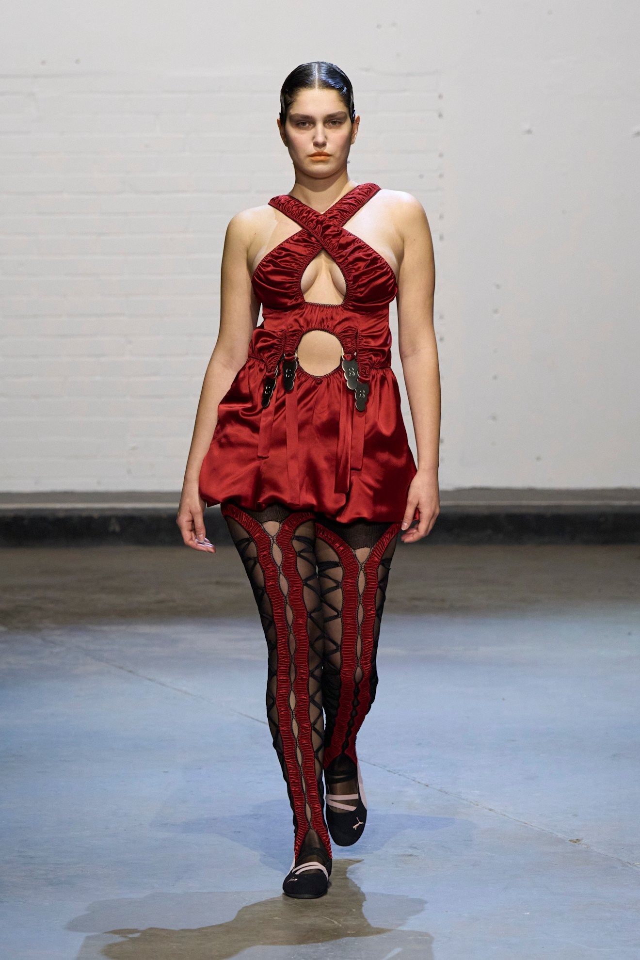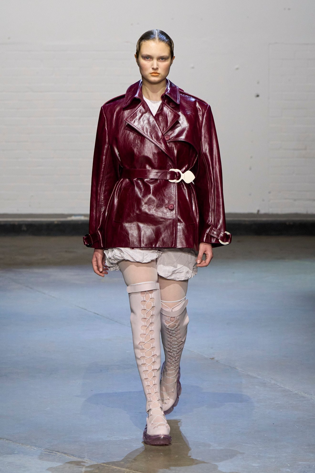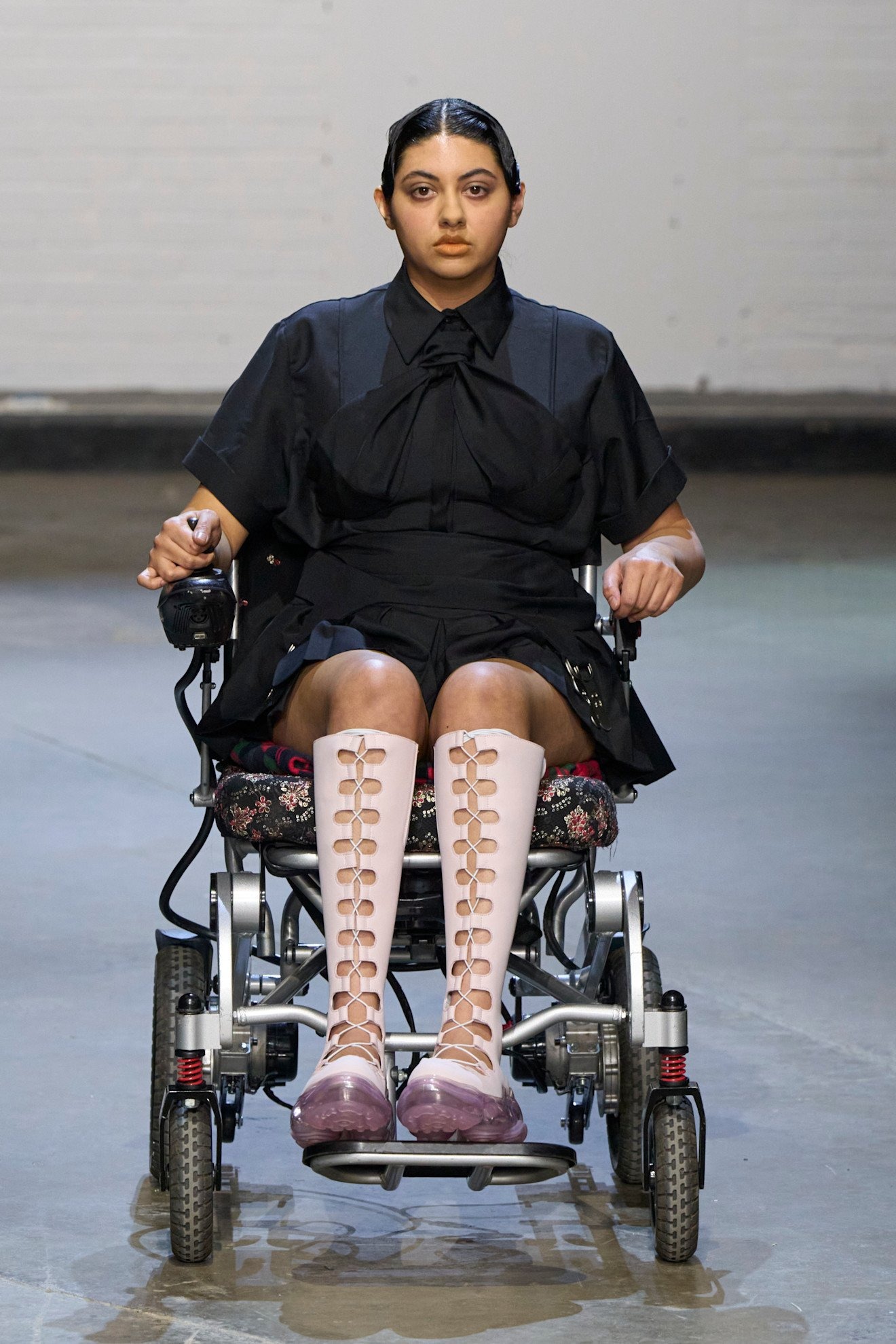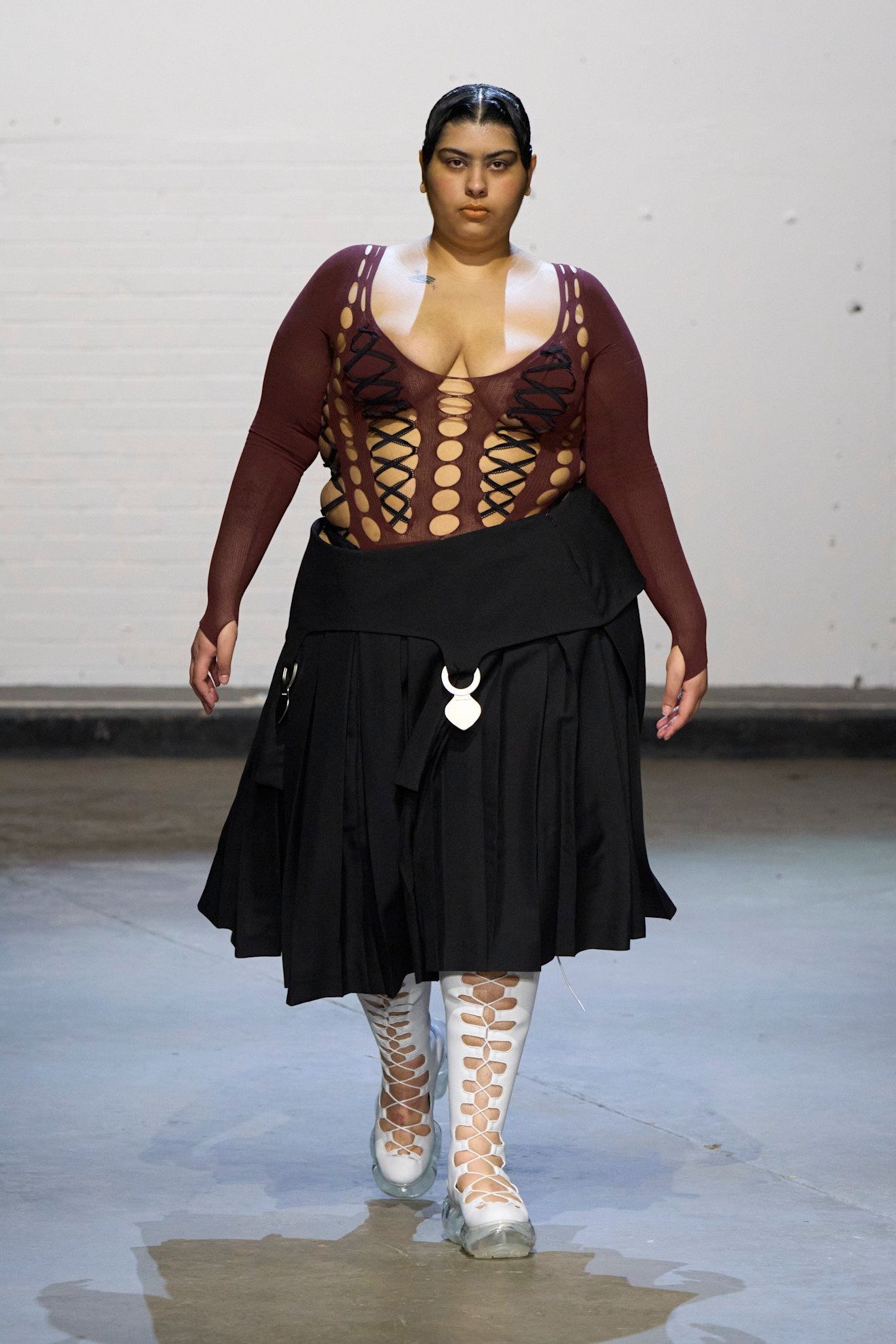 「多様性」という言葉が普及する現代社会の中で、メゾンからインディペンデントブランドまでさまざまな人種や体型のモデルを起用することは一般的となったが、その中でもどうしてもリアリティを感じられないものも中にはあるように思う。しかしシネイド・オドワイヤーには嘘がない。幅広い体型、車椅子利用者など多様なオーディエンスで賑わう現場から感じた。服作りのプロセスとしては、今までにシリコン成型や革新的なパターンメーキングに挑戦。ストレッチ性のあるレースアップを特徴としたシグニチャデザインは、機能性と同時に、着用者が身体を自由に誇らしく自分のものとして表現する自信を後押しをしていたように感じた。足元には2025年春夏でコラボレーションした「グラウンズ(grounds)」と再度協業し、レースアップしたようなデザインのハイブーツを展開した。