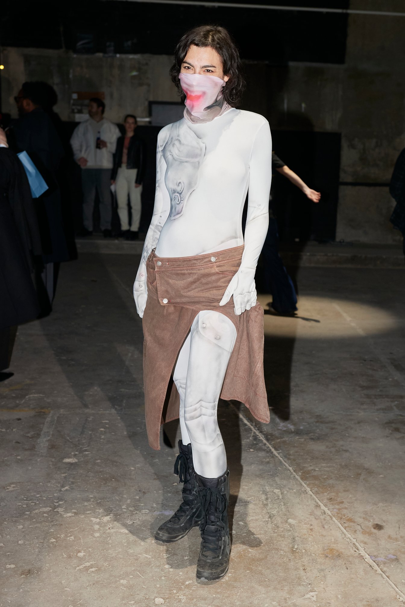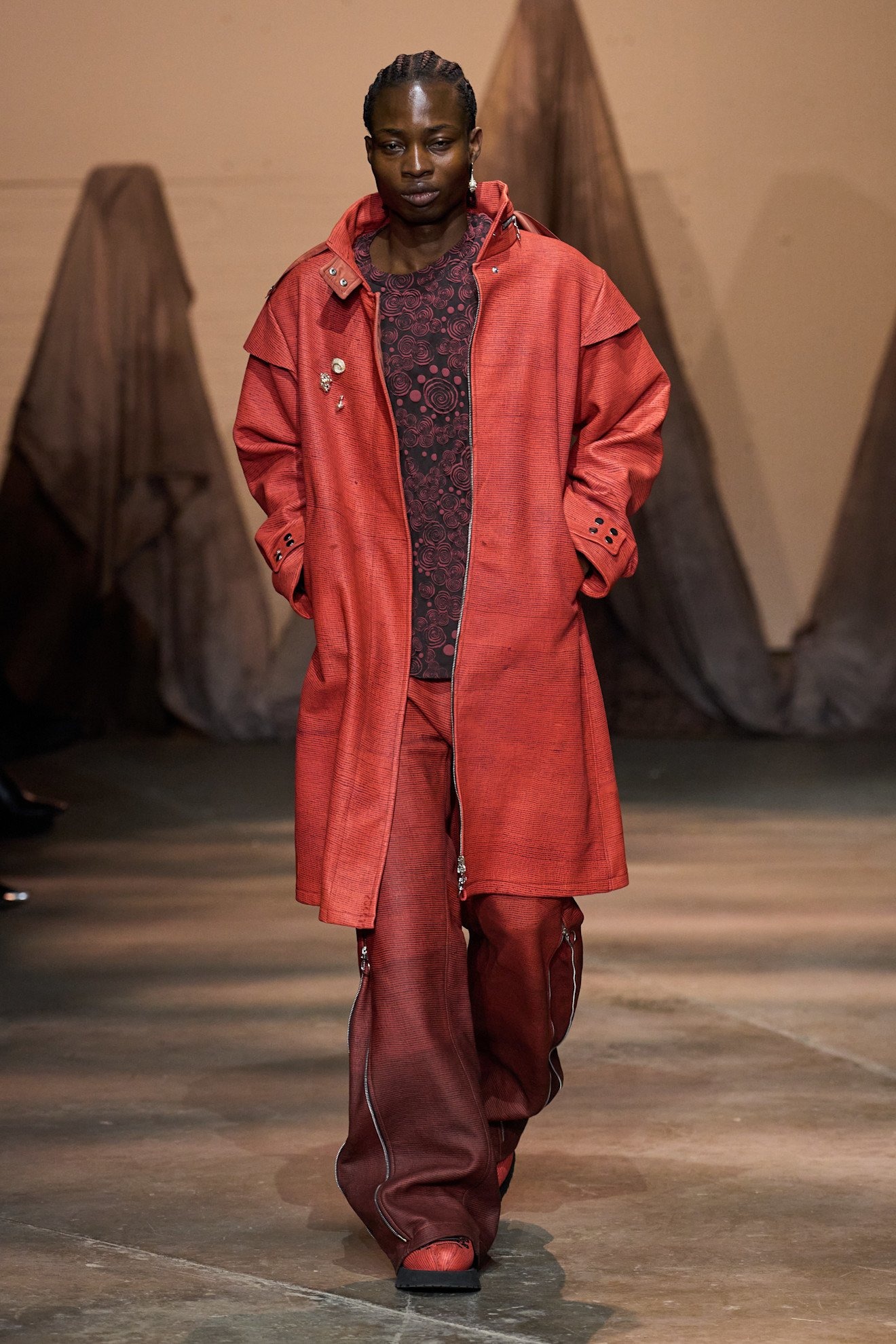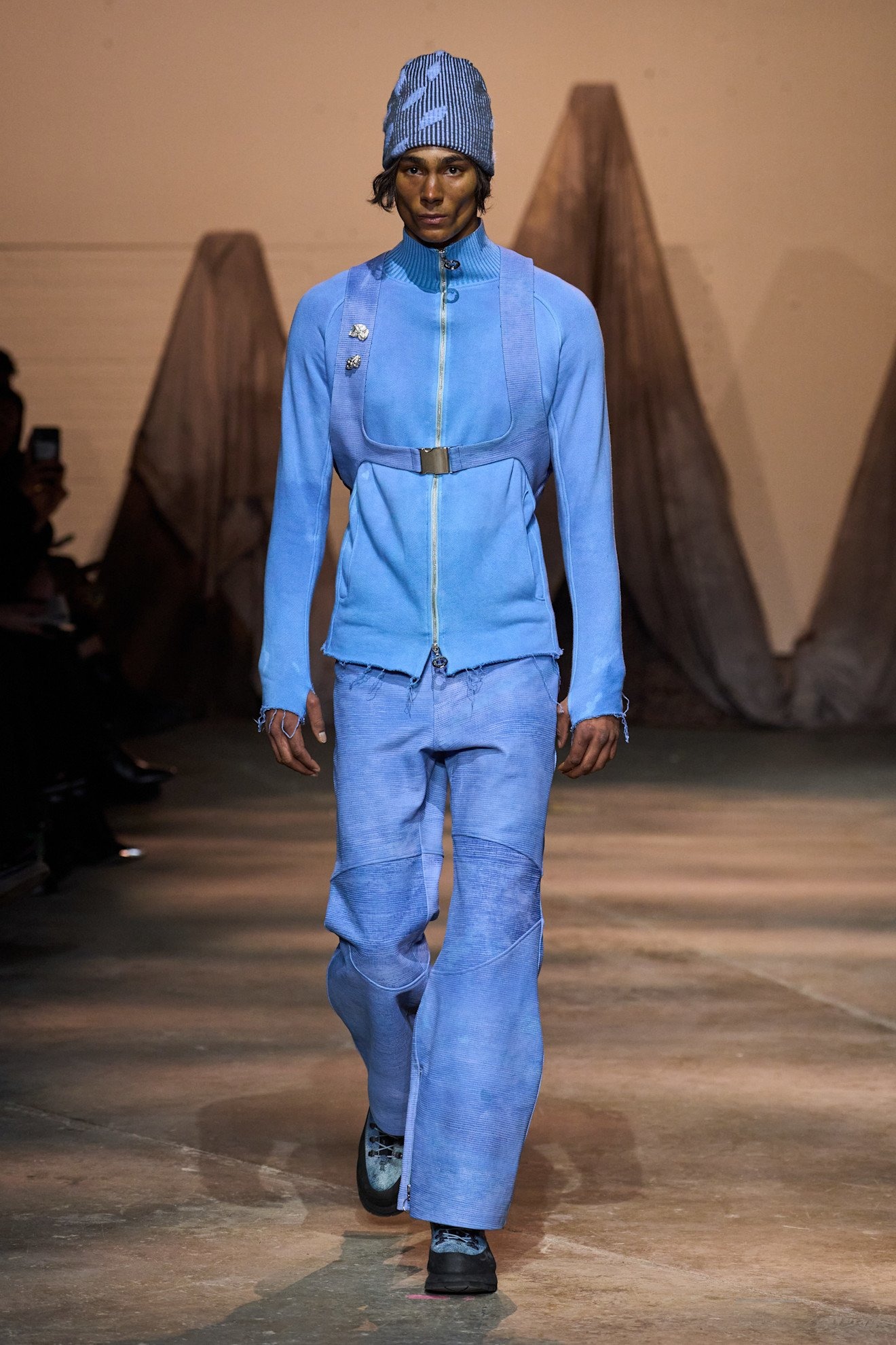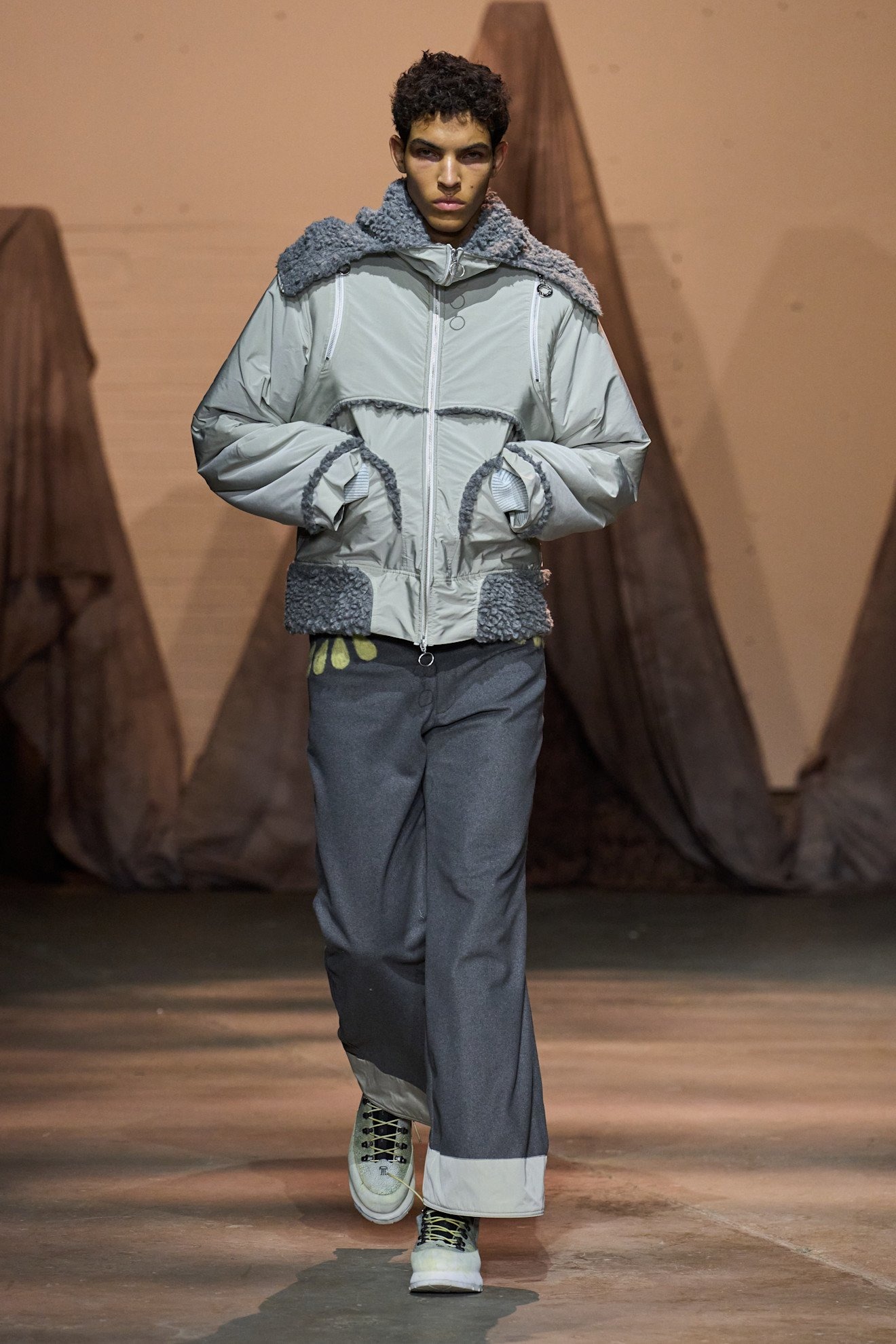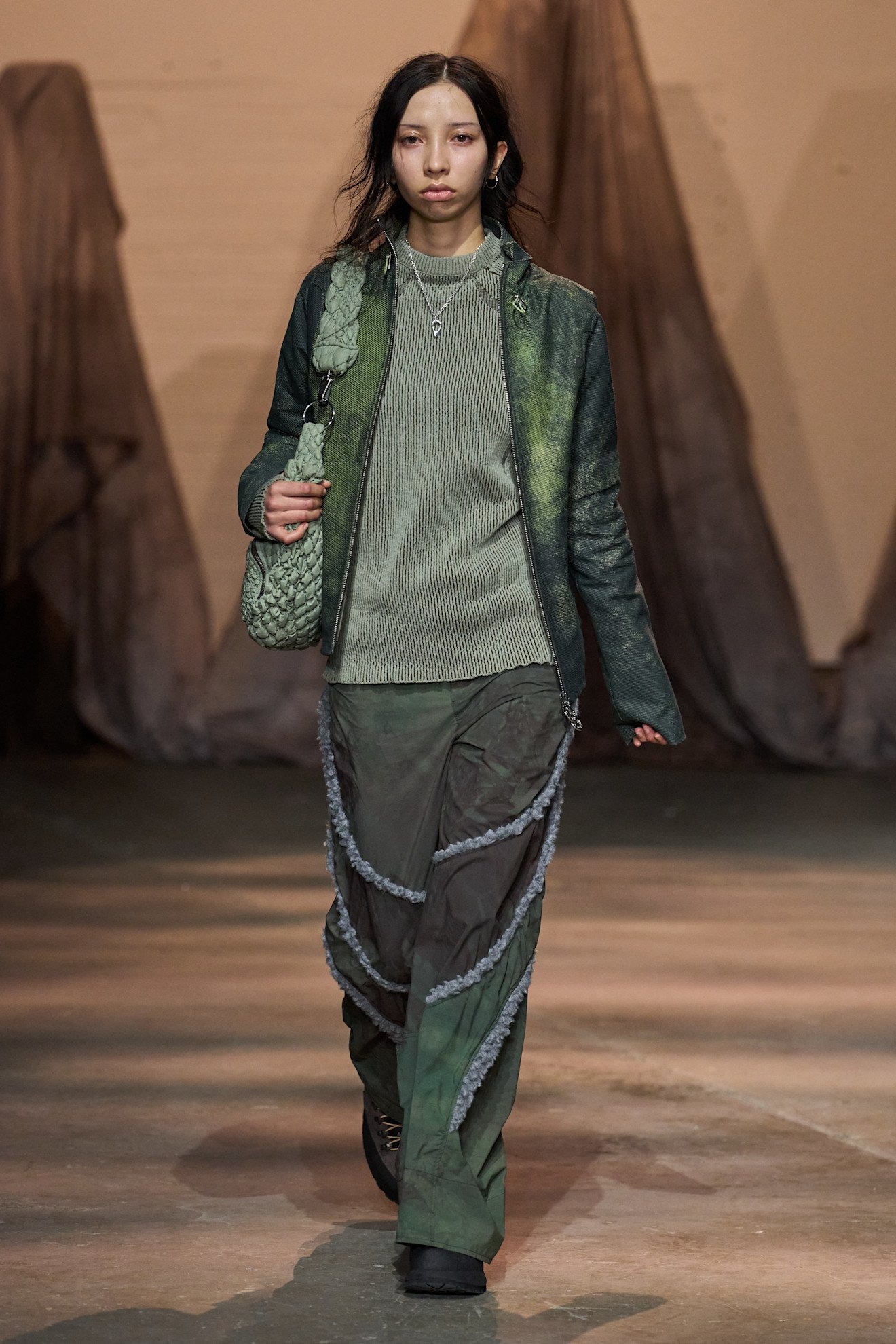 「多様性」という言葉が普及する現代社会の中で、メゾンからインディペンデントブランドまでさまざまな人種や体型のモデルを起用することは一般的となったが、その中でもどうしてもリアリティを感じられないものも中にはあるように思う。しかしシネイド・オドワイヤーには嘘がない。幅広い体型、車椅子利用者など多様なオーディエンスで賑わう現場から感じた。服作りのプロセスとしては、今までにシリコン成型や革新的なパターンメーキングに挑戦。ストレッチ性のあるレースアップを特徴としたシグニチャデザインは、機能性と同時に、着用者が身体を自由に誇らしく自分のものとして表現する自信を後押しをしていたように感じた。足元には2025年春夏でコラボレーションした「グラウンズ(grounds)」と再度協業し、レースアップしたようなデザインのハイブーツを展開した。