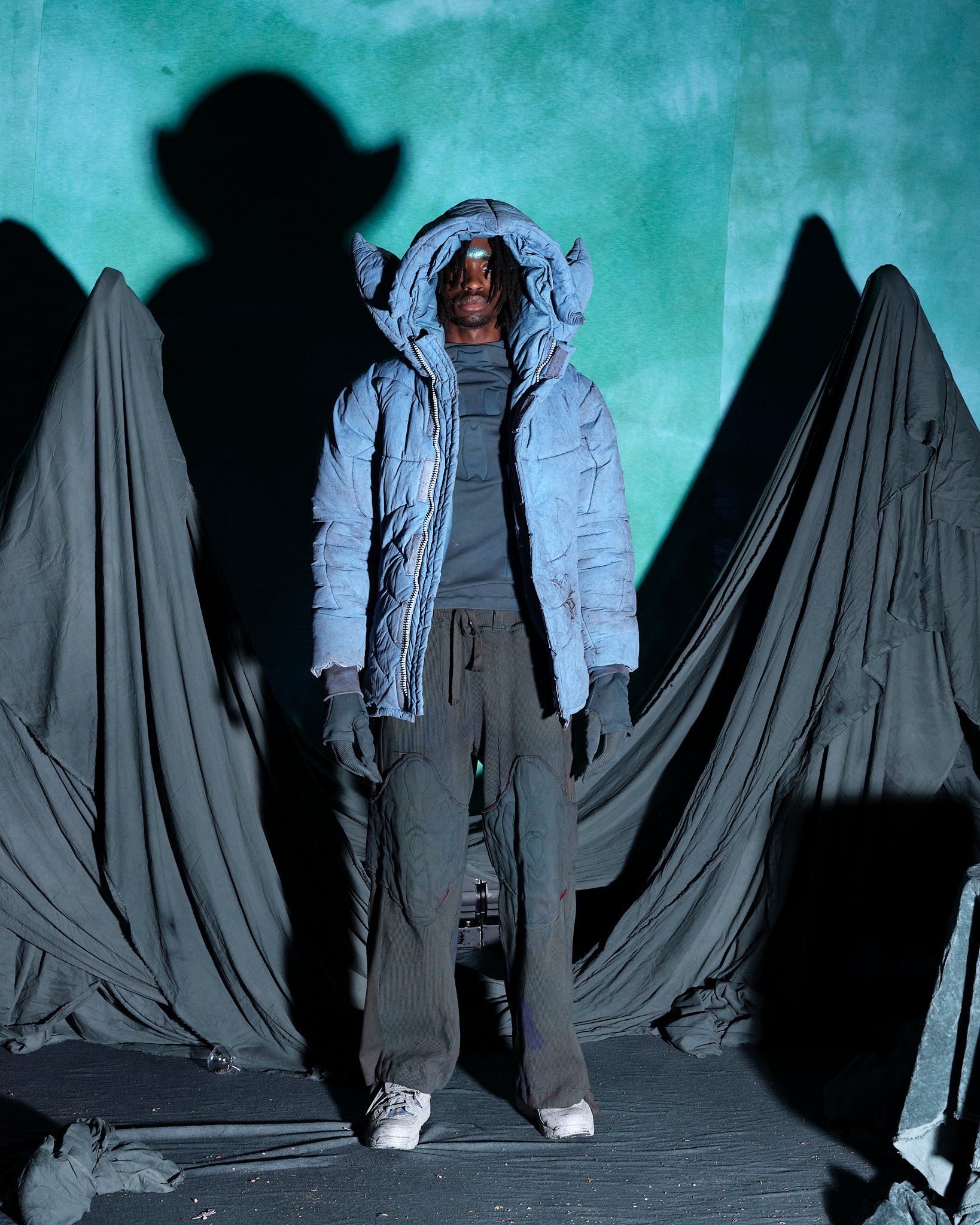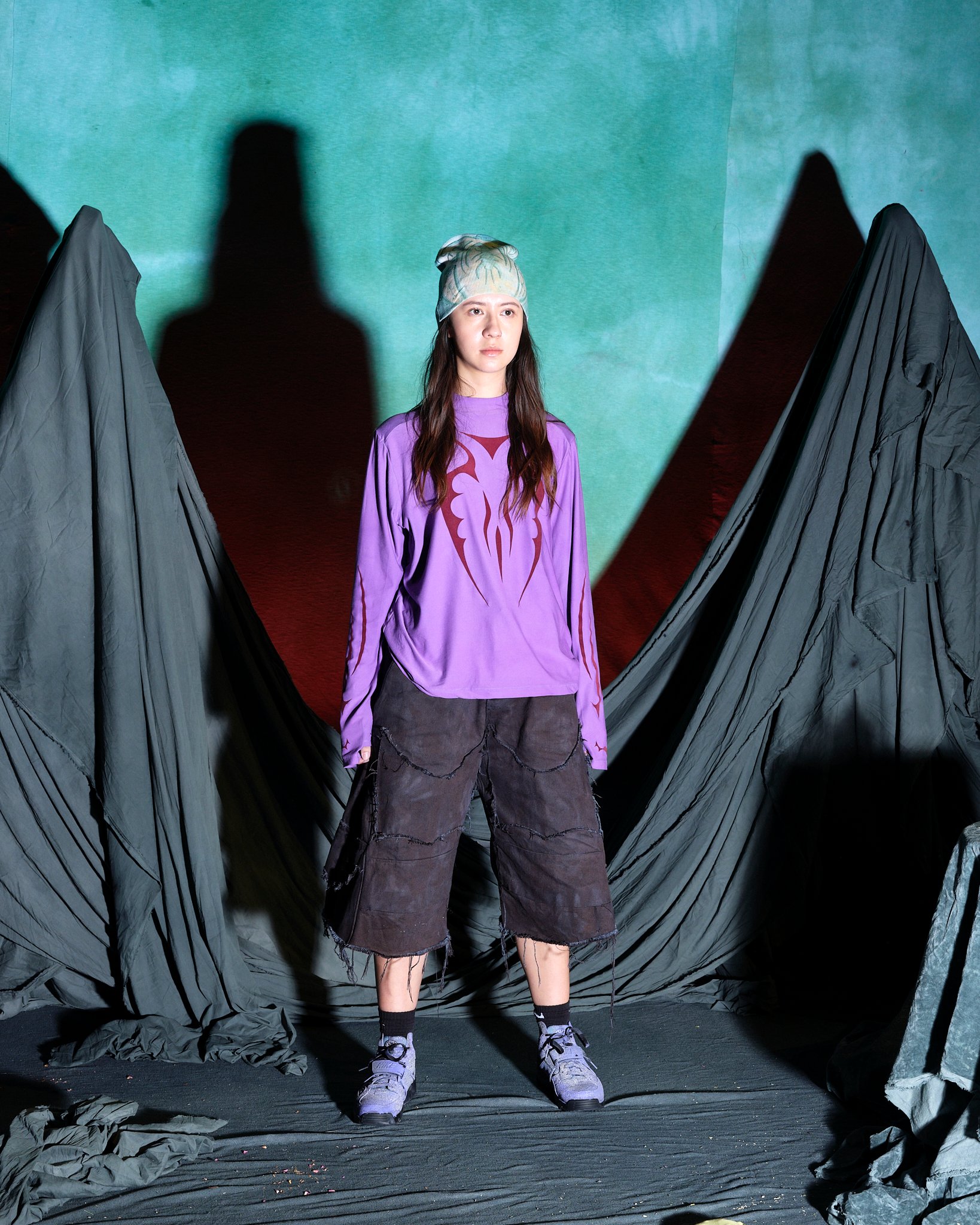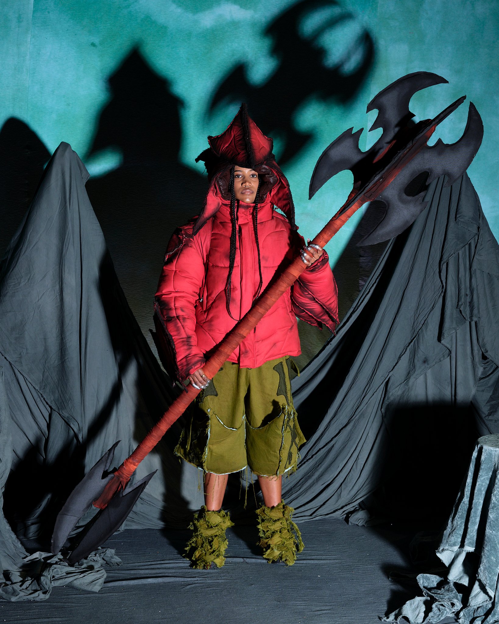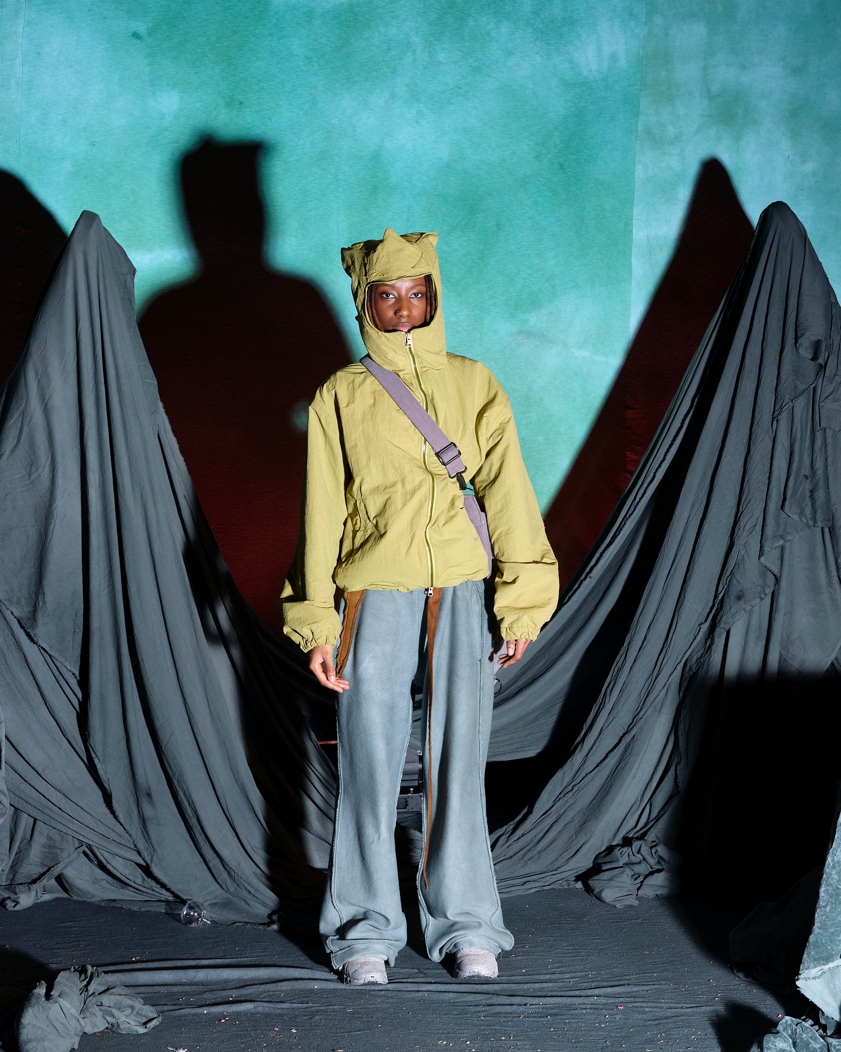 チャーリー・コンスタンティノウが尊敬するブランドのうちのひとりとして挙げるのが、「ヤク(YAKU)」。NENGENのトリを飾り、ナラティブ性の強いワークショップ形式のプレゼンテーションを発表した。入り口で渡されたパスポートのようなノートとペンを持って会場に入ると、ノートに書いてある7問のパーソナル診断のアンケートを答えるように促される。「決断を促す最後の決め手は?」、「グループの中でどのような役割になることが多い?」など自身の性格を考えさせられるような芯をついた質問に答えたすえ、水たまりのような演出がされた受付でスタッフにノートを見せると自身の性格を表すようなキャラクターのシールと缶バッチが渡される。(筆者はコンバットだった)、奥に入ると、さまざまなクリチャーを演じるモデルたちが横並びでファンタジーの世界を描く。「The ImPossible Family Reunion in RPG Space 」と題したコレクションタイトルをよく見ると、「Im」に取り消し線がはいり、「Possible」と強調させている。それは、あるファンタジーの種族を主人公に辛い過去と未来への希望を見出した前章から続くストーリーとして、また新たな未知なる未来へ突入する前夜を描いているのだという。