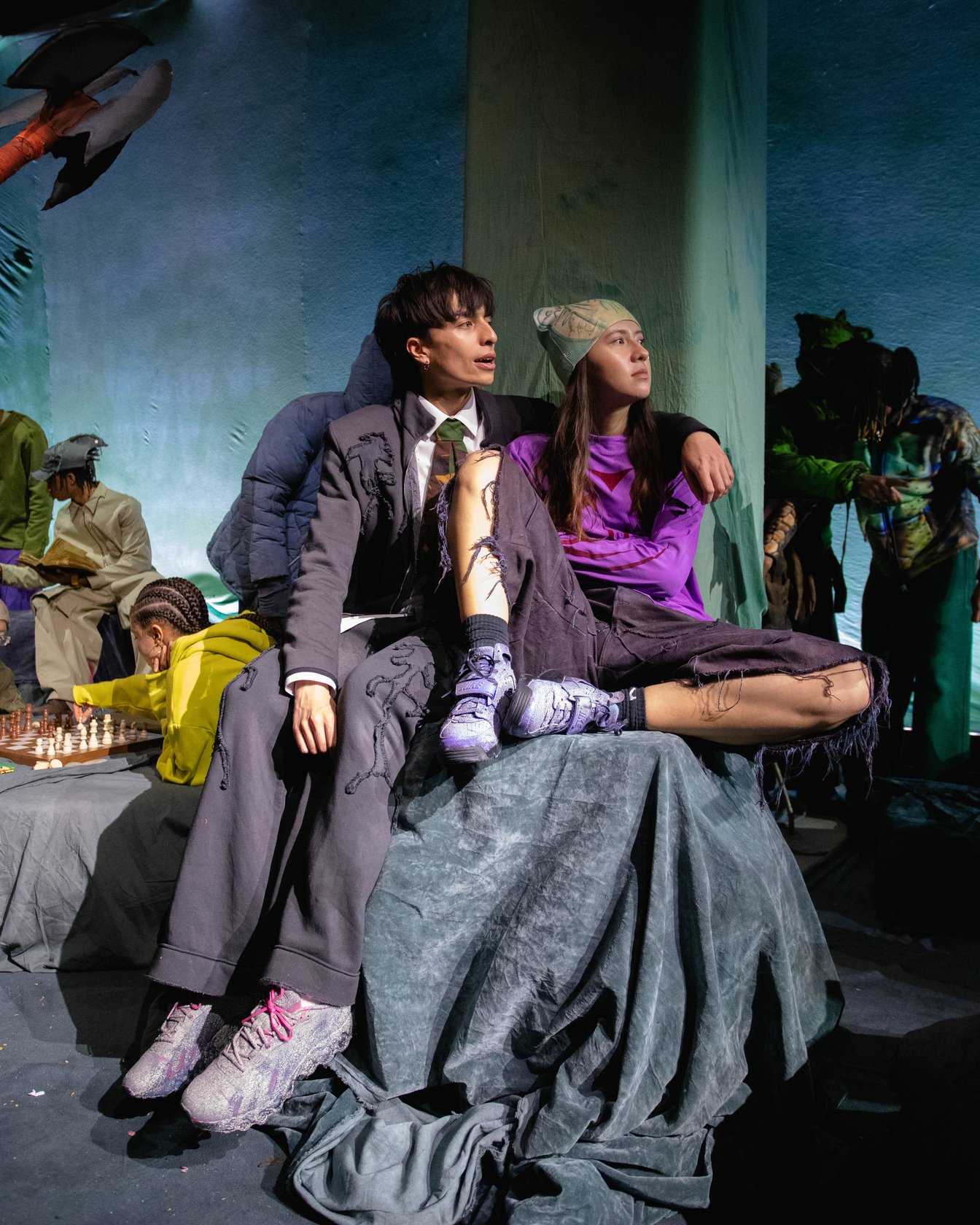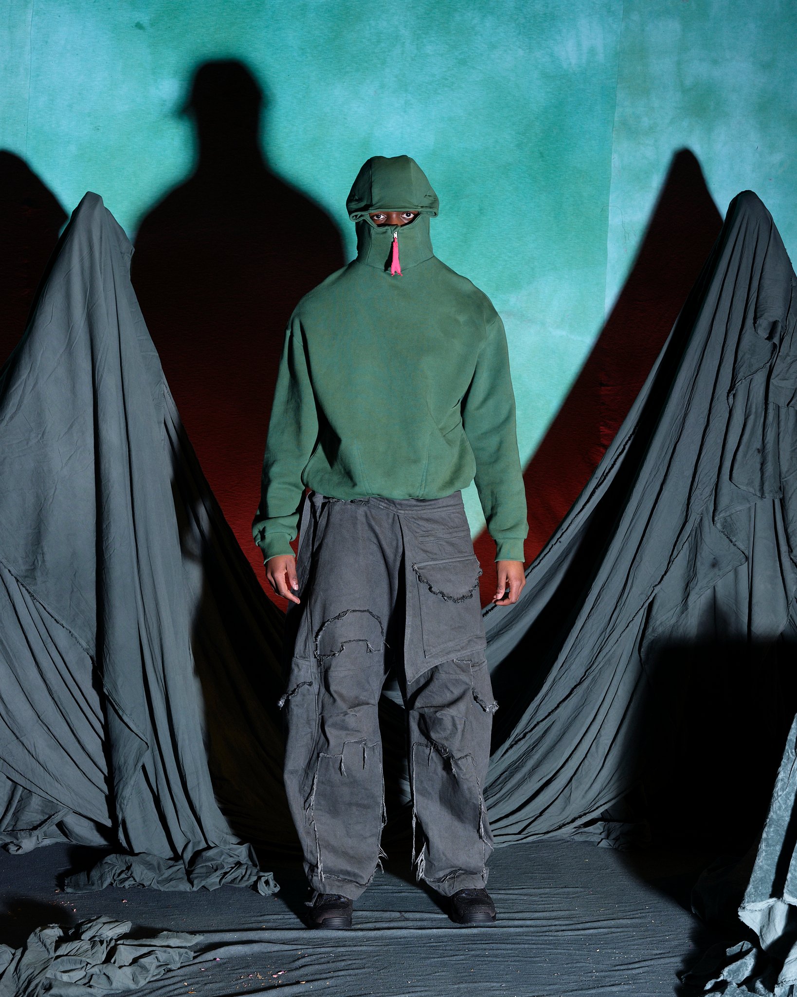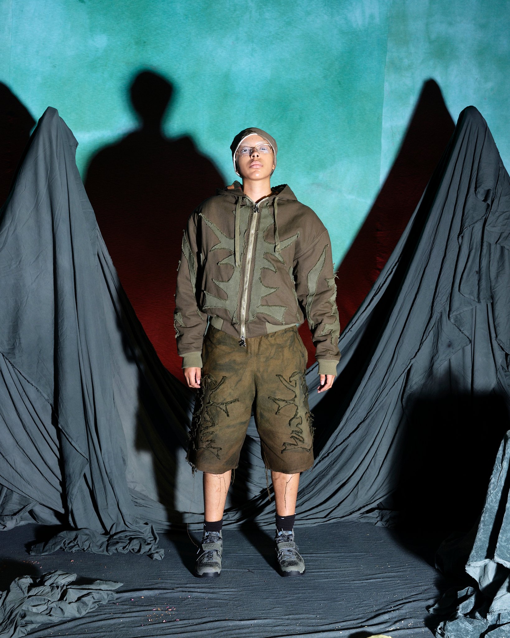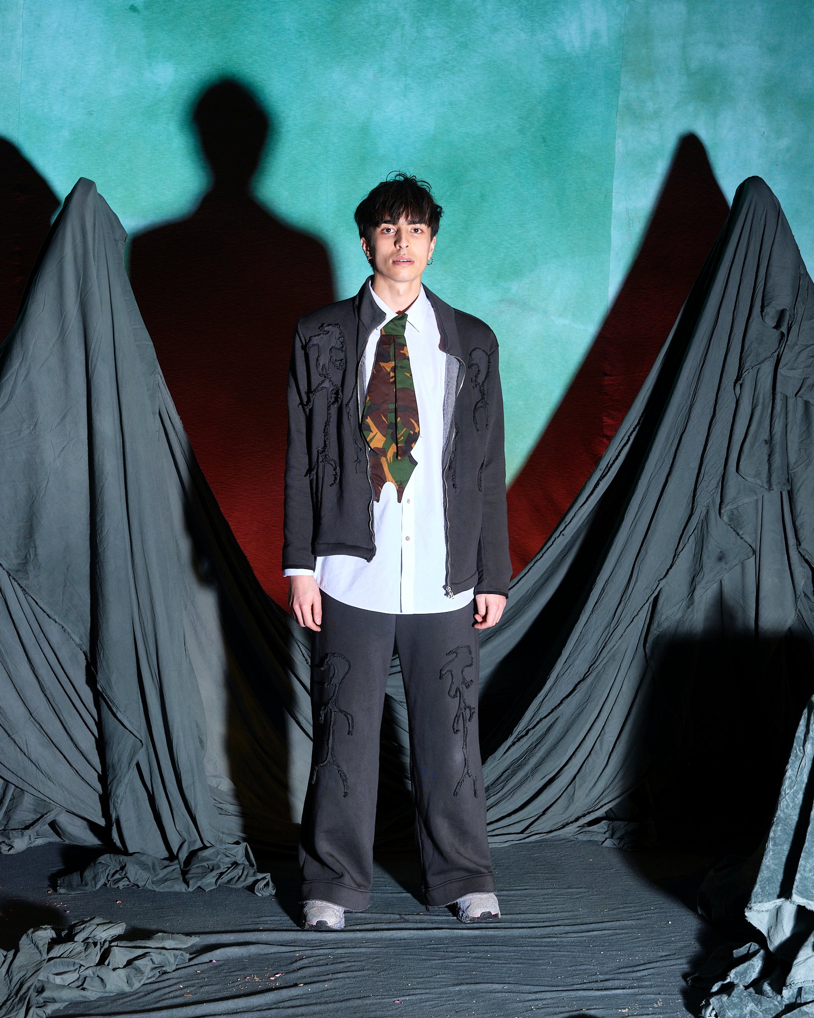 チャーリー・コンスタンティノウが尊敬するブランドのうちのひとりとして挙げるのが、「ヤク(YAKU)」。NENGENのトリを飾り、ナラティブ性の強いワークショップ形式のプレゼンテーションを発表した。入り口で渡されたパスポートのようなノートとペンを持って会場に入ると、ノートに書いてある7問のパーソナル診断のアンケートを答えるように促される。「決断を促す最後の決め手は?」、「グループの中でどのような役割になることが多い?」など自身の性格を考えさせられるような芯をついた質問に答えたすえ、水たまりのような演出がされた受付でスタッフにノートを見せると自身の性格を表すようなキャラクターのシールと缶バッチが渡される。(筆者はコンバットだった)、奥に入ると、さまざまなクリチャーを演じるモデルたちが横並びでファンタジーの世界を描く。「The ImPossible Family Reunion in RPG Space 」と題したコレクションタイトルをよく見ると、「Im」に取り消し線がはいり、「Possible」と強調させている。それは、あるファンタジーの種族を主人公に辛い過去と未来への希望を見出した前章から続くストーリーとして、また新たな未知なる未来へ突入する前夜を描いているのだという。