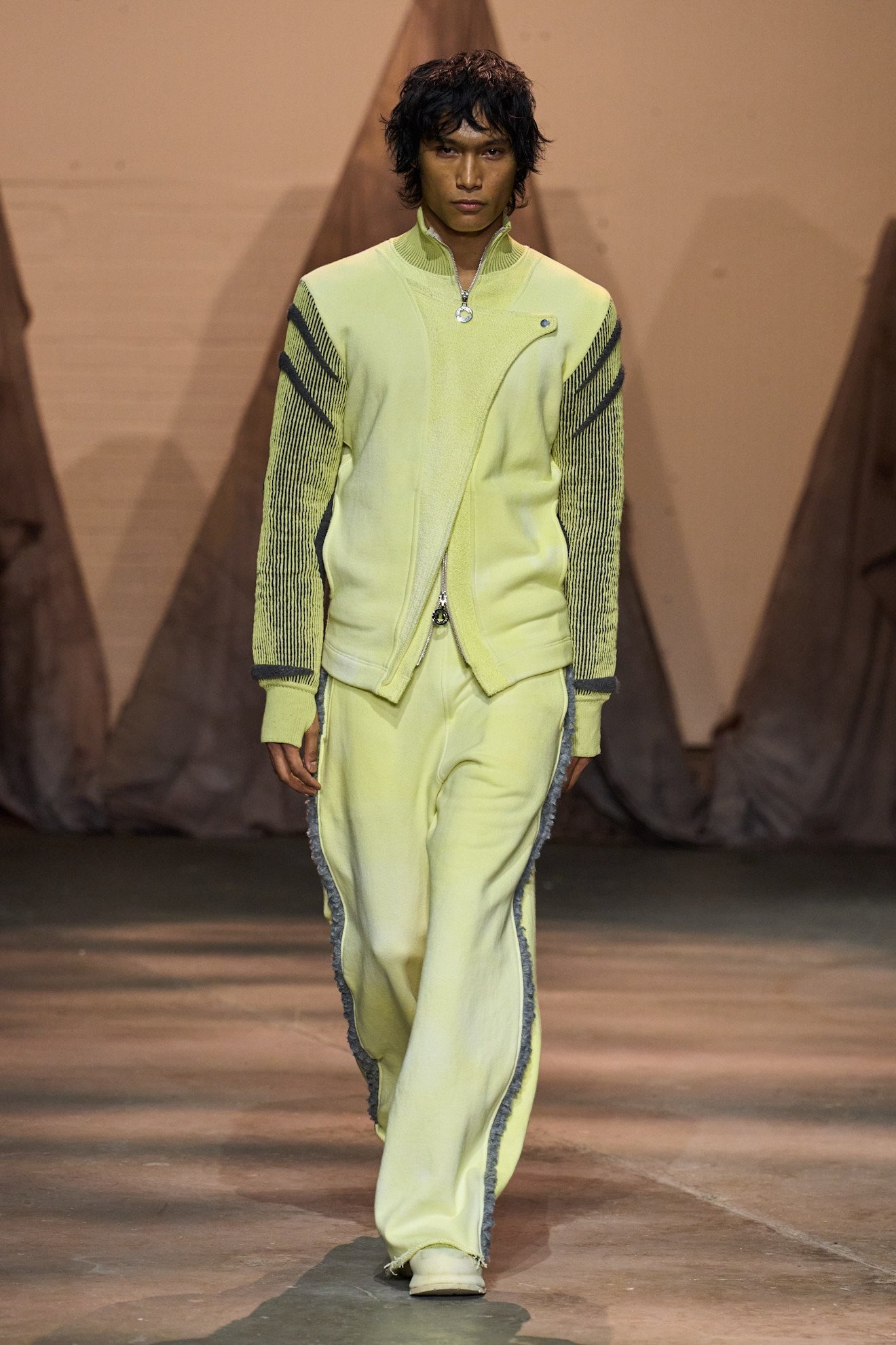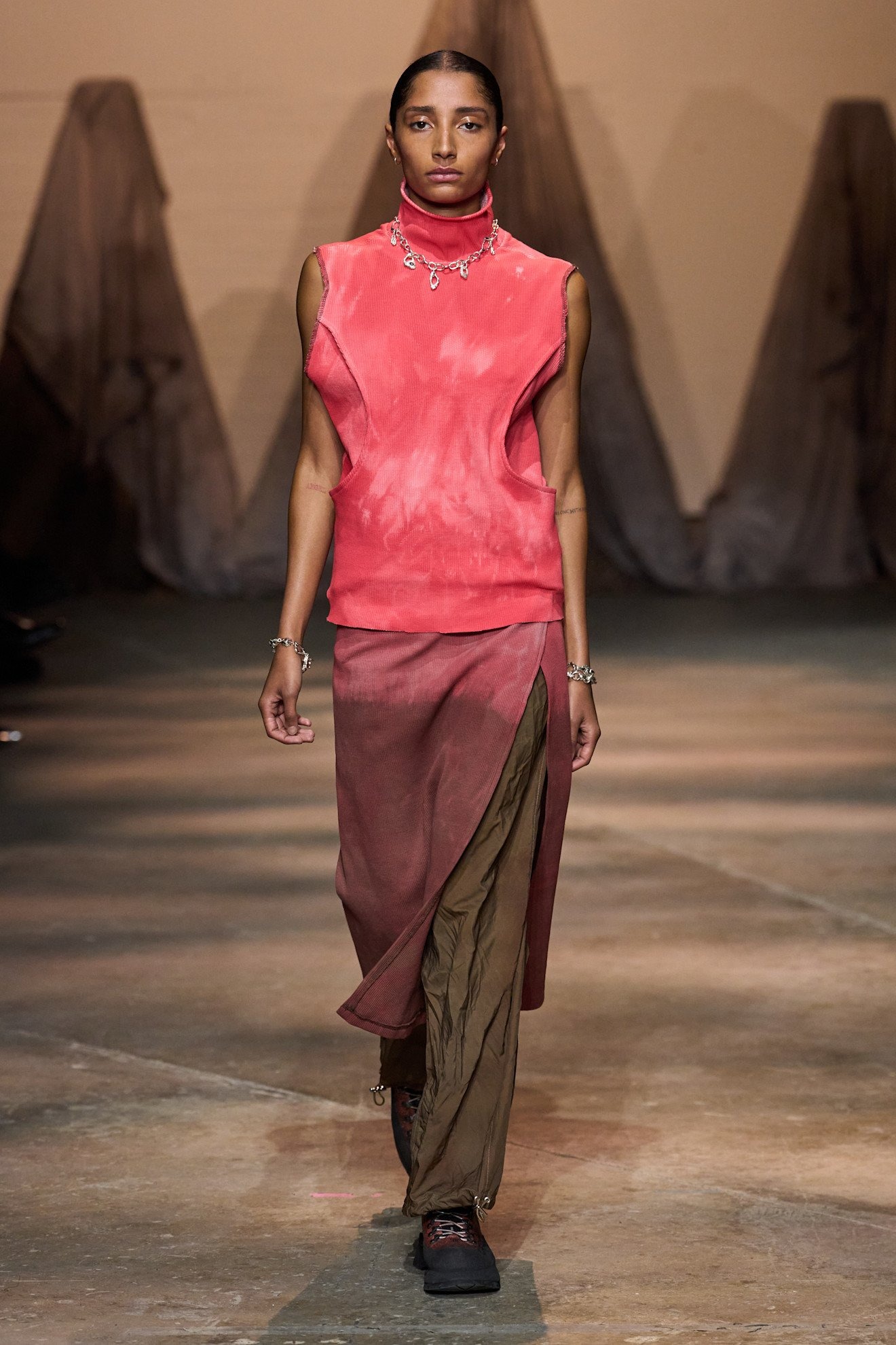 とはいえ、イギリス生まれのキプロス人デザイナーというルーツから、ブランドのコアの美学には、さまざまな帝国に支配された歴史を持つキプロスという島に残る遺跡や神話、自然の色合いがある。「Season 4.5」と題した本コレクションでは、前回のコレクション「4」の続きとして、サハラ砂漠の風景を彷彿とさせる会場セットに包まれ、寒暖差をグラデーション的に表現するカラーパレットとスタイリングが登場した。シグニチャである染色技術をふんだんに使ったカラーパレットは、イエローから、ブラウン、グリーン、ブルー、グレー、パープル、ピンク、レッドへとショー全体を通して移いを見せる。そのさまは、日没前・後を表現するような詩的な表現であり、同時にアイテムとしても薄着から寒暖差を防ぐアウターまで機能性も兼ね備えたものだった。他にも雑誌「1Granary」の協力のもとECCOレザーとのコラボによって、新たなテクスチャ表現を目指して実験的な取り組みを行った。