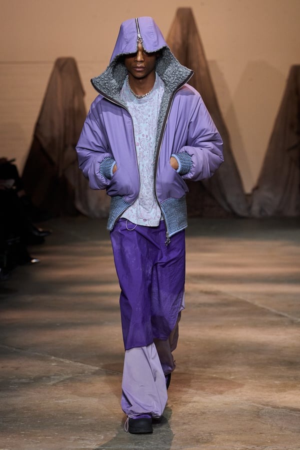 デザイナーのマリー・リューダー(Marie Lueder)は、ロンドン・カレッジ・オブ・アートを卒業後の2019年にブランドを創設。一見ただ単なるカジュアルウェアに見える服たちは、ハンブルク国立歌劇場でテーラーとして働いていた彼女のバックグランドをもとに、複雑性のあるテーマをしっかりと服に落とし込む技量を見せる。画期的なシルエットに挑戦したというパンツは、従来のスキニーパンツへの再考として取り外し可能なレイヤードを加えた。また巻型のスリットスカートが描く曲線は本コレクションで曖昧にしたかったという性別の境界線を軽やかに自然体で超えてきた。ほかにも活動当初から継続したサステナブルの取り組みにも熱心で、木材パルプから作られたフェイクファーコートや食肉産業からの副産物的に出てきたレザーを使ったジャケットが登場した。