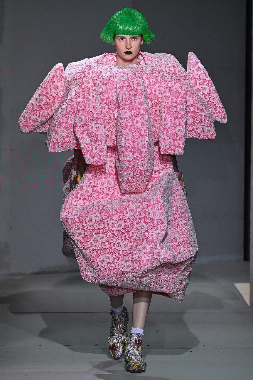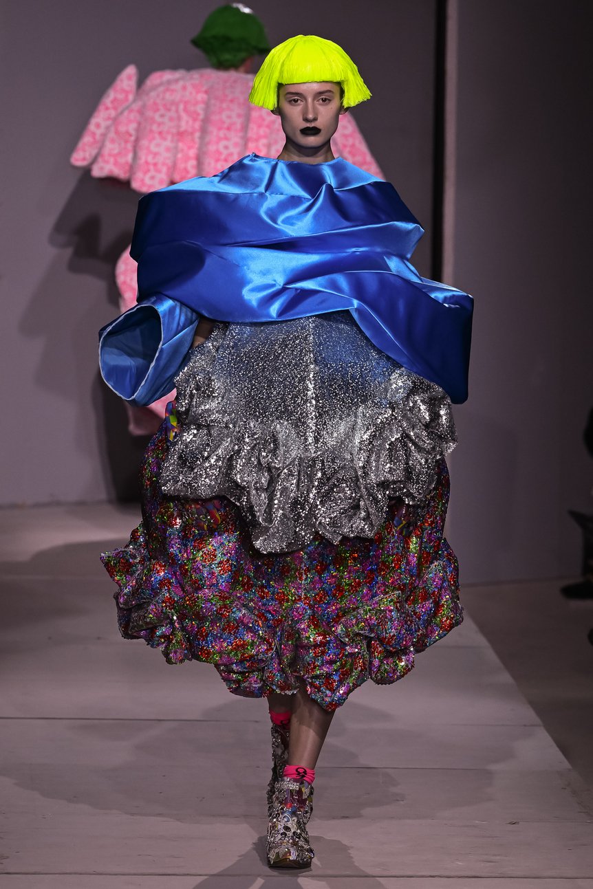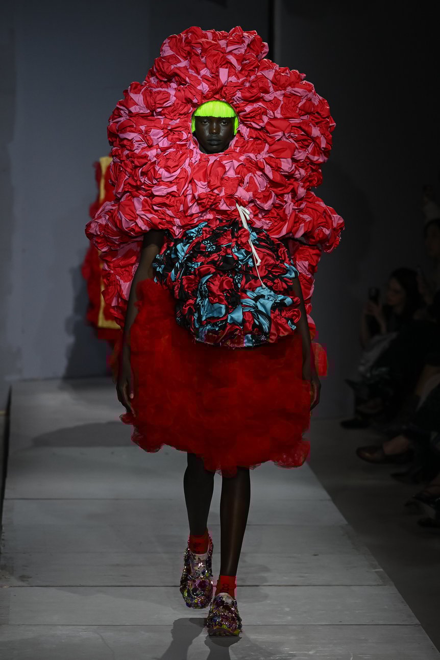 型破りでいびつな球根のような形状に、幾何学プリントやタータンチェック、ギピュールレースに肖像画、様々な花柄プリントとネオンのようなコバルトブルーやバブルガムピンク、赤などのヴィヴィッドな色の衝突はエネルギーに満ち溢れ、憂鬱な現状から解放される自由さを感じる。ファッション業界があらゆる場所でクリエイティビティを淘汰しようとしているように見える今の退屈な時代において、改めて純粋に、束縛のないファッションの喜びと、表現することの素晴らしさを噛み締められるコレクションだ。