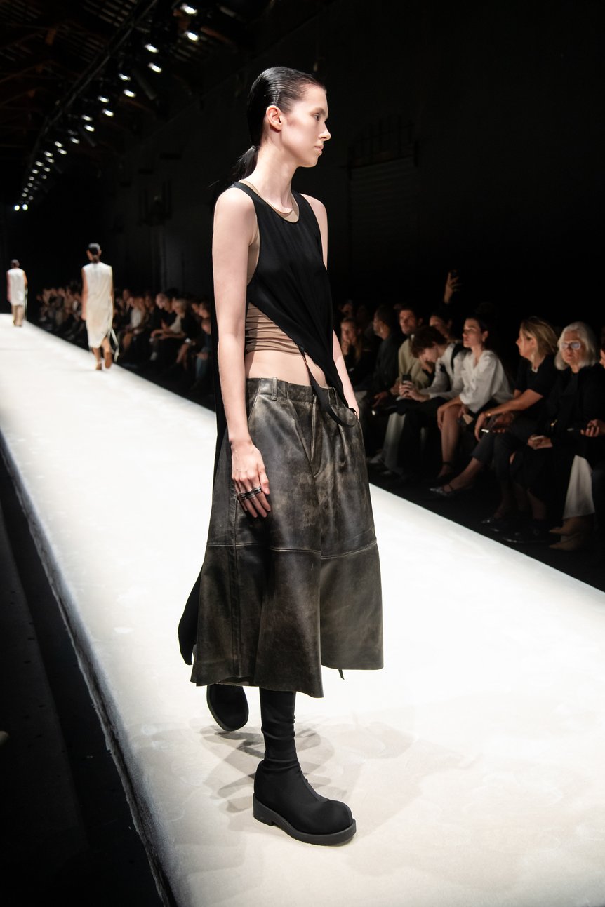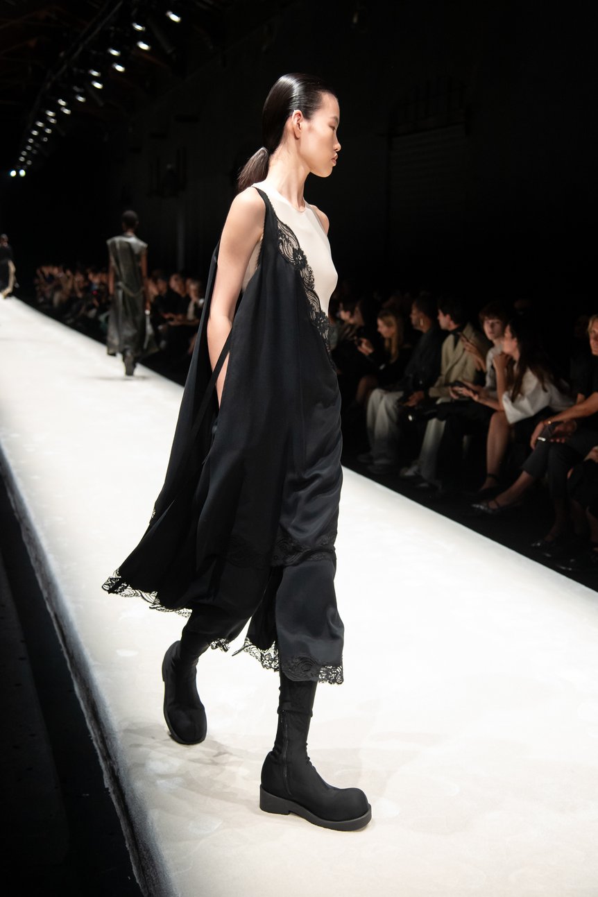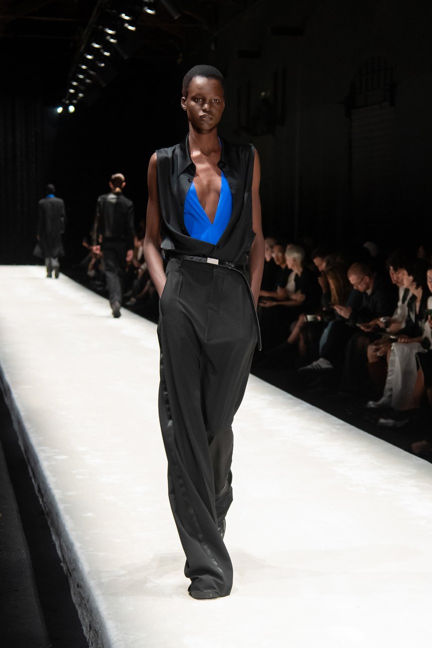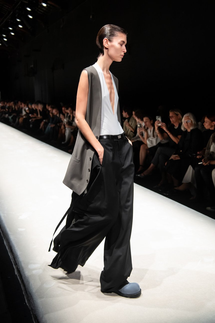 みぞおちのあたりまで深く切り込んだVネックのトップやノースリーブの長いジャケット、裾を引きずるまで長く伸びたパンツに、メンズモデルが着用していた敢えて結ばずに首にかけたネクタイ、そして袖のないロングTシャツなど、柔らかい素材で作られた垂直で細長いシルエットが特徴。