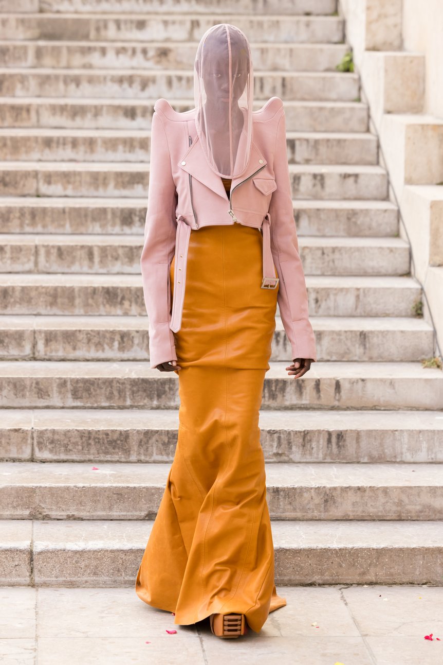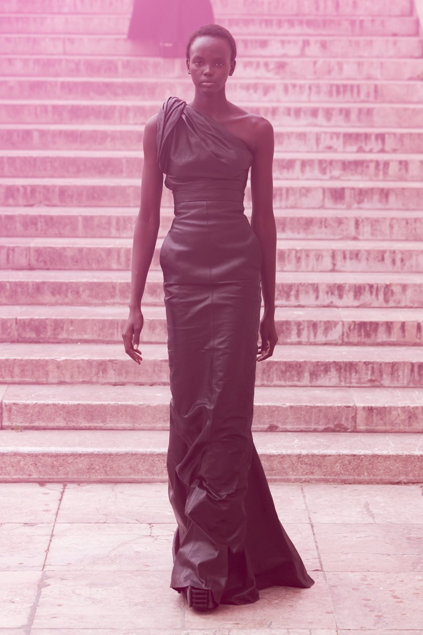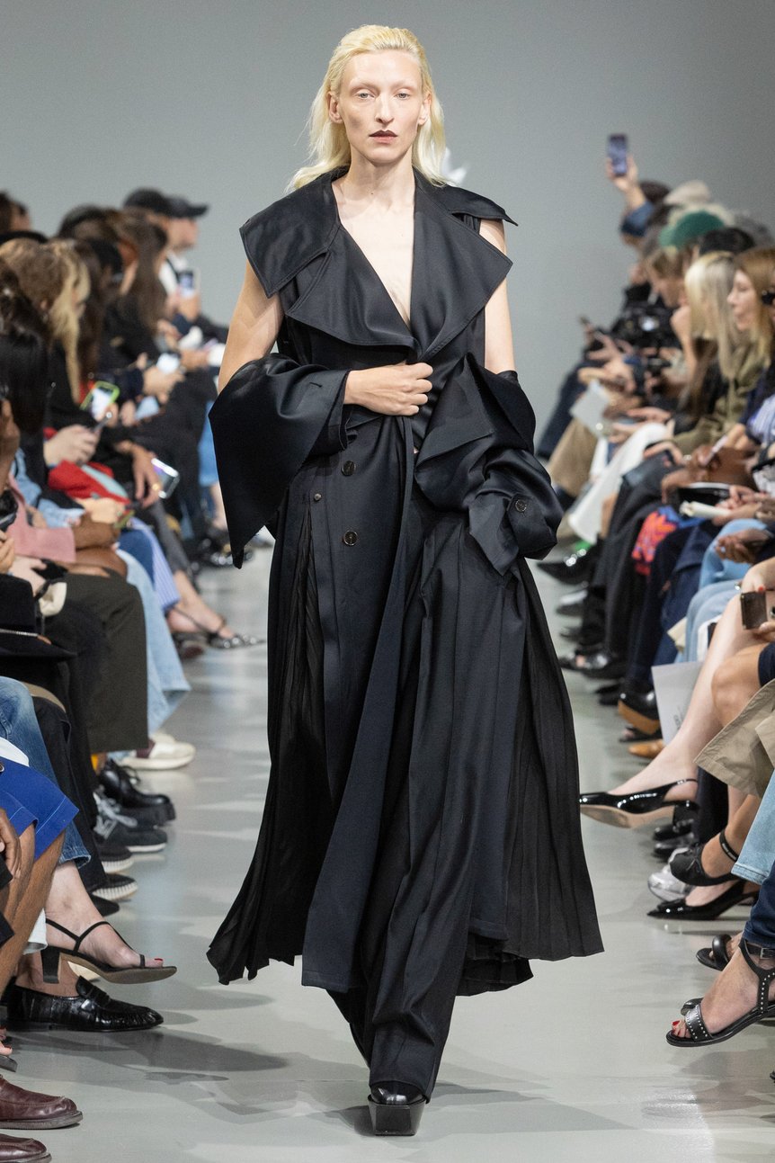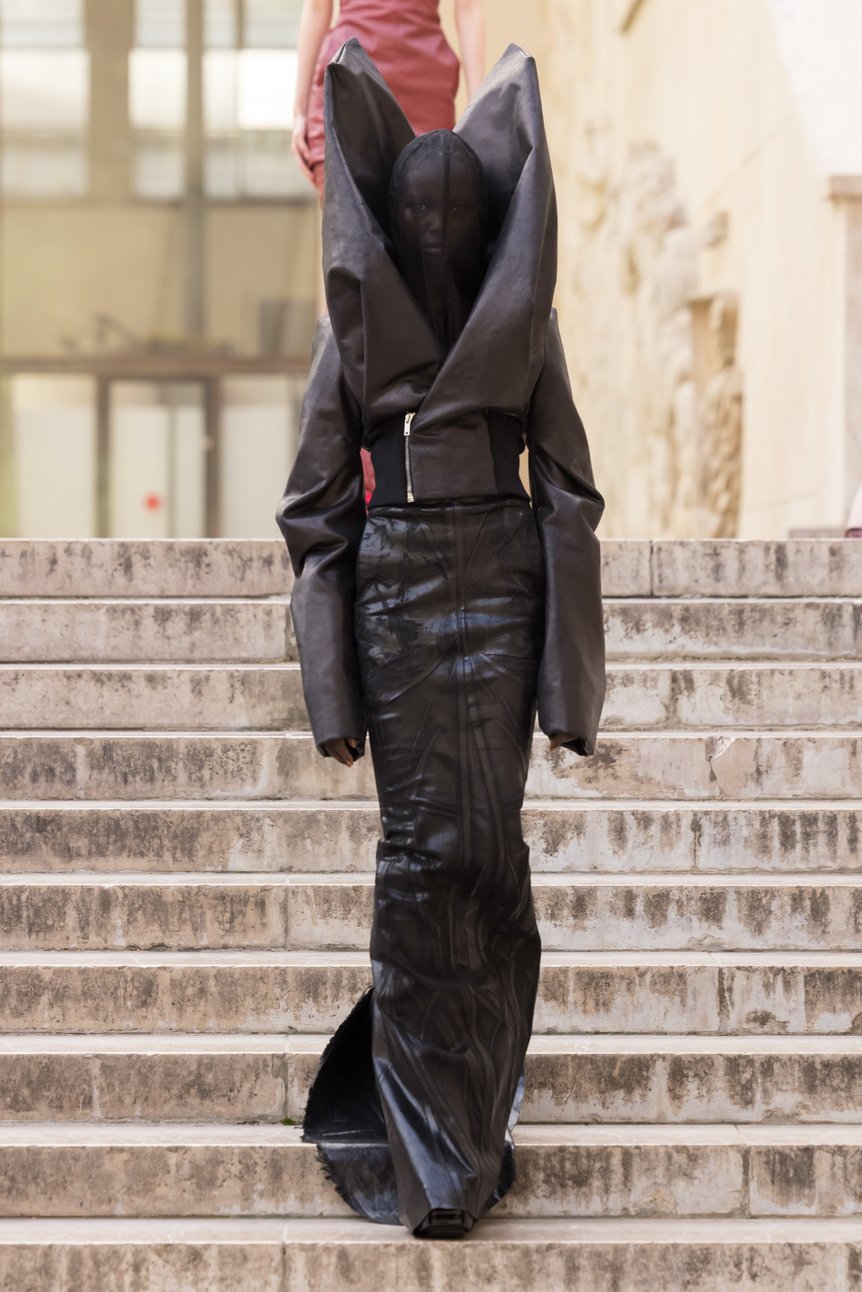 アイスランドのアーティスト、ビョーク(Björk)のライブに行って得た喜びが今シーズンの主なインスピレーション源になったというリック。いつにも増して肩がぐんと上に突き出していて、まるで昆虫、戦闘ロボットあるいはSFのようなショルダーパッドが特徴的。
