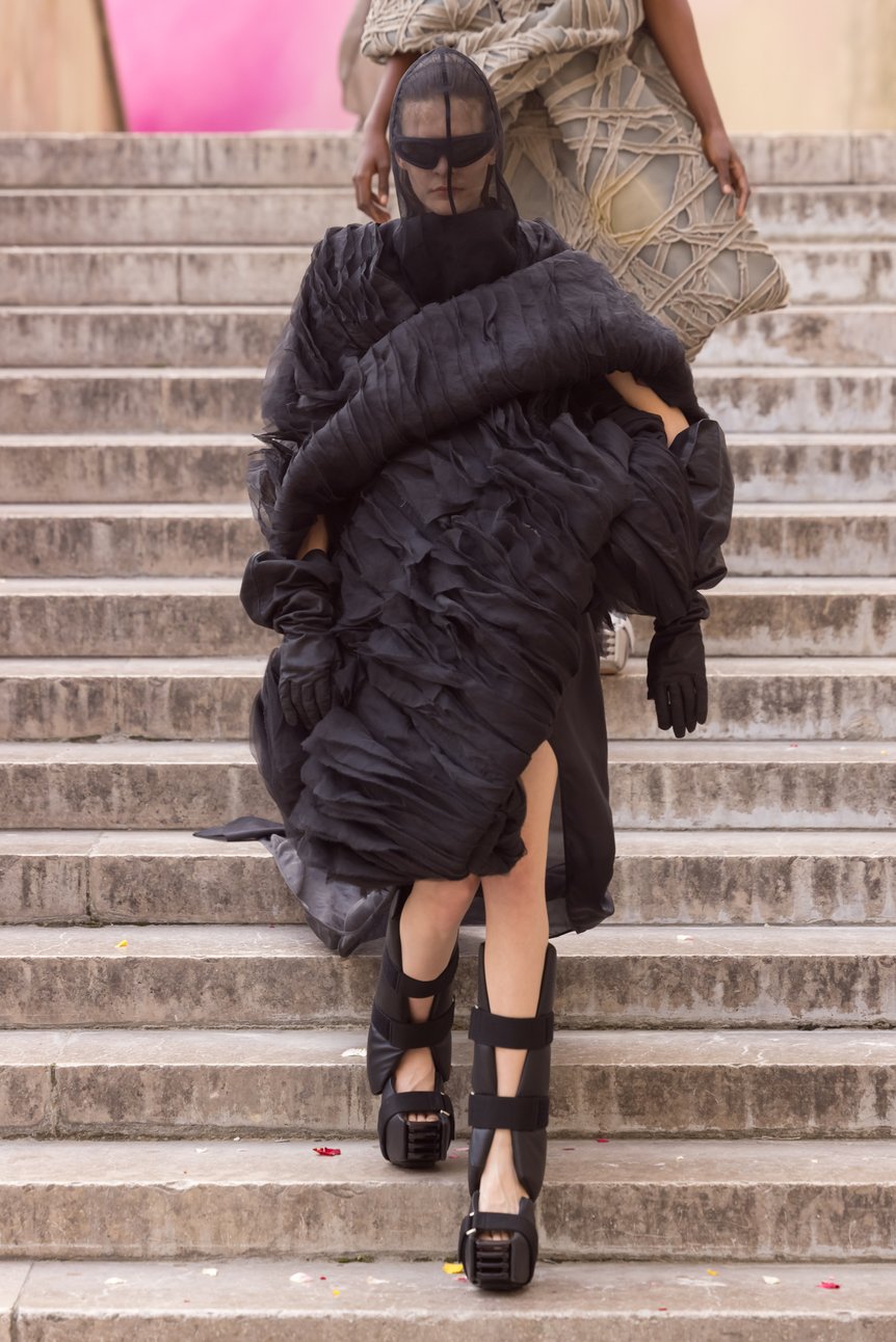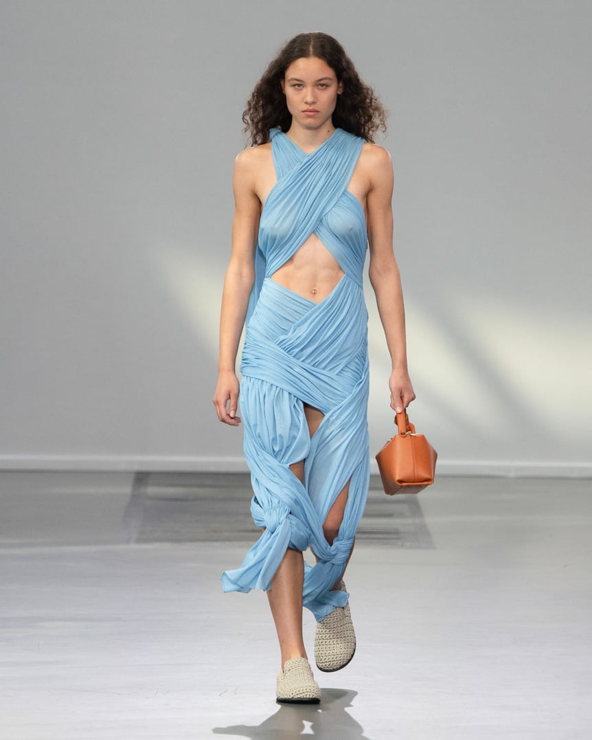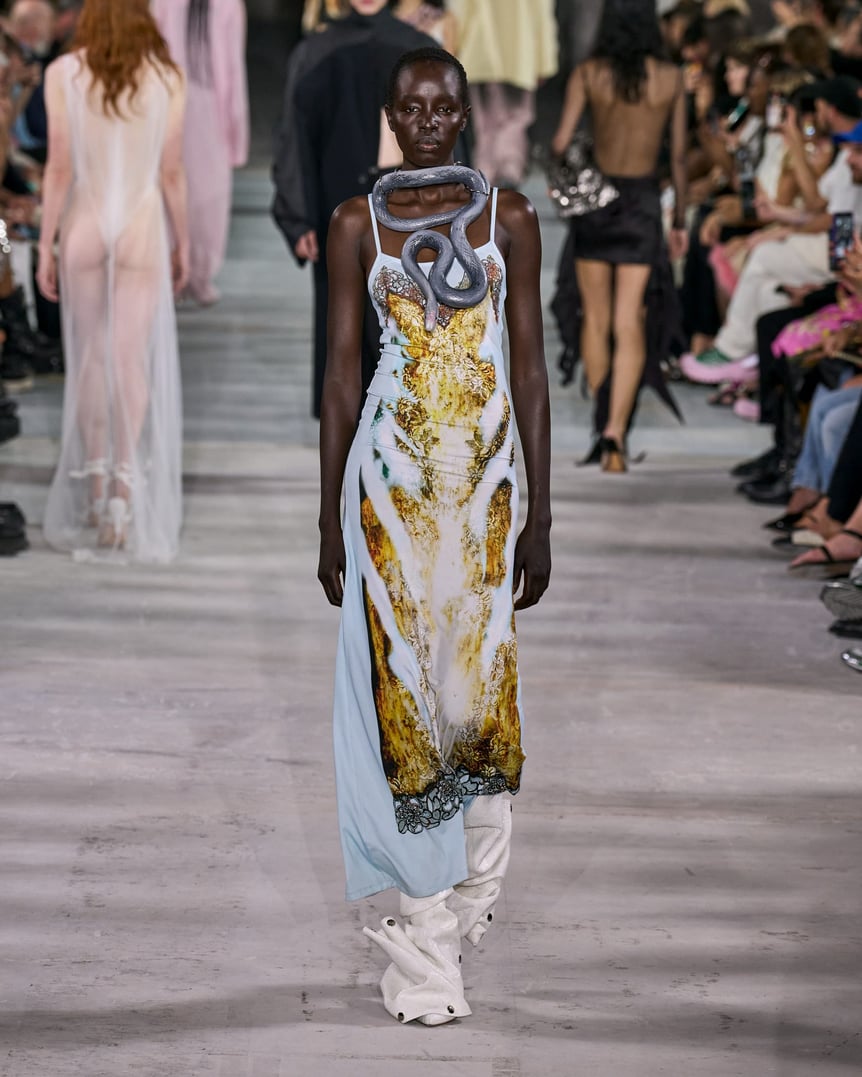 ワードローブには、片側に非常に長いスリットや完全に開いたサイドシームがあるものが多く、そこには長い紐(リボン)が取り付けてあり、着ている人の動作によって服のドレープの形が変化していく。ジェスチャーが衣服をどう定義できるかを探究する試みだ。ここ最近続いていた熱波を表現するためにキャンドルが溶け出したようなトップスやアクセサリーも登場し、温暖化に対する警告も忘れない。