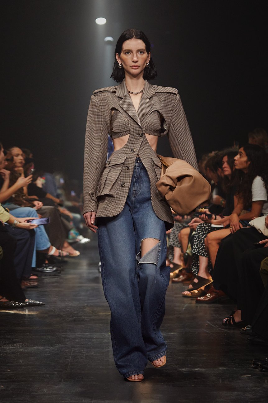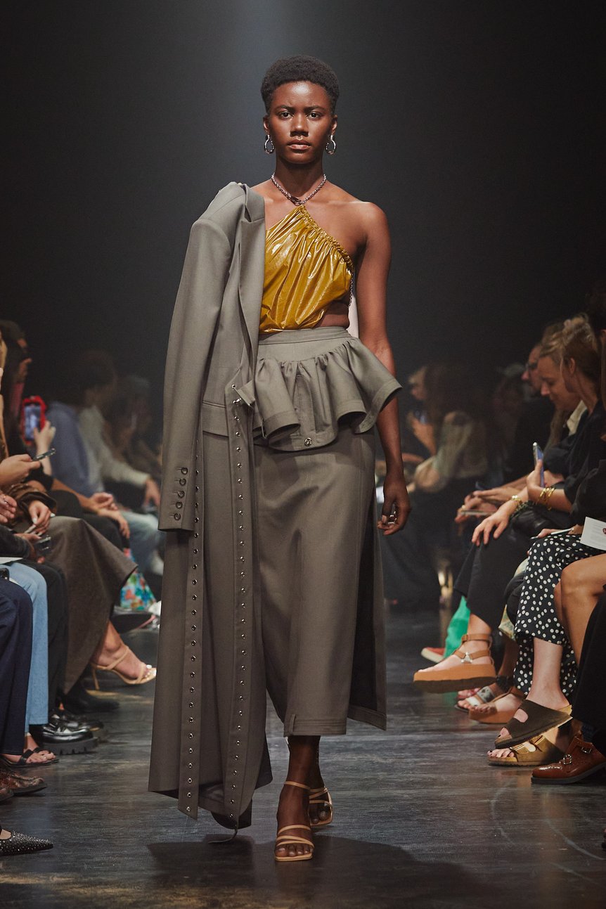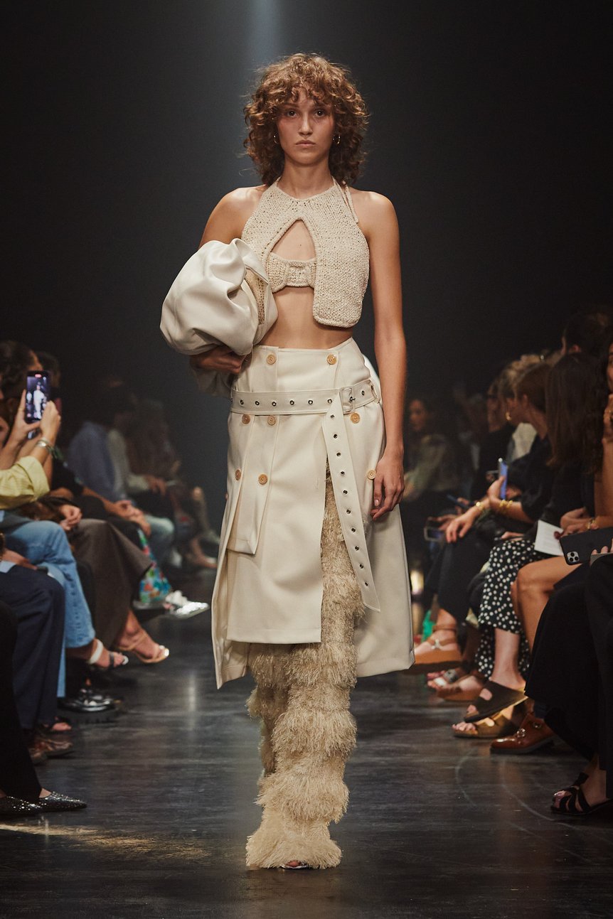 ワードローブには、片側に非常に長いスリットや完全に開いたサイドシームがあるものが多く、そこには長い紐(リボン)が取り付けてあり、着ている人の動作によって服のドレープの形が変化していく。ジェスチャーが衣服をどう定義できるかを探究する試みだ。ここ最近続いていた熱波を表現するためにキャンドルが溶け出したようなトップスやアクセサリーも登場し、温暖化に対する警告も忘れない。