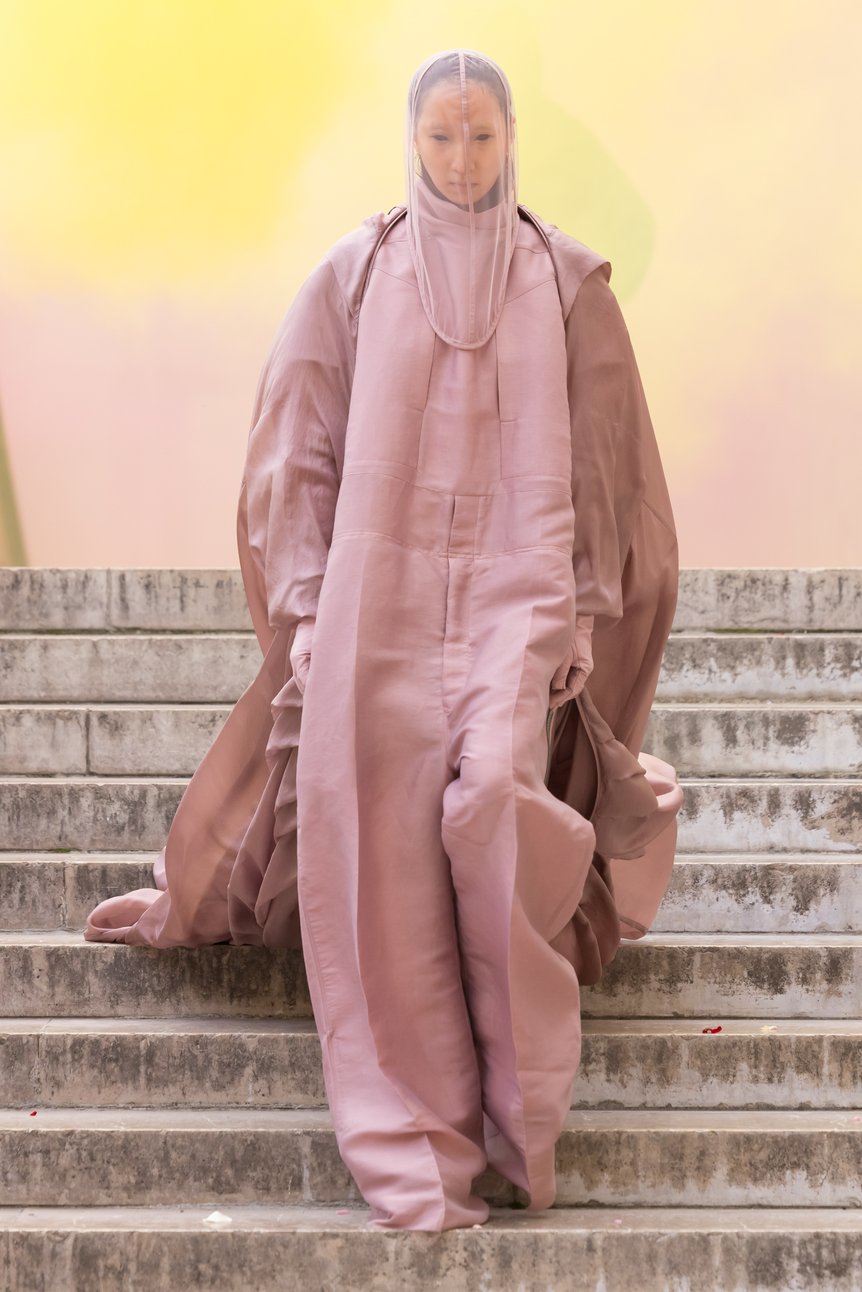 防護服を思い起こさせるジャンプスーツにはパラシュートのようなマントのような柔らかい大きな布が付いていて、モデルが動くたびに風をはらませて大きく膨らむ。シアーなベールのような被り物とモデルが付けている黒いコンタクトが怪しげで、現代の不確実な、不安な世の中を象徴しながらも、それに打ち勝つ喜びと希望が見えてくるようなコレクションだった。
