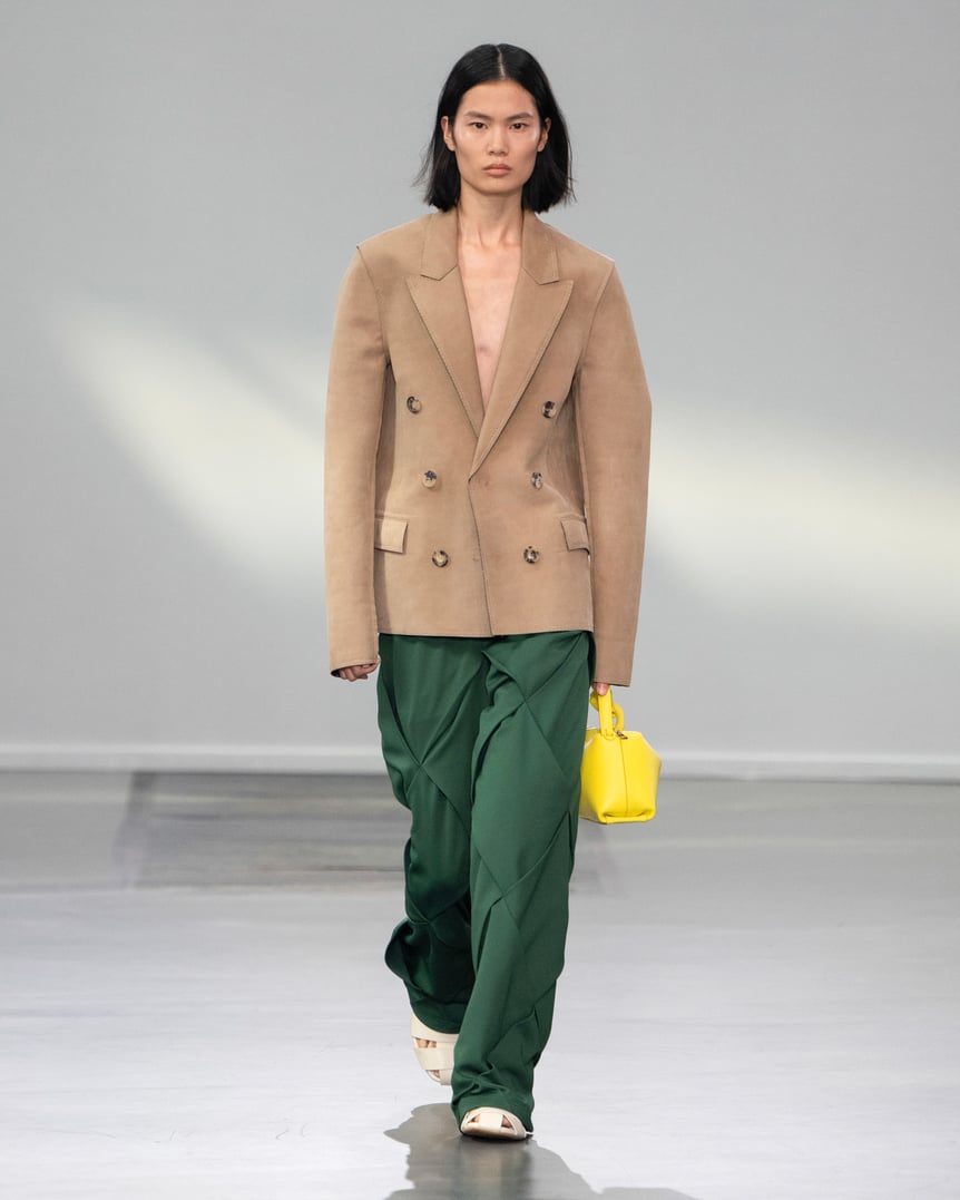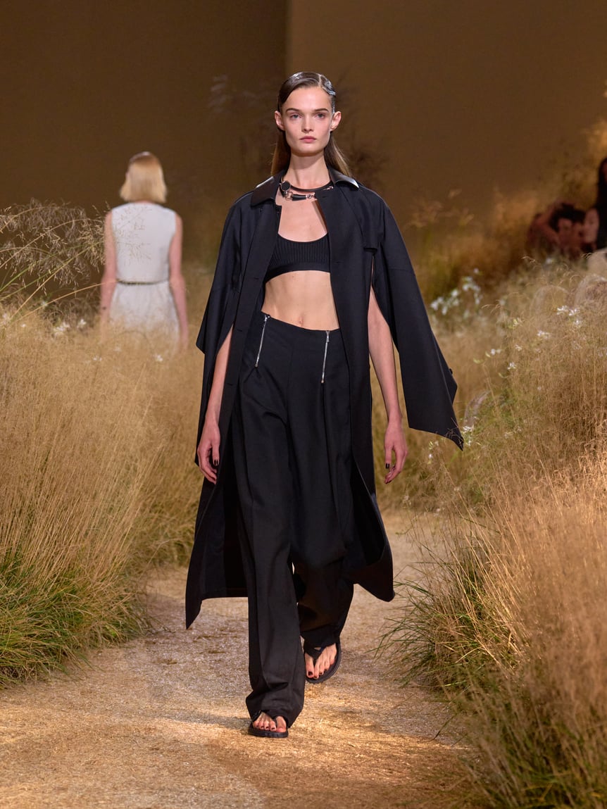 面白いなと思ったのが、ブラトップとウエスト部分とボトム部分が3分割されたニット。それぞれ端のプラケットにボタンとボタンホールが施され、着る人の好きなように「ワンピース」としても「トップ&ボトム」としても、そして「スラッシュ開きの肌見せドレス」としても着られる。コレクションでは、様々なカラーとネックラインで展開されている。2024年メンズシーズンから台頭し始め、今シーズンブレイク中のトレンド「クワイエット ラグジュアリー」を地でいく、エルメスの真骨頂が存分に発揮されたコレクションだった。