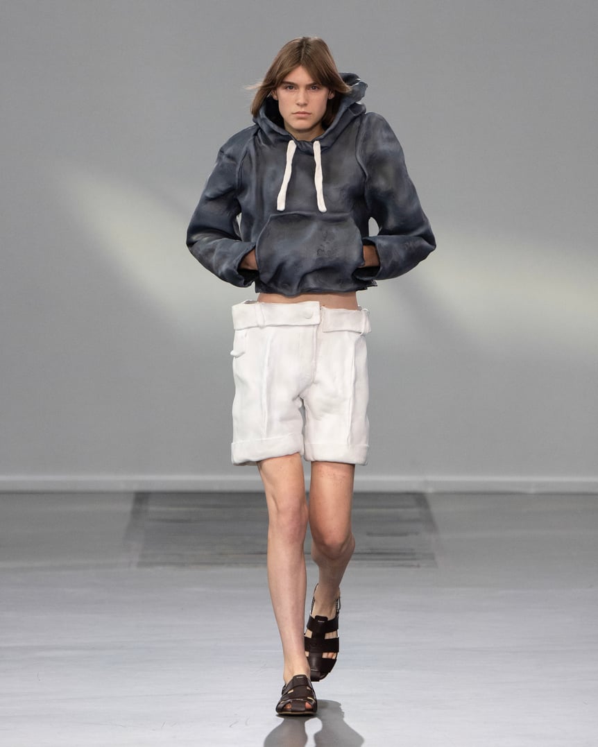 JW アンダーソンの今シーズンのテーマは「実用性の中に遊び心を、そして遊びの中に実用性を」。ファーストルックは、英国の人気クレイ・アニメ『ひつじのショーン』や『ウォレスとグルミット』などのいわゆるストップモーション・アニメのキャラクターを制作する時に使用する「プラスティシン(Plasticine)」という粘土を素材として使ったフーディとショートパンツにサンダルを組み合わせたスタイル。よく見ると肩や腰が浮いた状態になっており、まるで無邪気な子供が粘土遊びで作った人形のようなユーモラスな雰囲気のあるスタイルだ。