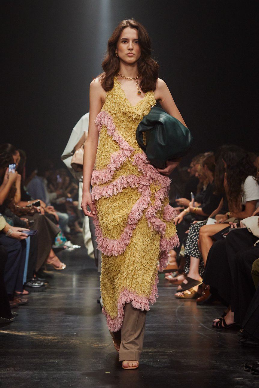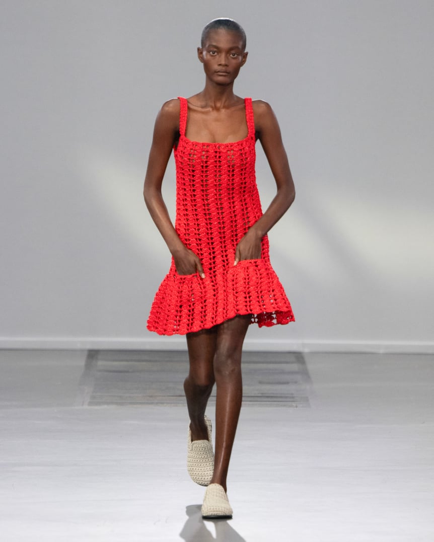 他にも、カラフルなビニール袋に空気をパンパンに入れて口を閉じたようなTシャツとパンツの組み合わせや、フラフープのような輪がボトム部分に組み込まれたドレス、ドレープの生地で作られたフーディと細い帯丈のラメ生地を粗く無造作に織り込んで作ったスカートの組み合わせなど、一見すると日常的なシンプルなアイテムが、ジョナサンの魔法にかかると奇妙な形にどんどん変化していく。毎シーズン新しい素材や手法で楽しませてくれるジョナサン・アンダーソン(Jonathan Anderson)、もう次のコレクションが楽しみで仕方がない。