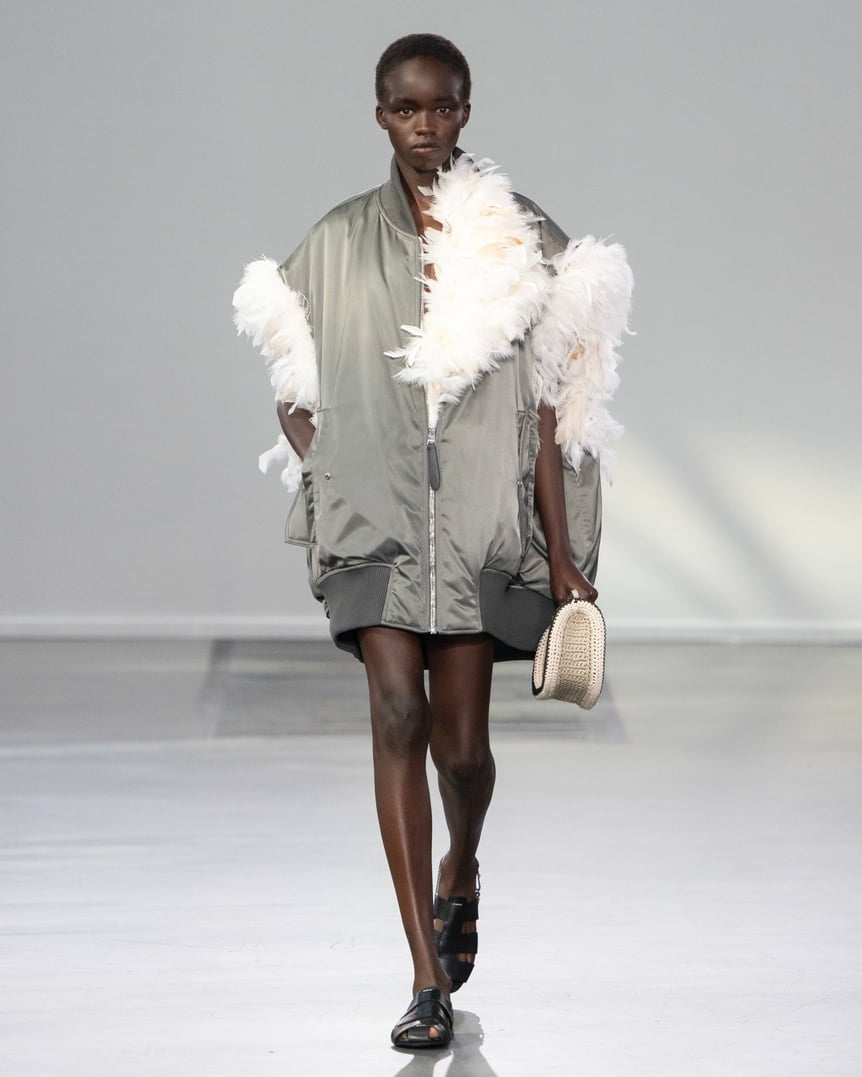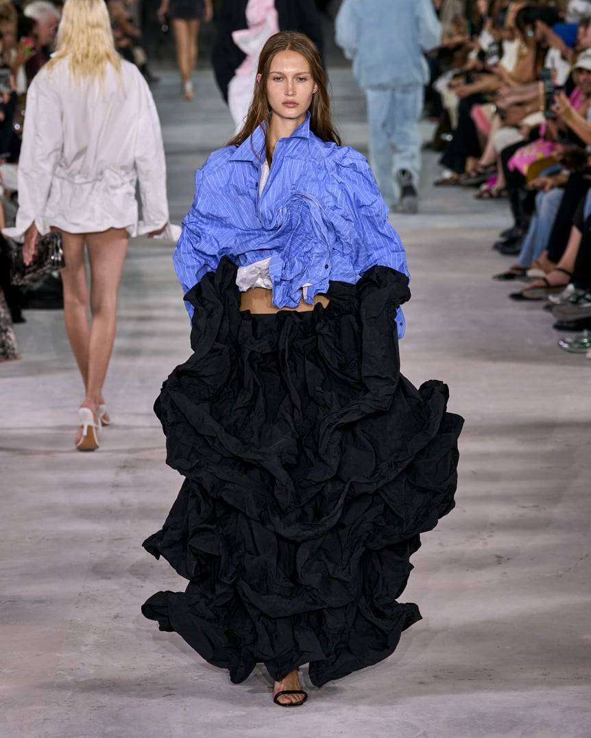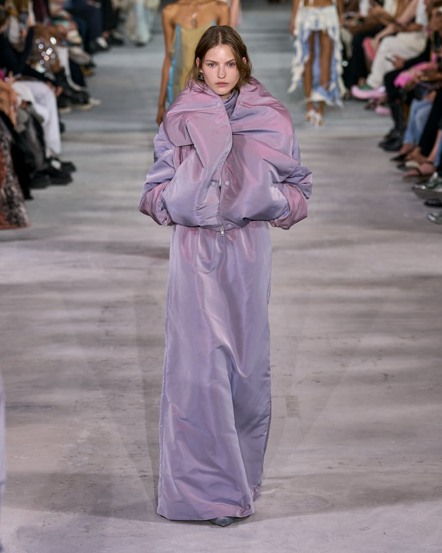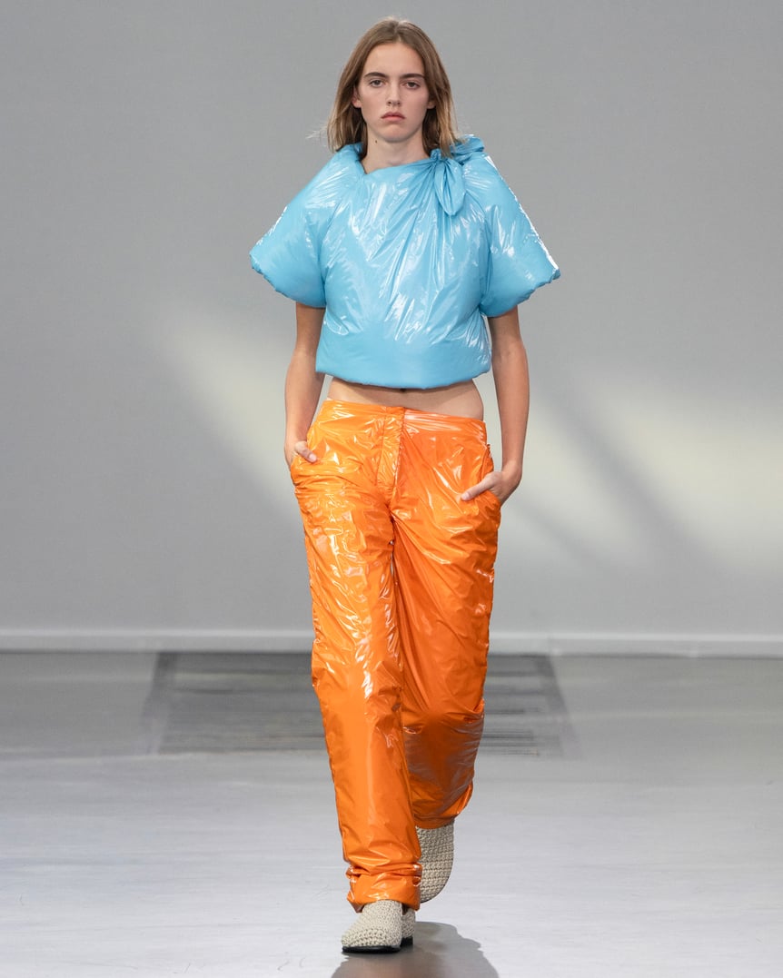 丸みを帯びて立体的に裁断されたローエッジのブレザーや大きく平織されたパンツ、かぎ針編みのミニドレスや、ダウンの羽毛が飛び出したかのようなオーバーサイズのボマージャケット、フードがついたバイカージャケットやカーゴパンツ、そして包帯のような細長い布をドレープしたドレスなど、原型となっているのは若者が普段身につけている服。それらを膨らませたり、結んだり、編んだり、広げたり、曲げたりしながら、ユニークで新しいボリュームを作り出している。