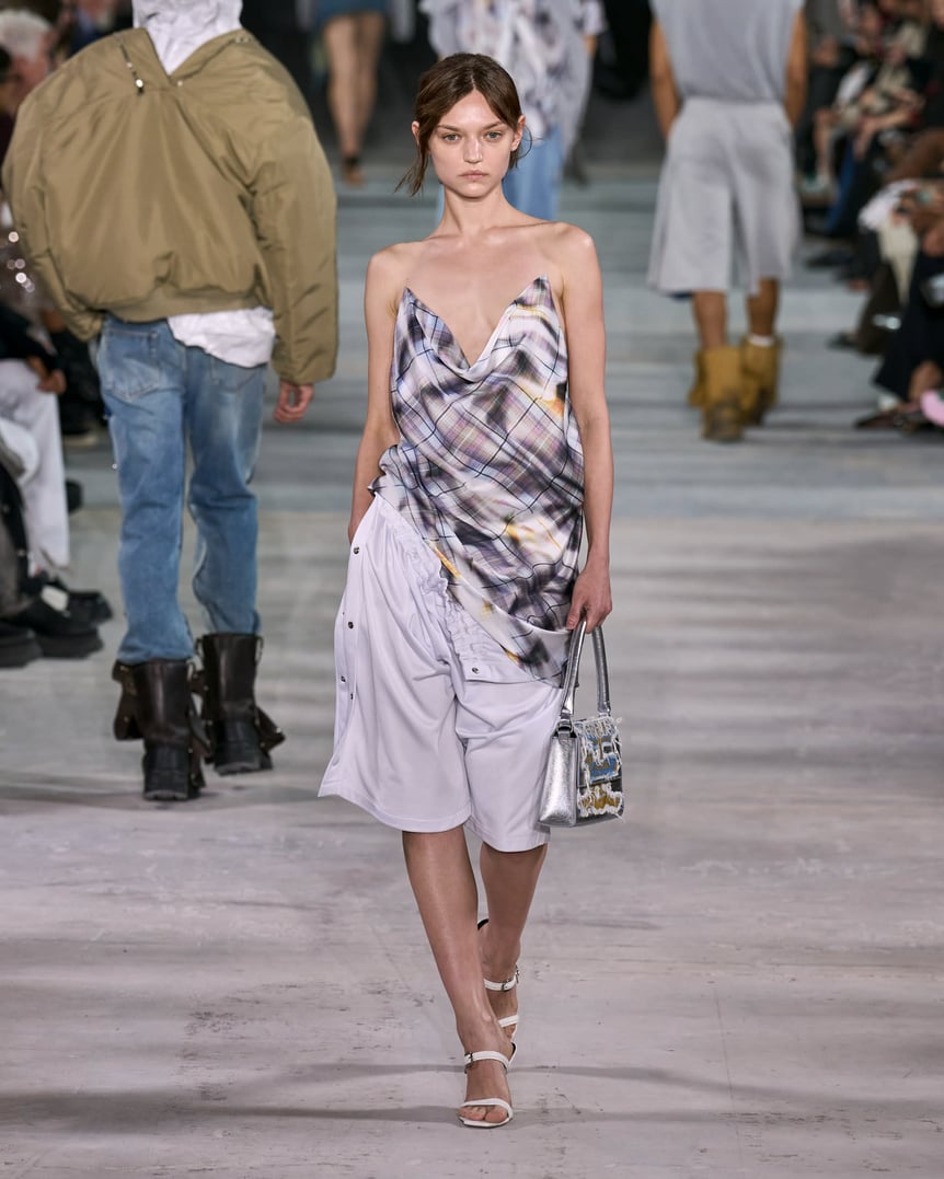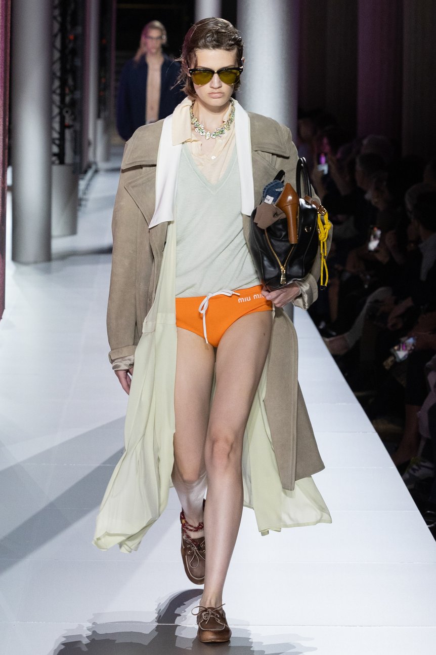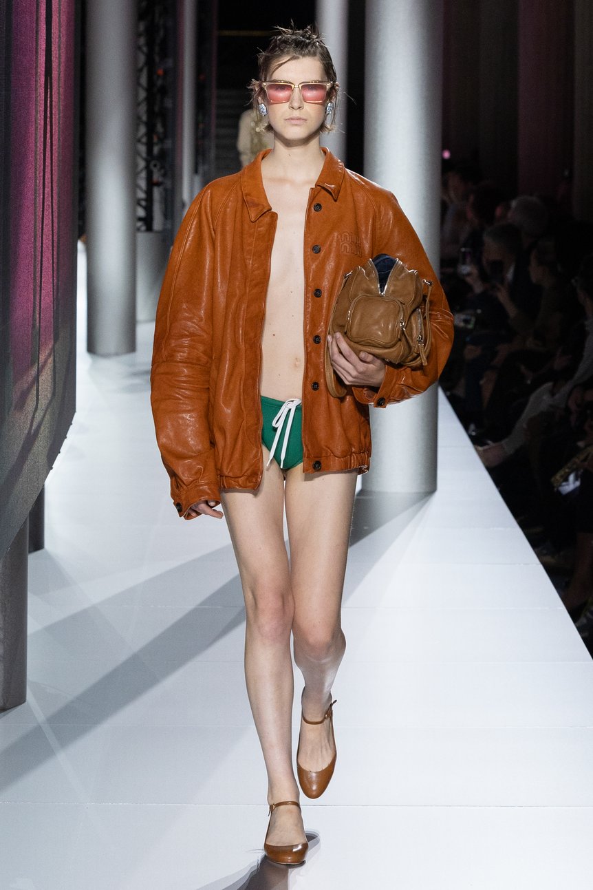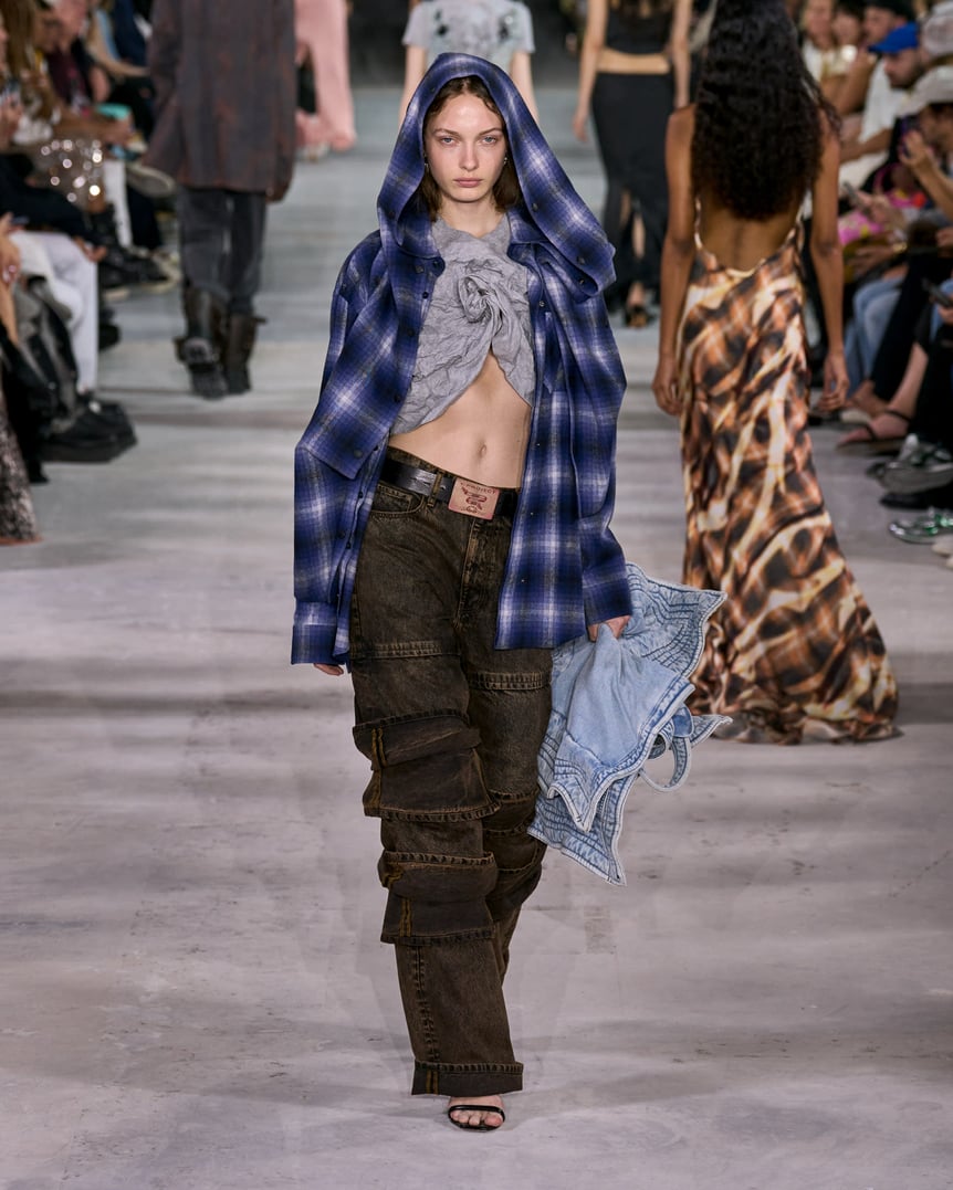 実用的な服と好きな服を、取り敢えずクローゼットから引っ張り出して着たかのようなラフさ。エンブレムジャケットやポロシャツ、オックスフォードシャツ、トレンチコートやVネックセーターなどのプレッピースタイルと、90年代風の色褪せたレザージャケットやコートに太いベルト、ゴールドラメのブロカード素材で出来たクチュール的アイテムに、フリルやネグリジェの柔らかなシルエット、トラックスーツなどのスポーツアイテム。そしてボトムは、前シーズンの流れを汲んだアンダーウェアスタイルをはじめ、ローライズやマイクロミニが目立つ。一見するとテイストがバラバラのアイテムを、絶妙なバランスのスタイリングで見事にまとめ上げた。