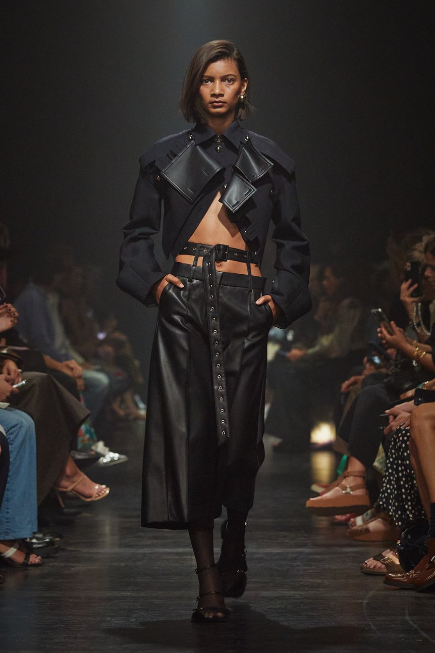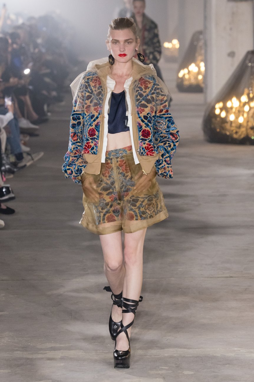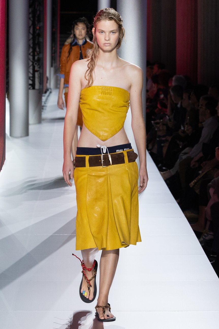 実用的な服と好きな服を、取り敢えずクローゼットから引っ張り出して着たかのようなラフさ。エンブレムジャケットやポロシャツ、オックスフォードシャツ、トレンチコートやVネックセーターなどのプレッピースタイルと、90年代風の色褪せたレザージャケットやコートに太いベルト、ゴールドラメのブロカード素材で出来たクチュール的アイテムに、フリルやネグリジェの柔らかなシルエット、トラックスーツなどのスポーツアイテム。そしてボトムは、前シーズンの流れを汲んだアンダーウェアスタイルをはじめ、ローライズやマイクロミニが目立つ。一見するとテイストがバラバラのアイテムを、絶妙なバランスのスタイリングで見事にまとめ上げた。