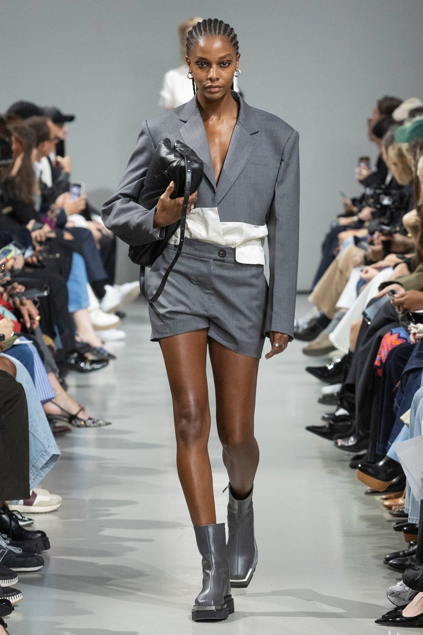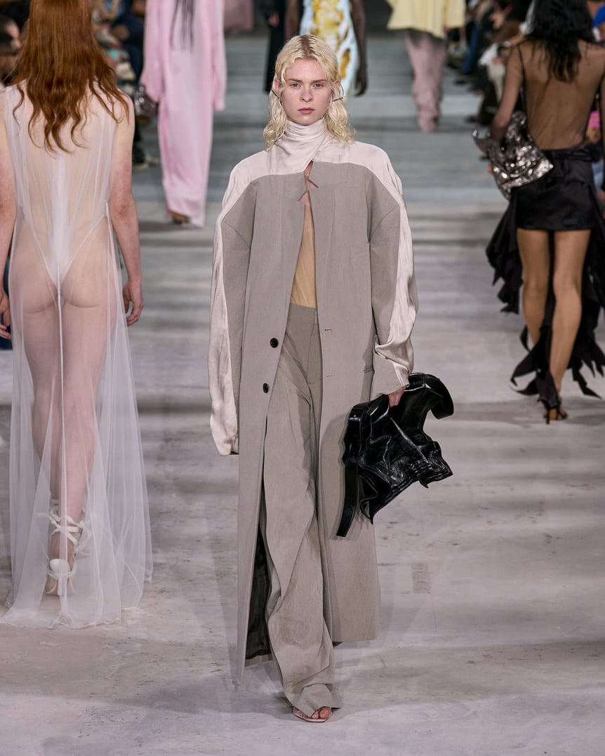 2023年9月にミラノで行われたエムエム6 メゾン マルジェラのランウェイショー。今シーズンは「抽象化」と「簡潔さ」をテーマに、肉屋の伝統的なエプロンやオフィススーツなど労働者の実用的な仕事着の原型と、手の簡素な動きを用いながら、結果的にアイデアを最も先鋭的なところにまで発展させることを本質としてコレクションが作られた。