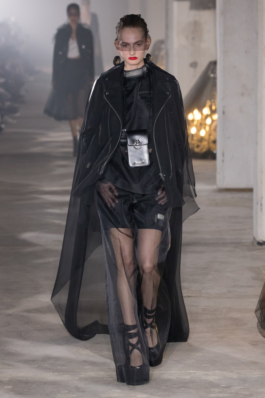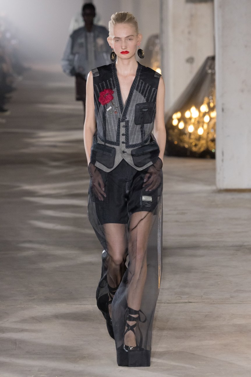 ランジェリーのレースやチェック柄のトロンプ・ルイユのプリントをはじめ、螺旋状にねじられたアイテムの数々や洗濯機から取り出したばかりのようなシワだらけでボリュームのあるストライプシャツ、黒のティアードスカート、フード付きの彫刻のようなロングドレス、スラッシュ部分のスナップやカギホックのとめ方、ファスナーの閉め方で着る人が自由に形を決められるボトムスにコートにMA-1、そしてリアルでおどろおどろしい蛇のネックレスなど。テーマであるゴシック建築と創世記の物語、そして昔からあるテクニックがダークで壮大な雰囲気を醸し出している。