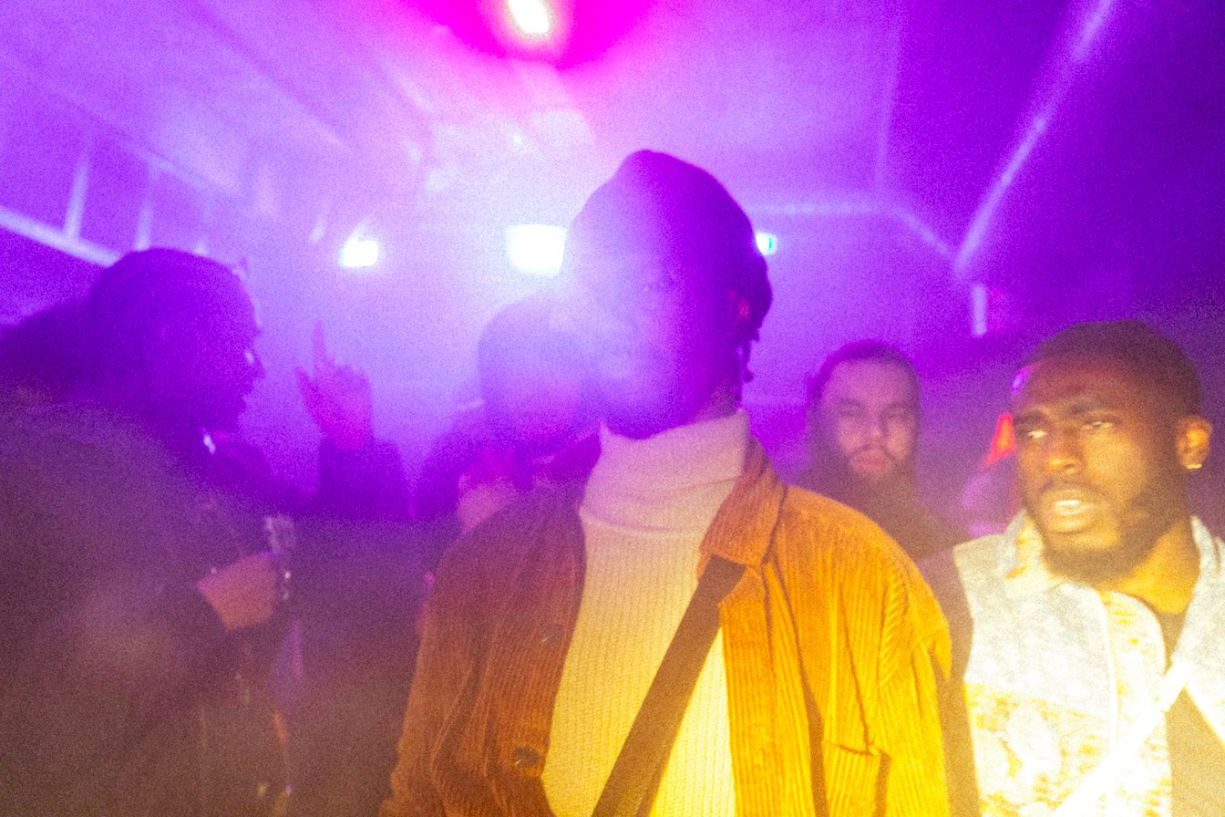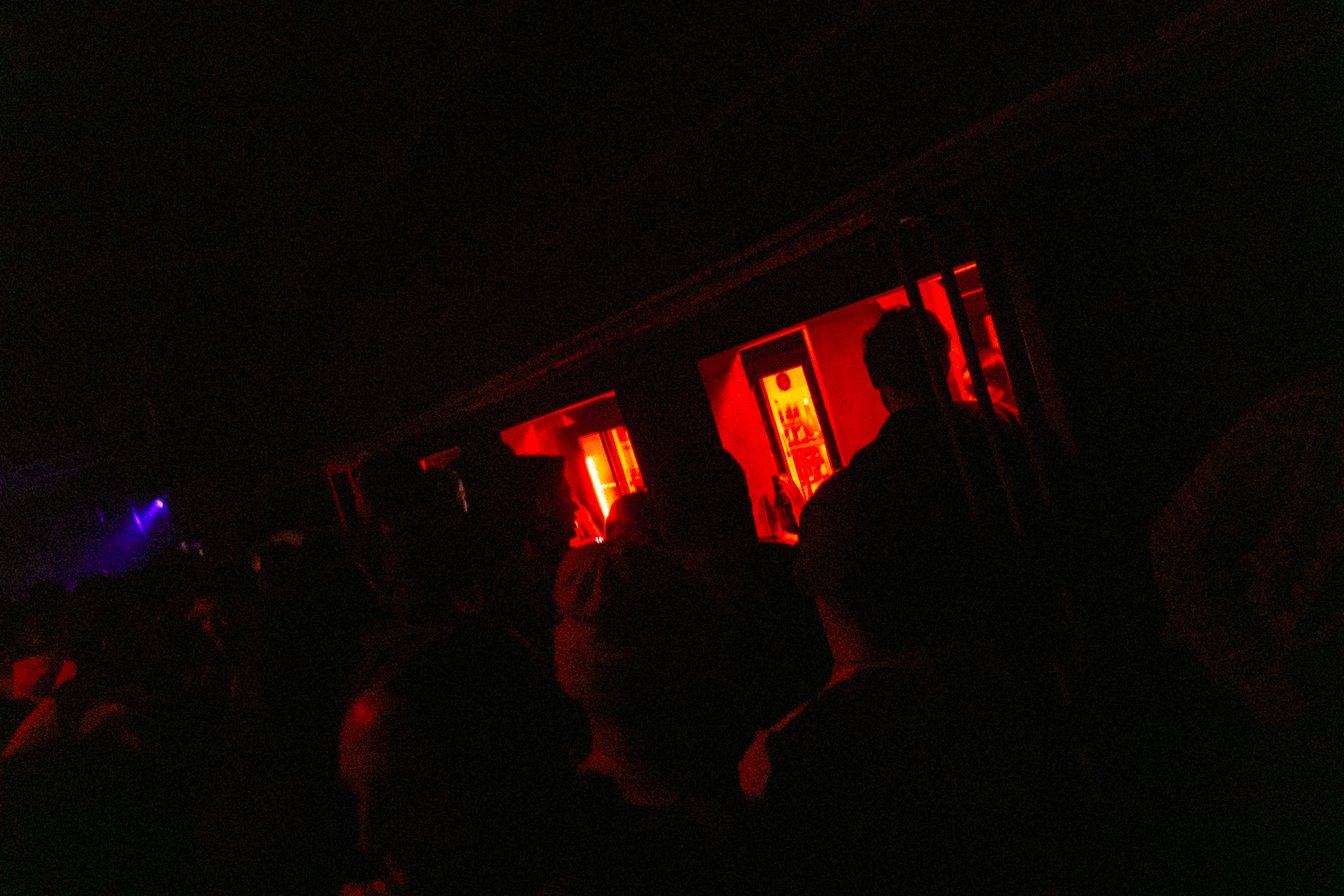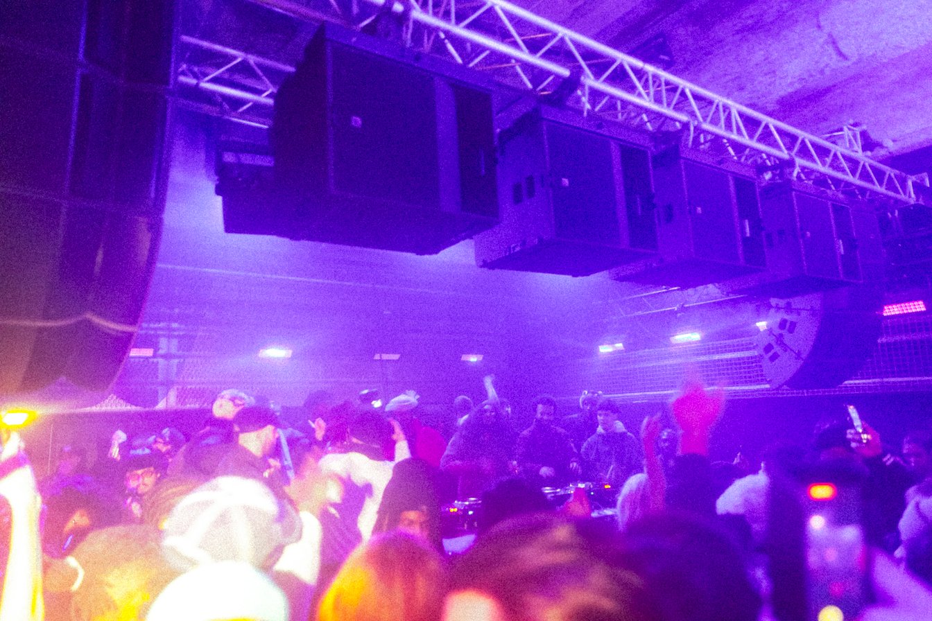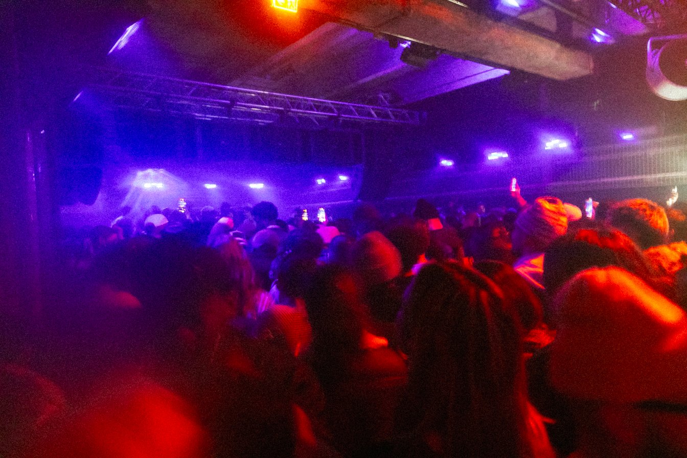 このラウンジエリアを抜けると前方に広がるのが、最大1000人を収容するメインフロアだ。99ジンジャーと友人の面々は、当然の如くキャパオーバーしたフロアなどお構いなしに、アフロビートからハードテクノ、ドラムンベース、ジャズファンク、USヒップホップまで、多様なジャンルを大胆かつ軽快によどみなく繋げ、来場者たちにスマホを掲げる隙も与えないほど踊らせる。そのエネルギーに満ち溢れた様子は、以下の写真に目を通すだけで伝わるはずだが、「フォトグラファーのカメラのレンズに結露が生じていた」と聞けば、ヒートアップ具合がより想像しやすいだろう。